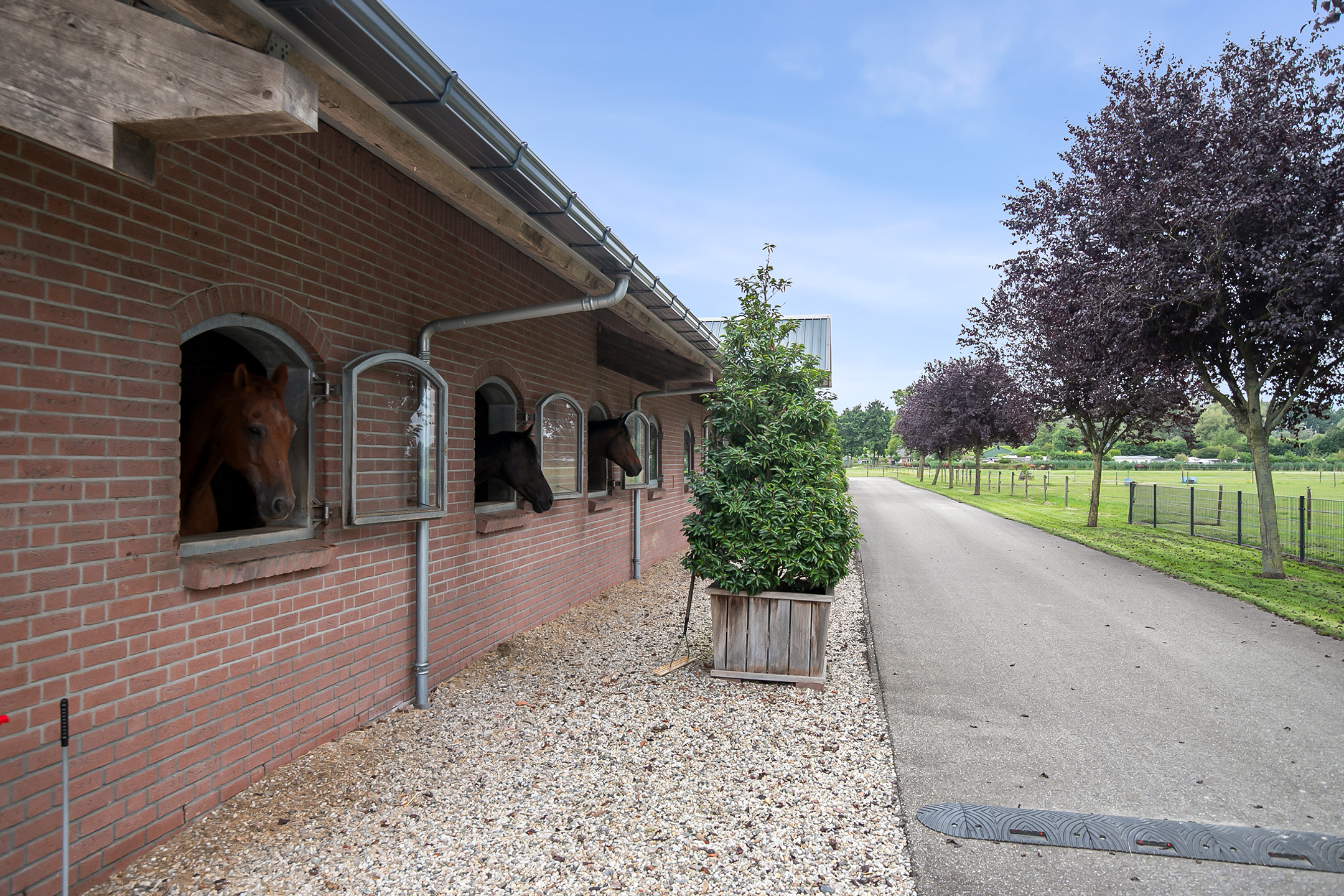 The riding hall is built of masonry facades with rafters. A skylight in the ridge and above the stables provides plenty of natural light. French doors in the front facade provide access.