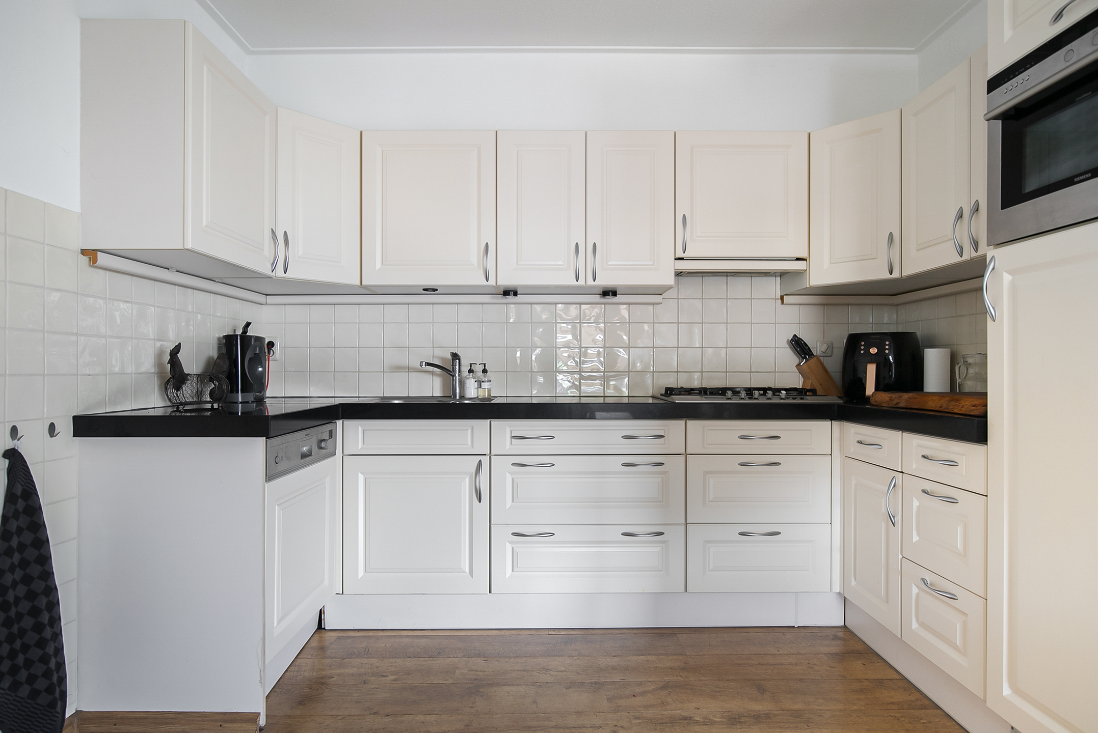 The master bedroom is equipped with a practical closet and air conditioning. French doors provide access to the roof terrace from here. The fully tiled bathroom is equipped with a bathtub, a bathroom unit with 2 nice washbasins and a walk-in shower. The separate toilet room has a floating toilet and a hand basin.