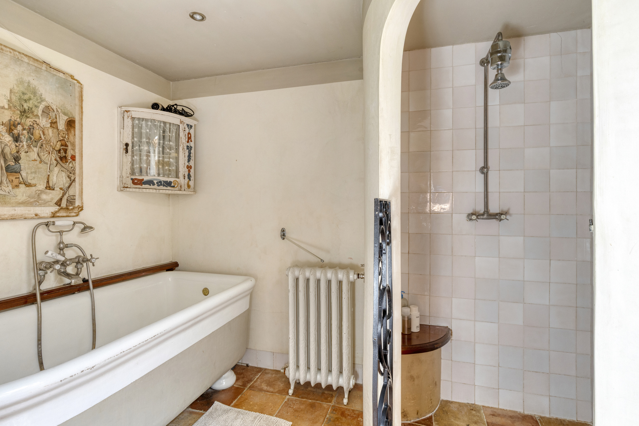 The entrance hall with guest toilet leads into the bright and spacious living room, where warmth and character are immediately apparent. Adjacent is the open-plan kitchen with underfloor heating and French doors to the garden. The kitchen is fully equipped with a 5-burner gas hob, extractor hood, dishwasher, multiple refrigerators and freezers, and a recently installed kitchen unit with two ovens – ideal for entertaining and long dinners.