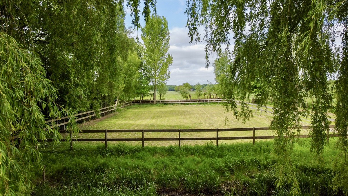 At the end of a long driveway – shared only in part with two other residences – an electric gate opens to reveal your very own slice of paradise. Tucked away behind mature weeping willows lies this charming thatched farmhouse, set on approximately 1.1 hectares of land. With 264 m² of living space and two outbuildings (each approx. 40 m² – a former stable and a barn), this home invites you into a picture-perfect rural dream. The property also features a former outdoor riding arena with lighting.
