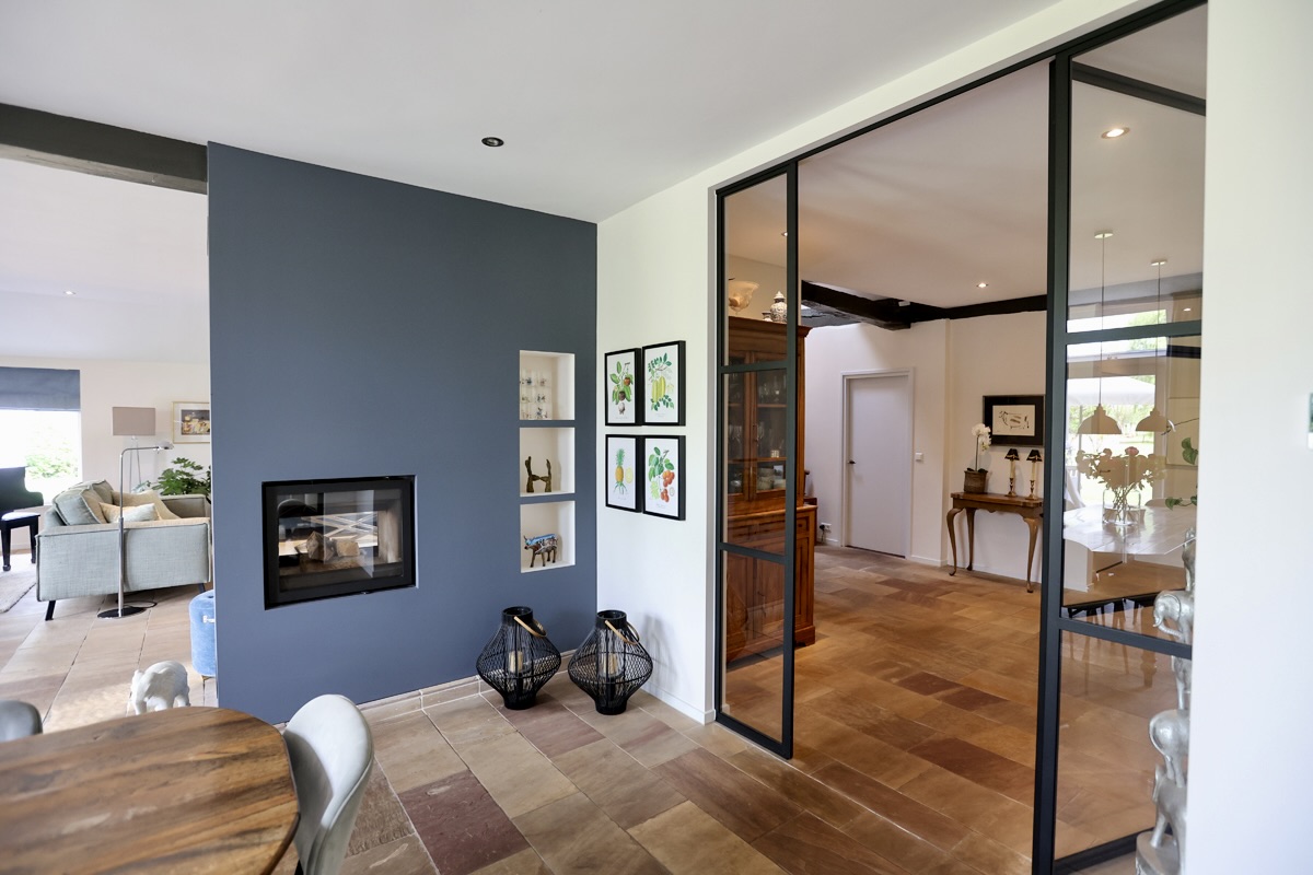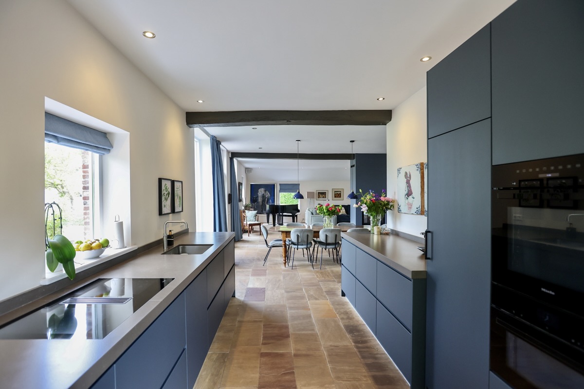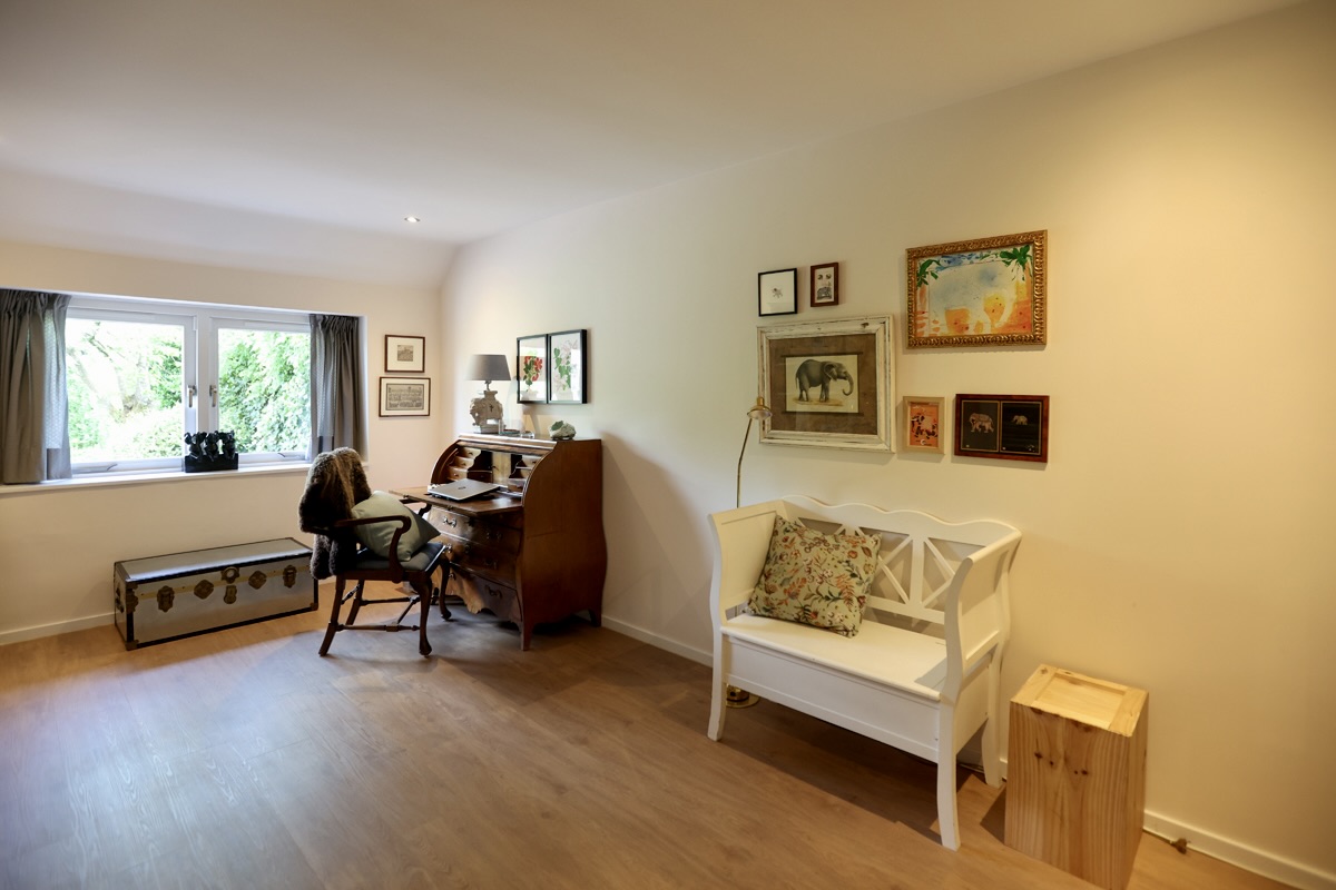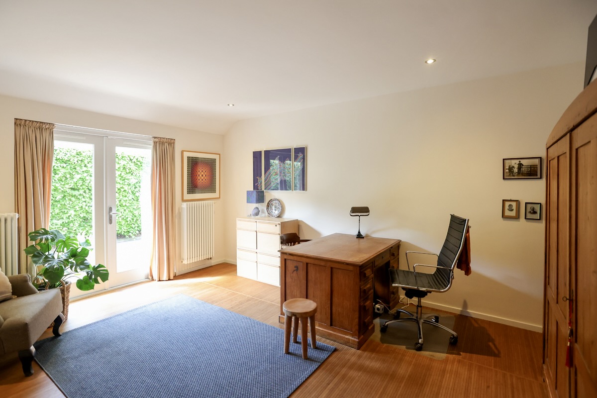 As you move further into the home, the back opens up to a surprisingly large and bright living room, where a fireplace sets the tone for cozy winter evenings. This space flows seamlessly into the dining area and modern open-plan kitchen, fitted with high-quality Miele built-in appliances – together forming the heart of the home with a view of the deep garden and vast landscape beyond. No painting can match the beauty of this view. A nearby utility room offers extra storage and convenience.