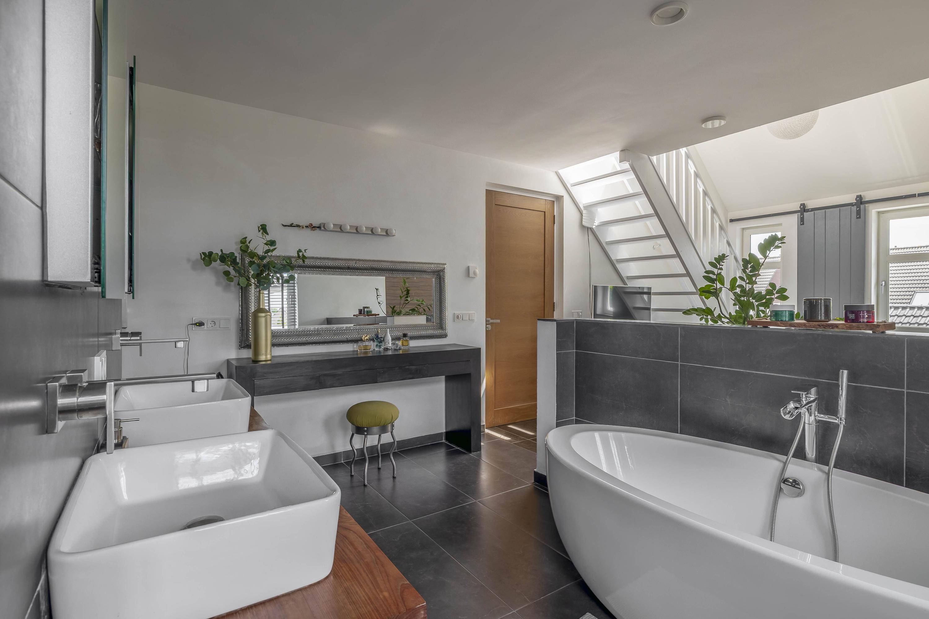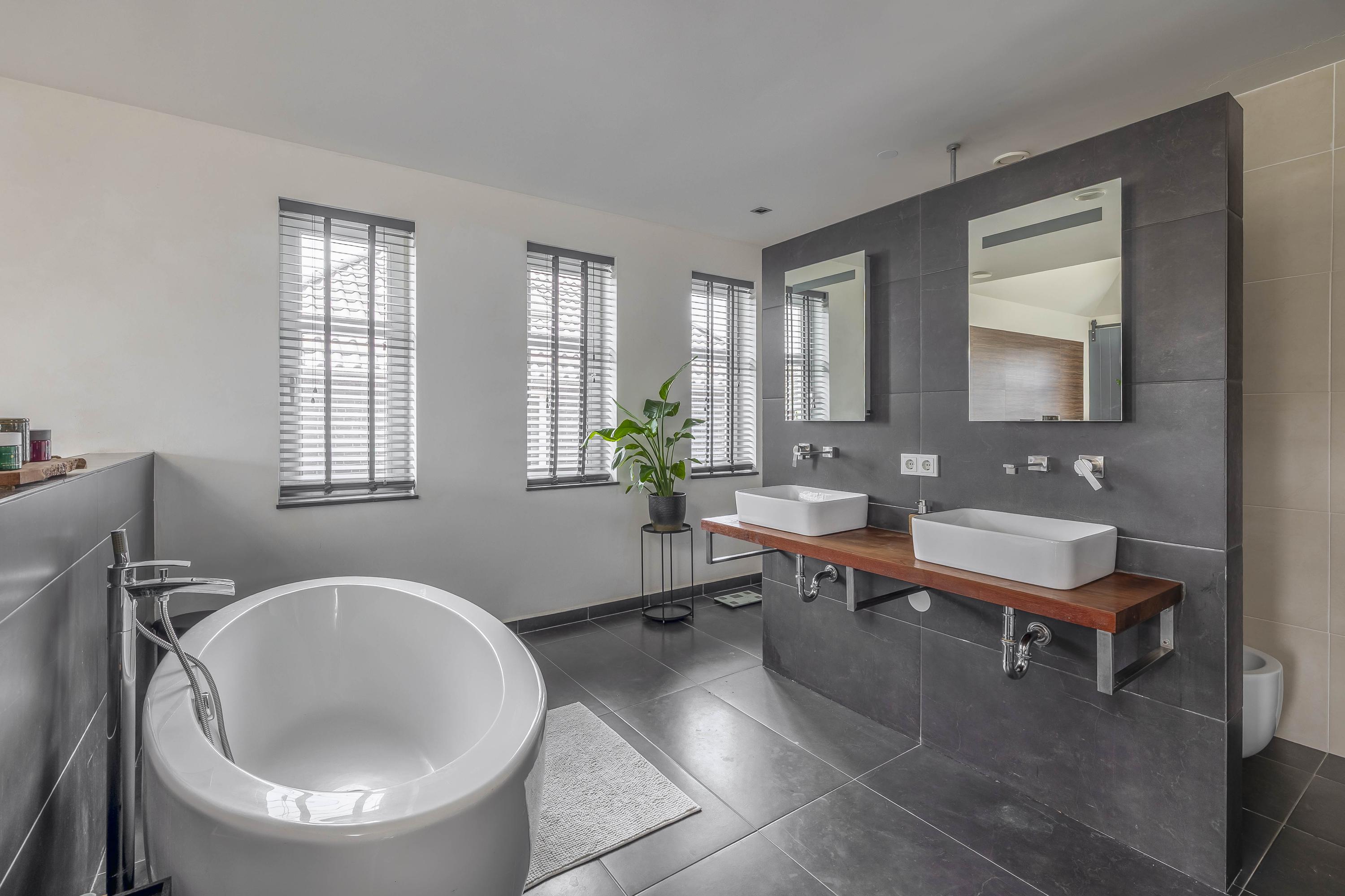 The spacious, luxuriously finished bathroom features an oval freestanding bathtub, generous walk-in shower with rain and hand shower, built-in faucet and drain channel, a washbasin shelf with two basins, bidet, a built-in closet and a design radiator.