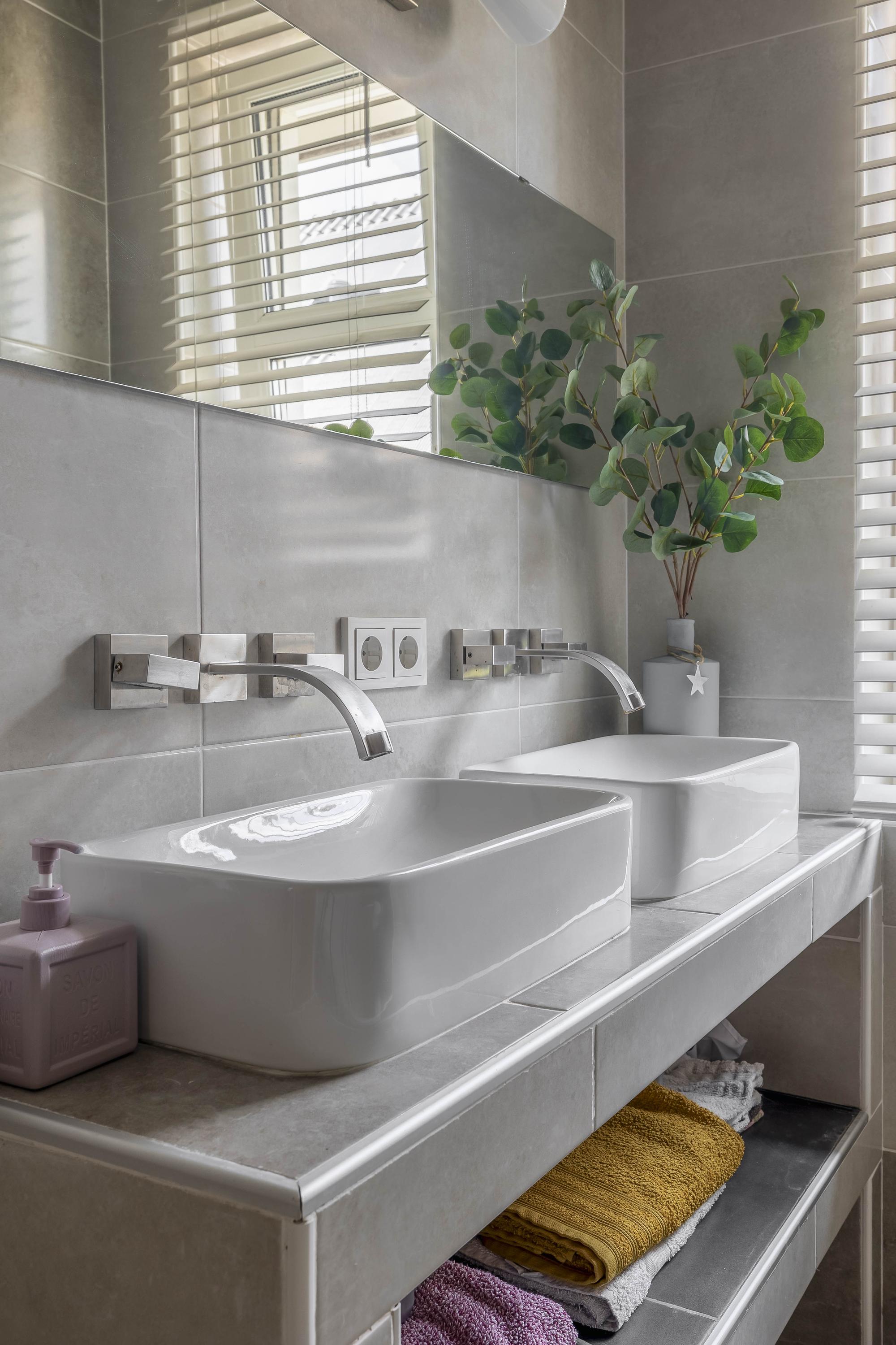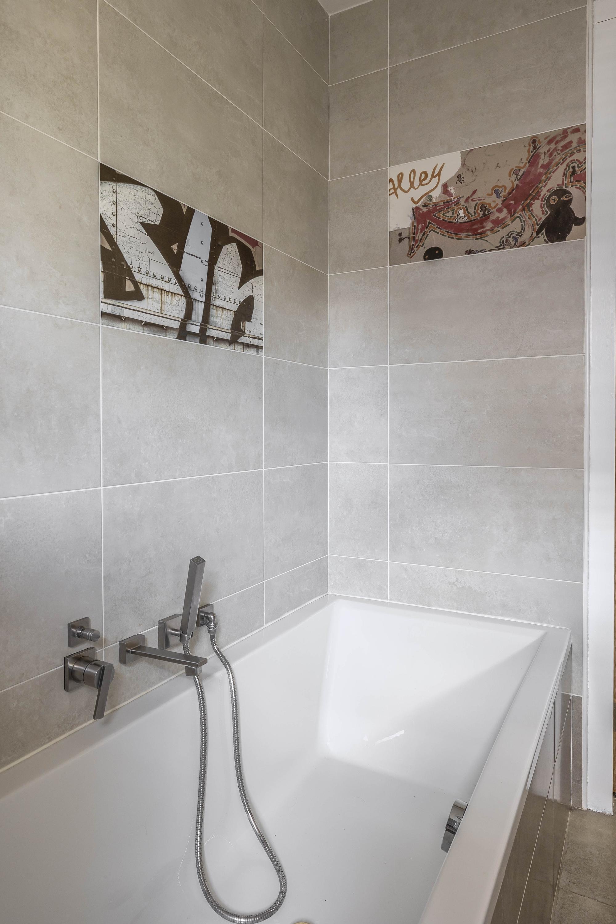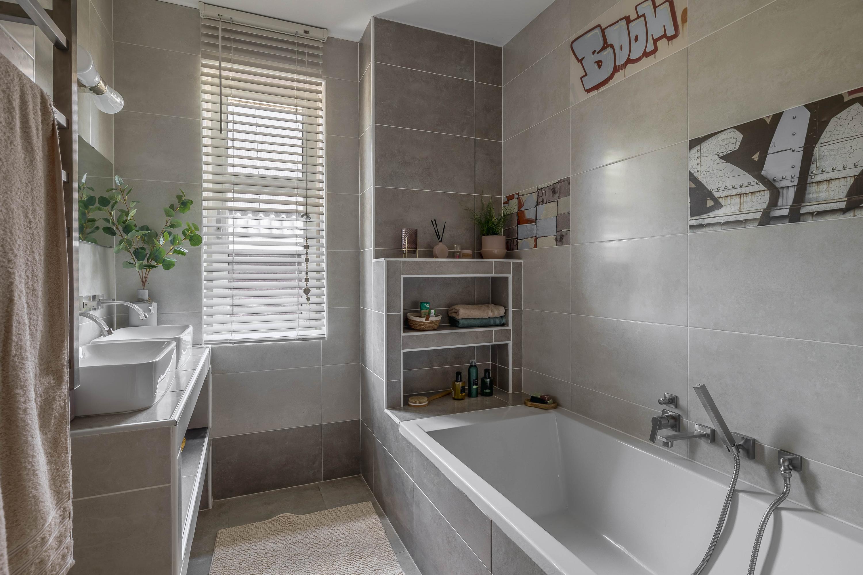 Furthermore, the floor features a fully tiled 2nd bathroom. This is equipped with a bathtub with built-in taps, a washbasin shelf with two washbasins and a design radiator.
