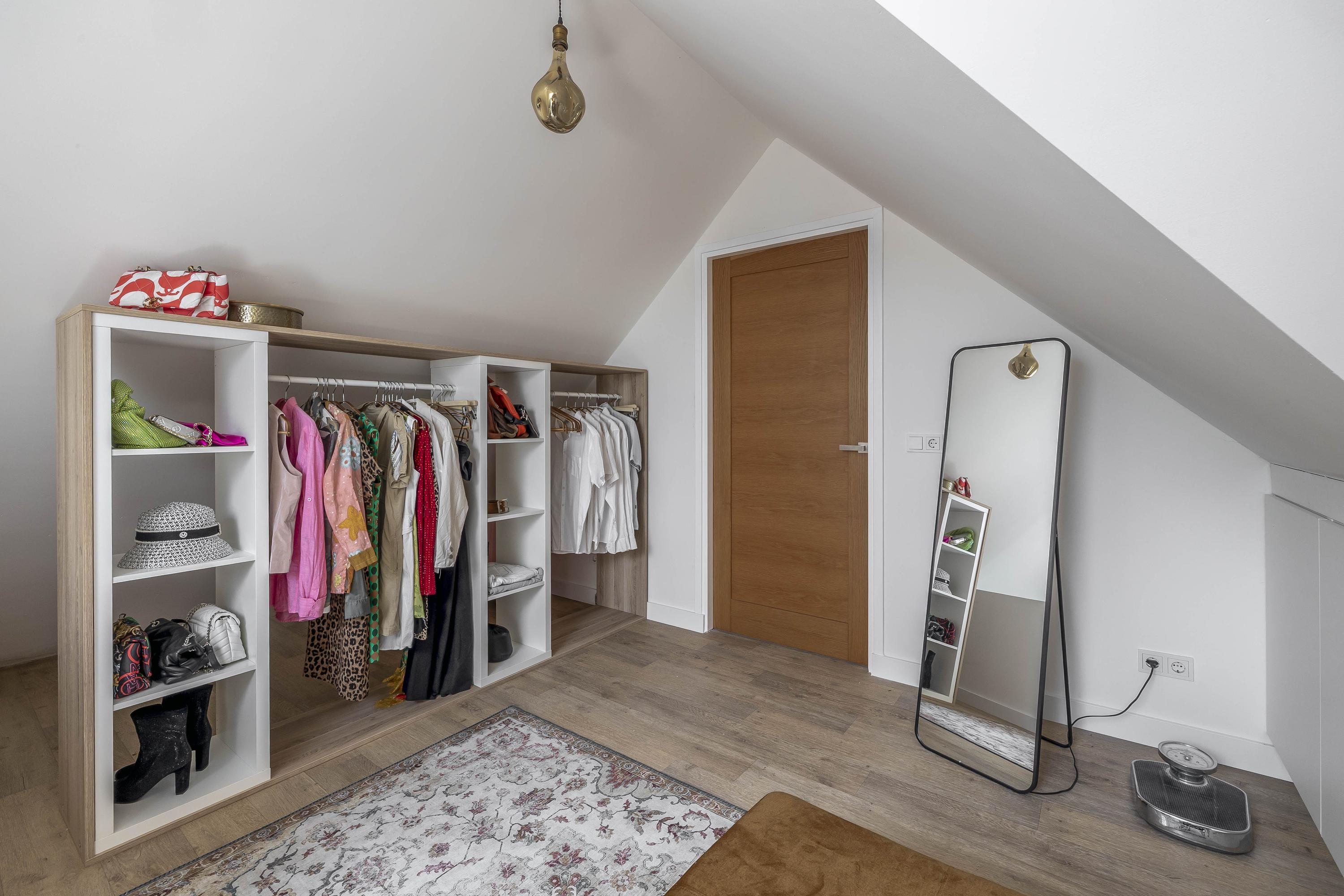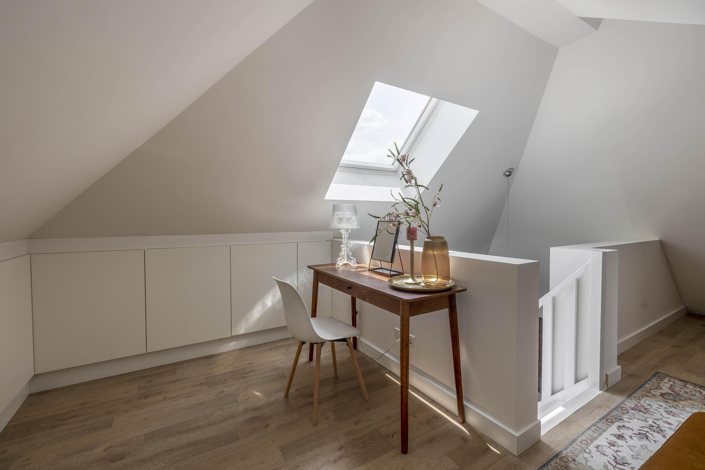 The attic floor is accessible from both the landing and the master bedroom. The floor has vinyl flooring, three Velux skylights and consists of two spacious, multifunctional areas with plenty of storage space under the slope of the roof. Ideal as a dressing room, work or hobby room.
