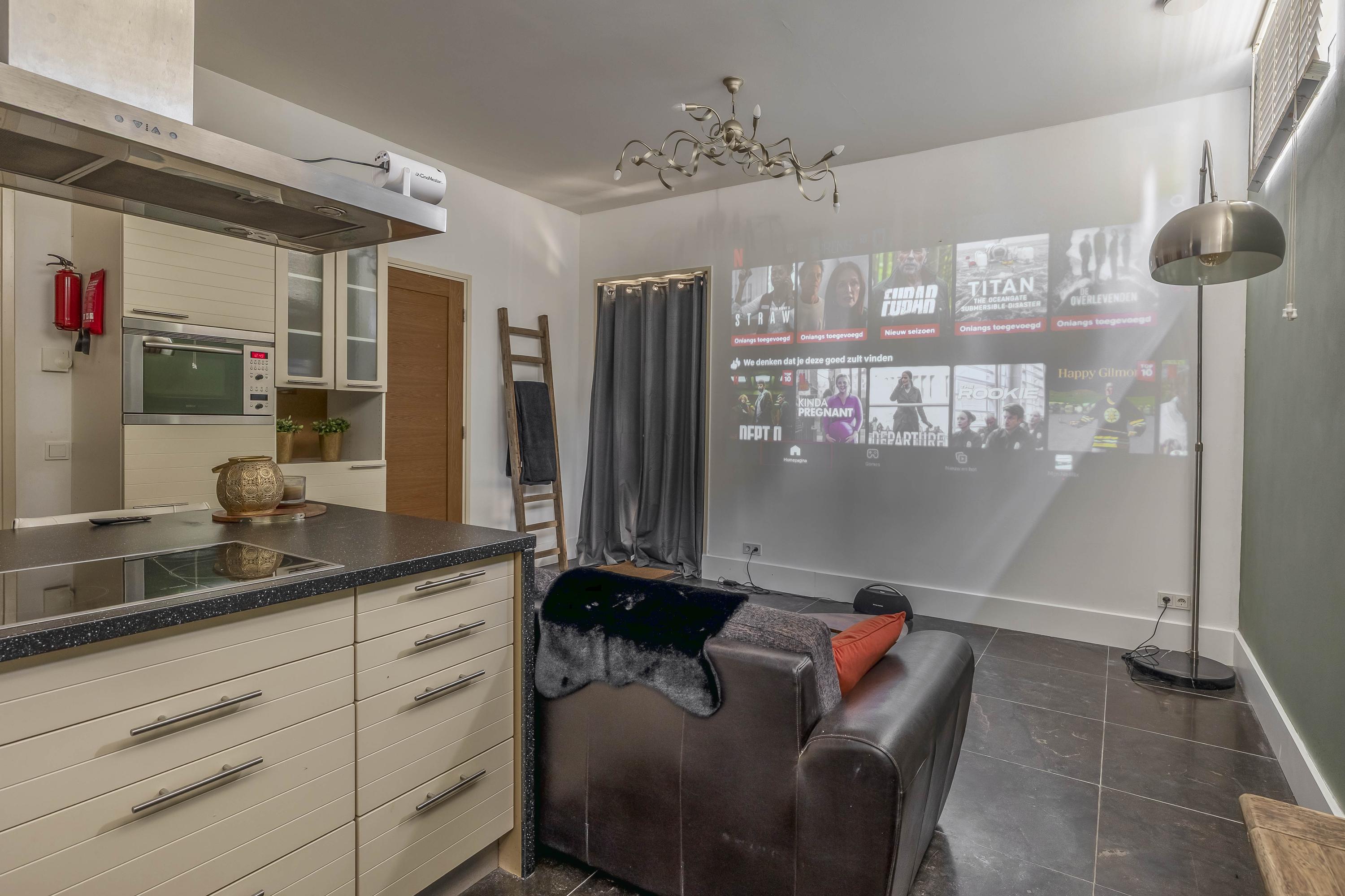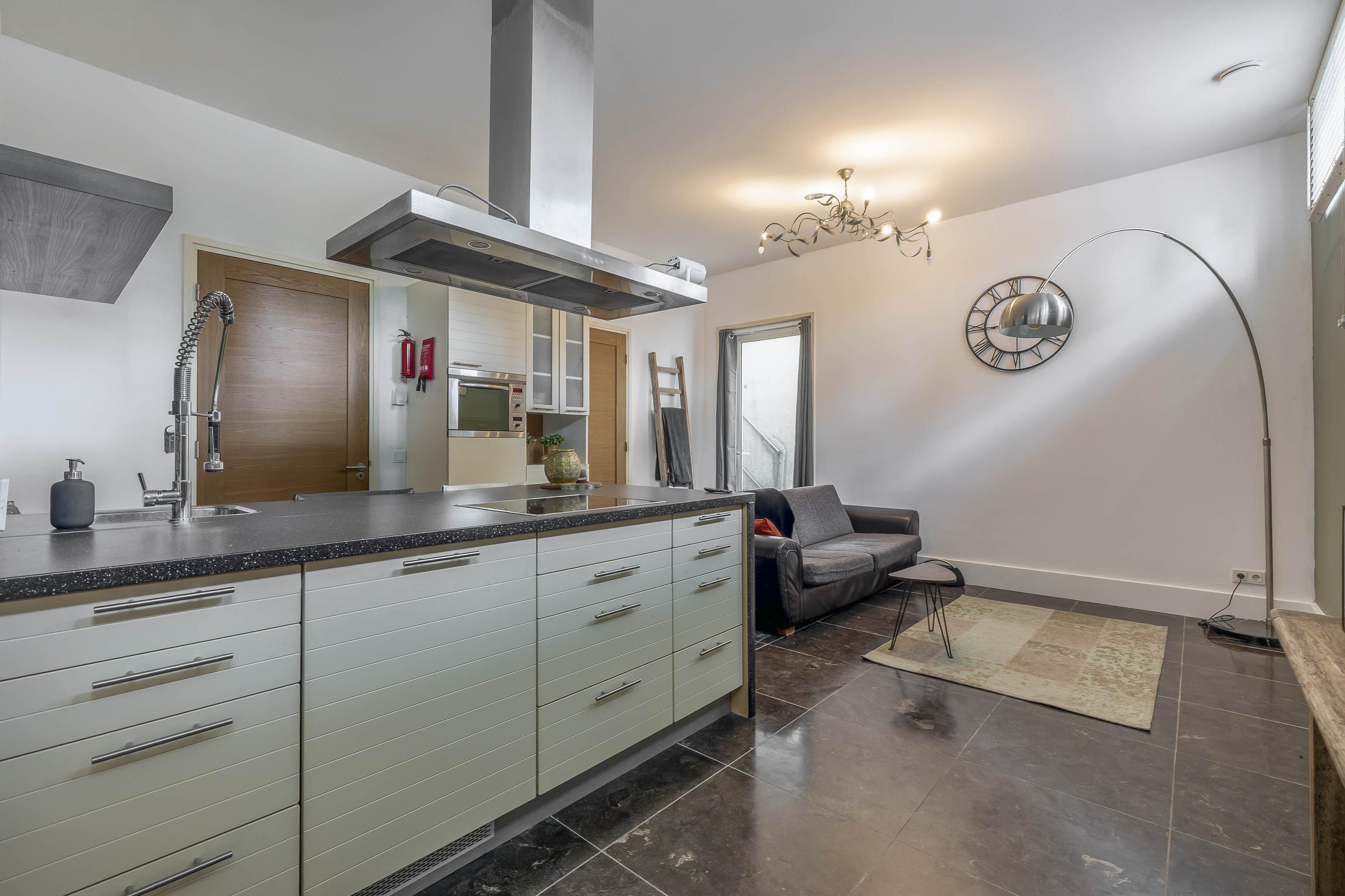 You enter this space in a bright living room with open kitchen, where the impressive ceiling height of over 3 meters immediately stands out. The kitchen is modern and fully equipped with an induction hob, extractor hood, dishwasher, refrigerator and microwave oven. In a convenient niche behind the kitchen is the connection for the washing machine.