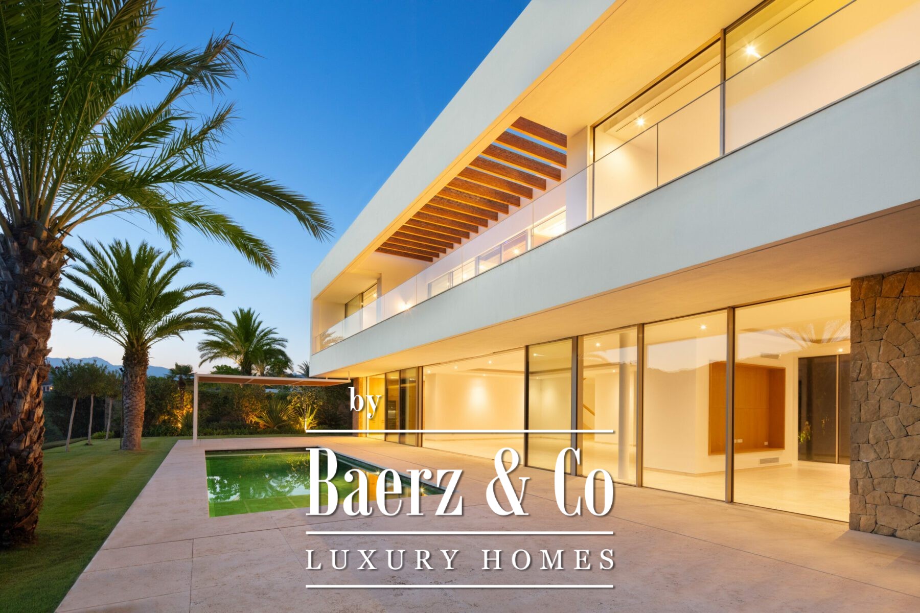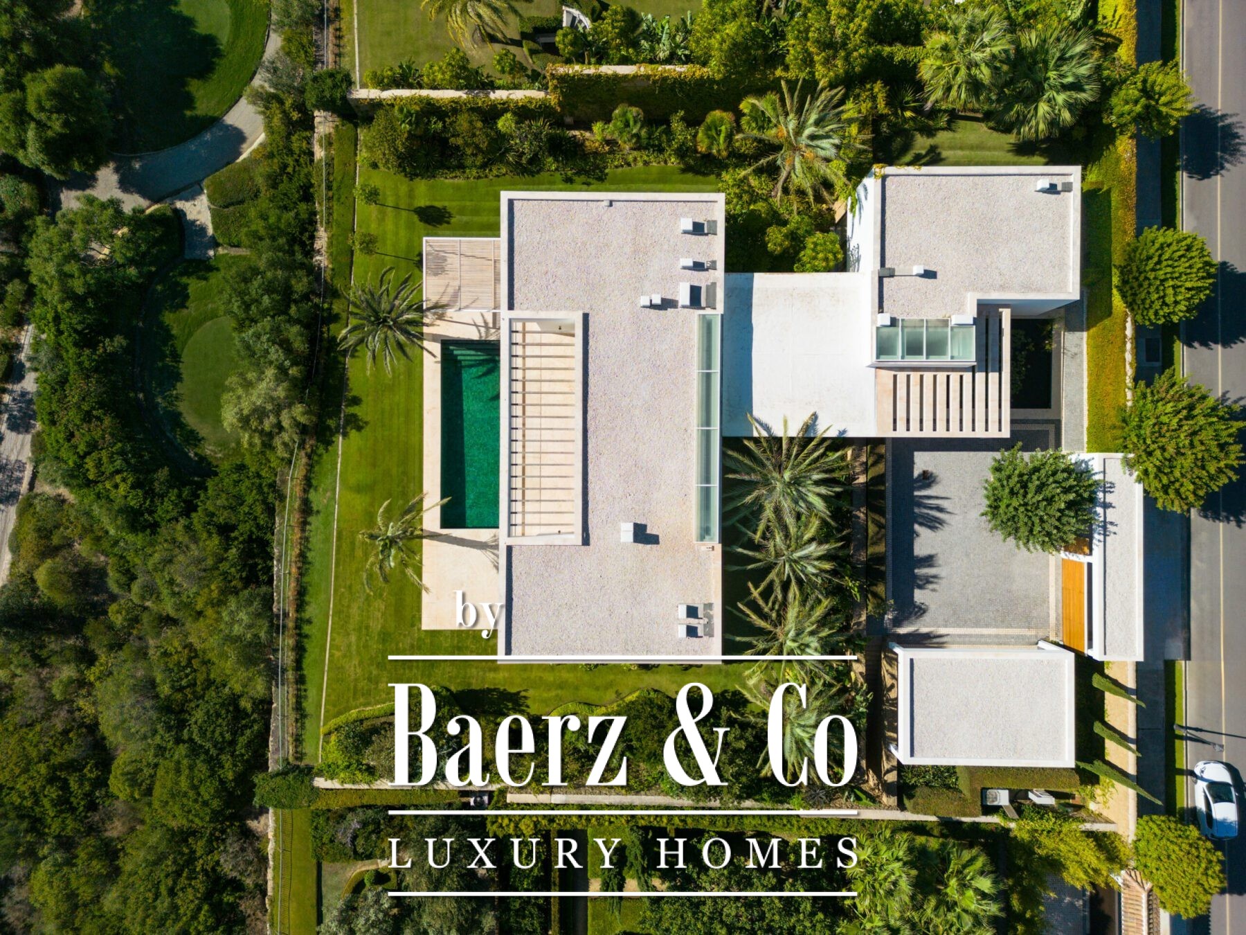 The villa’s architecture is precise and unburdened, allowing natural light to animate interiors defined by soft neutral tones and considered wooden accents. Four bedrooms are thoughtfully arranged upstairs, with a fifth on the ground floor for versatility. A Gaggenau-fitted kitchen and fluid living zones on the main level open to terraces through expansive glass doors, framing the garden and swimming pool in serene harmony.