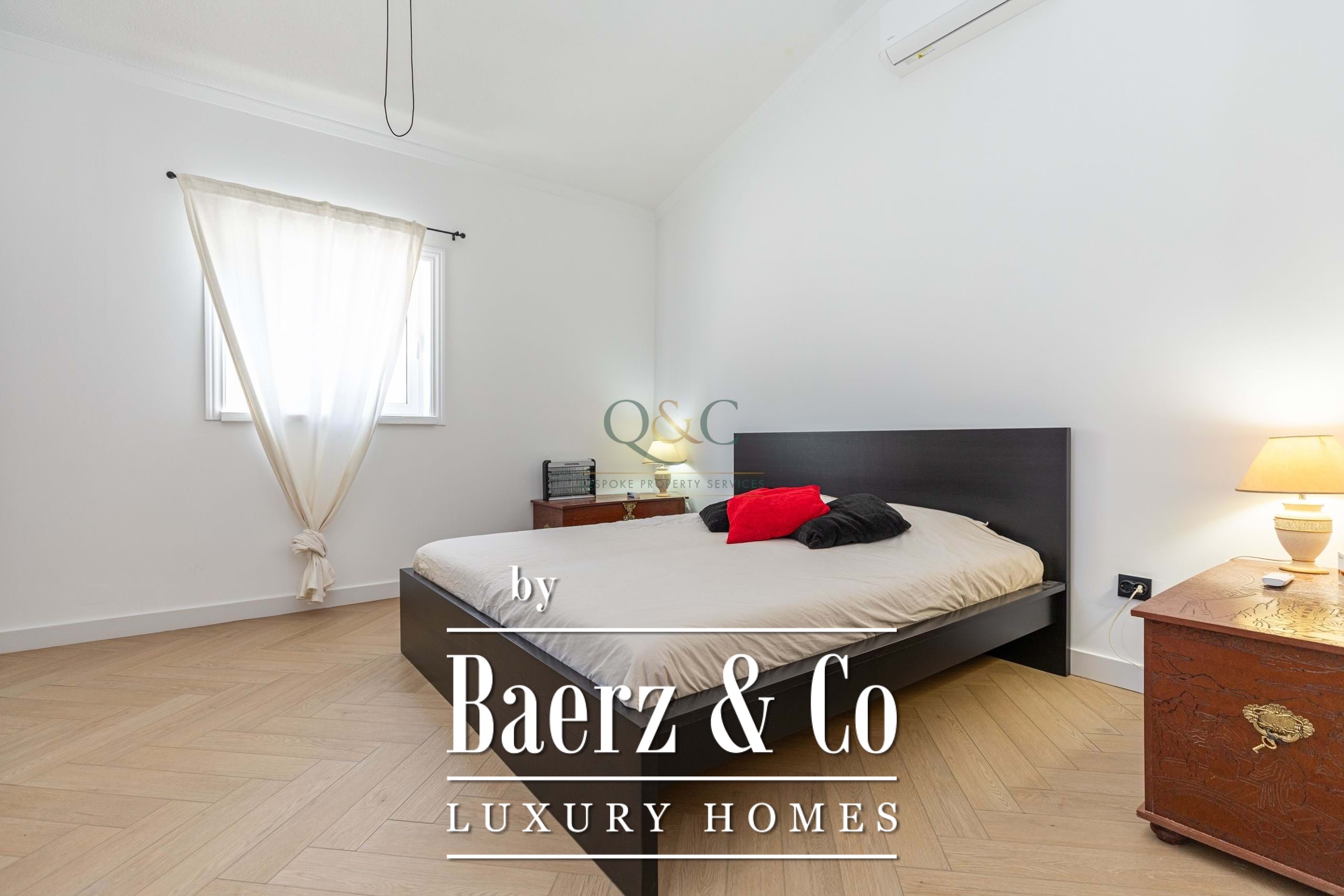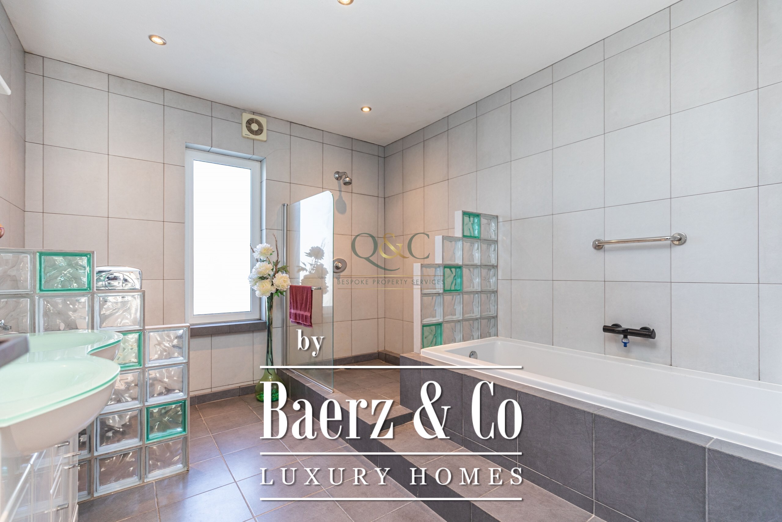 There are three generous double bedrooms, including two with recently refurbished en-suite bathrooms. The primary suite features a walk-in wardrobe and dressing area, while the third bedroom offers double doors leading straight to the swimming pool terrace. A large family bathroom includes a bath, substantial walk-in shower, and double vanity. Utility needs are met with a dedicated laundry room, storage spaces, and an equipped kitchen.