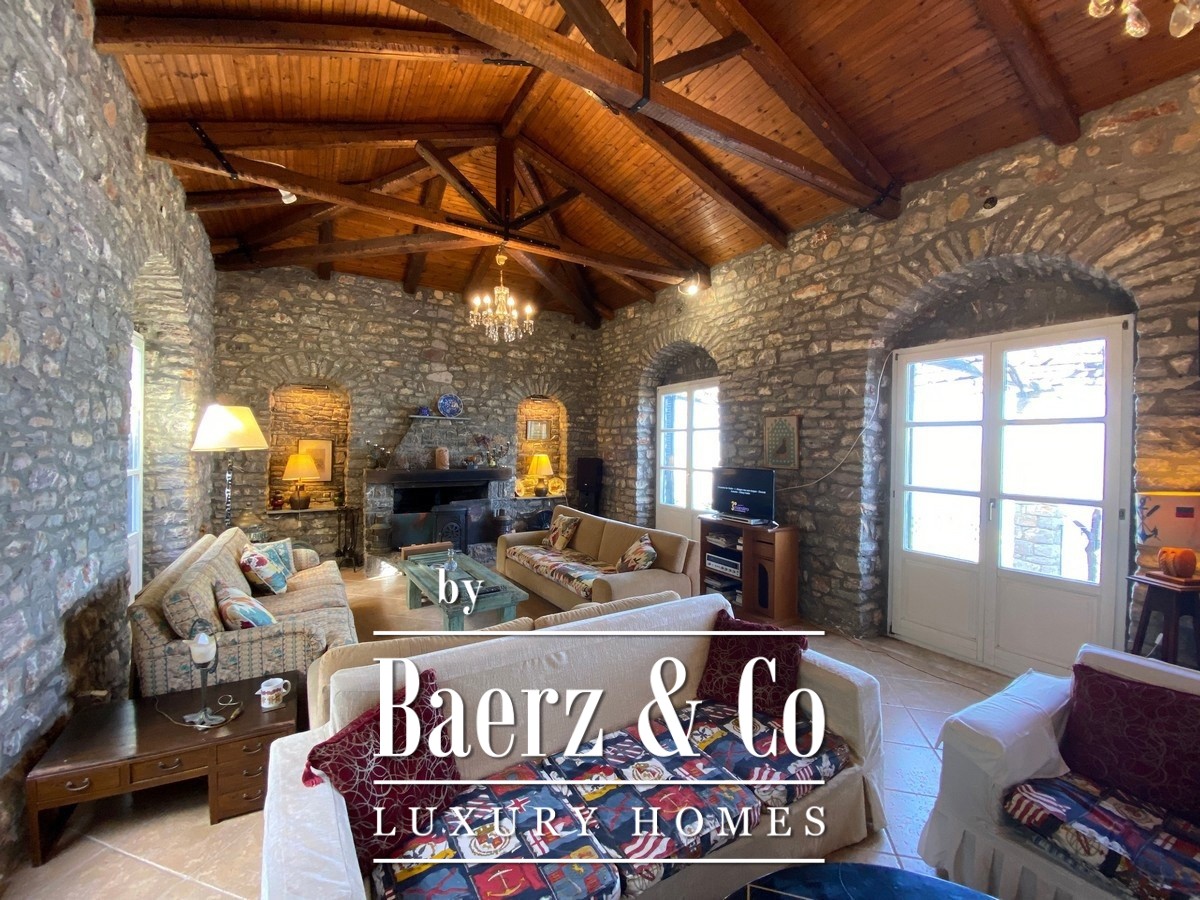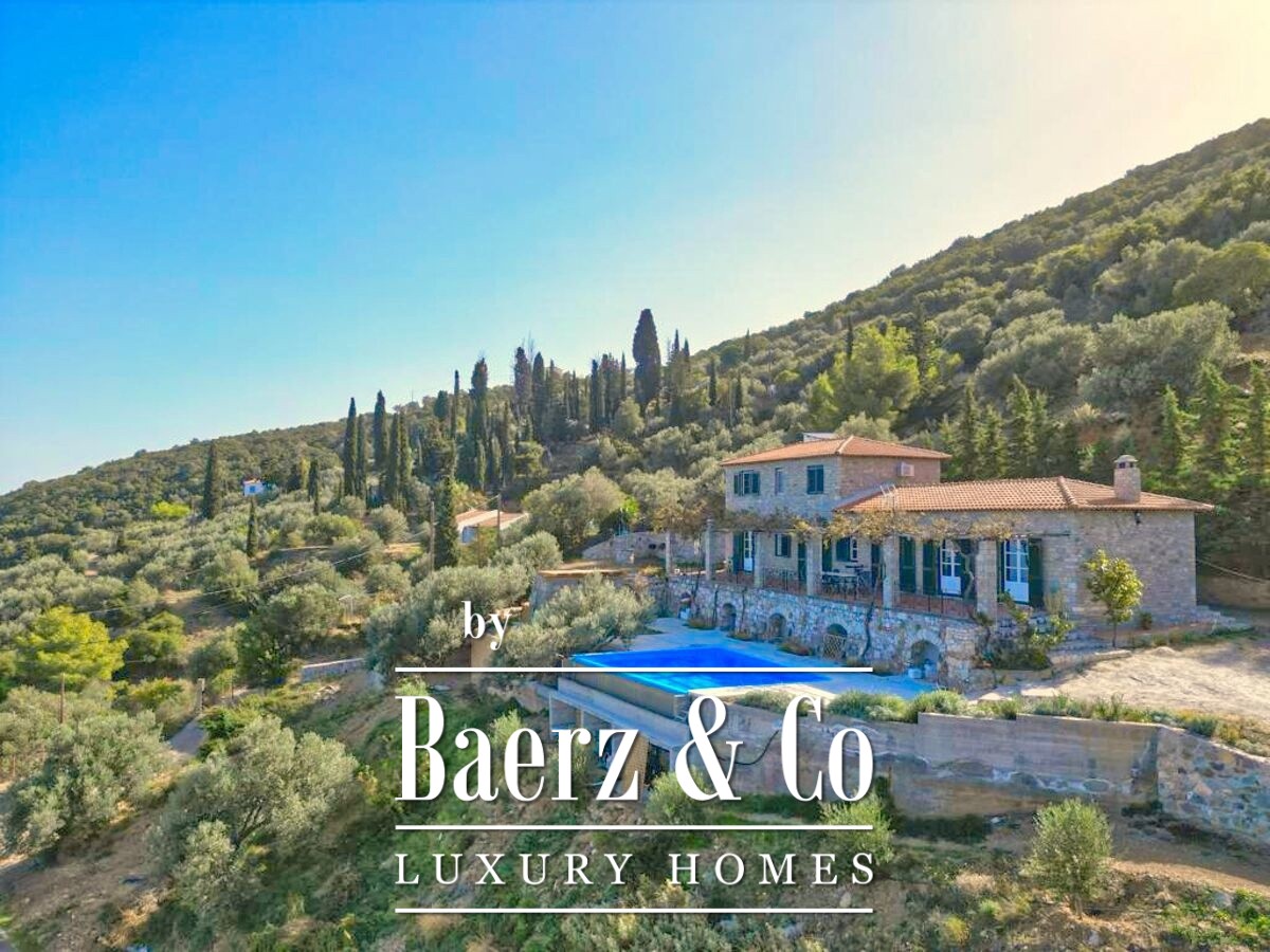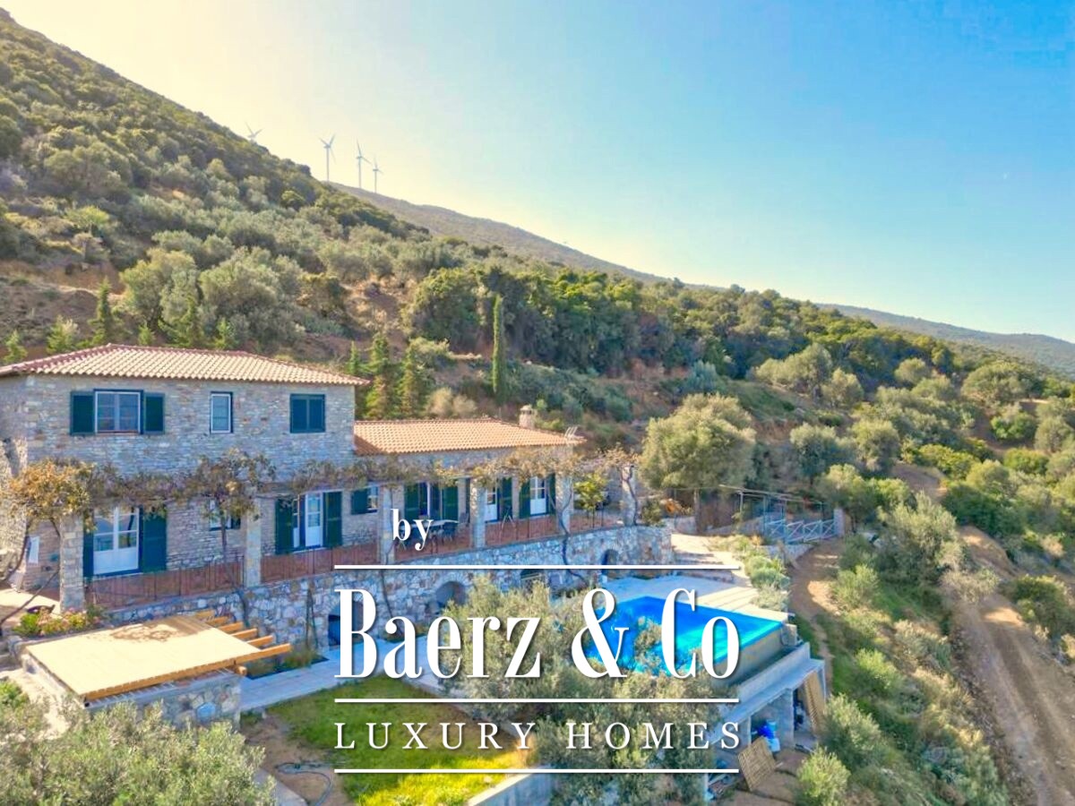 Stone villa Galatas rests on a quiet hillside, offering panoramic views over the sea and blending traditional Greek architecture with understated modern comfort. Within its 180 m² interior, spacious and inviting rooms are crafted to embrace natural light, including a central living area anchored by an impressive stone fireplace. Every room, from the separate kitchen to the three bedrooms and two bathrooms, is designed with functionality and subtle luxury in mind.