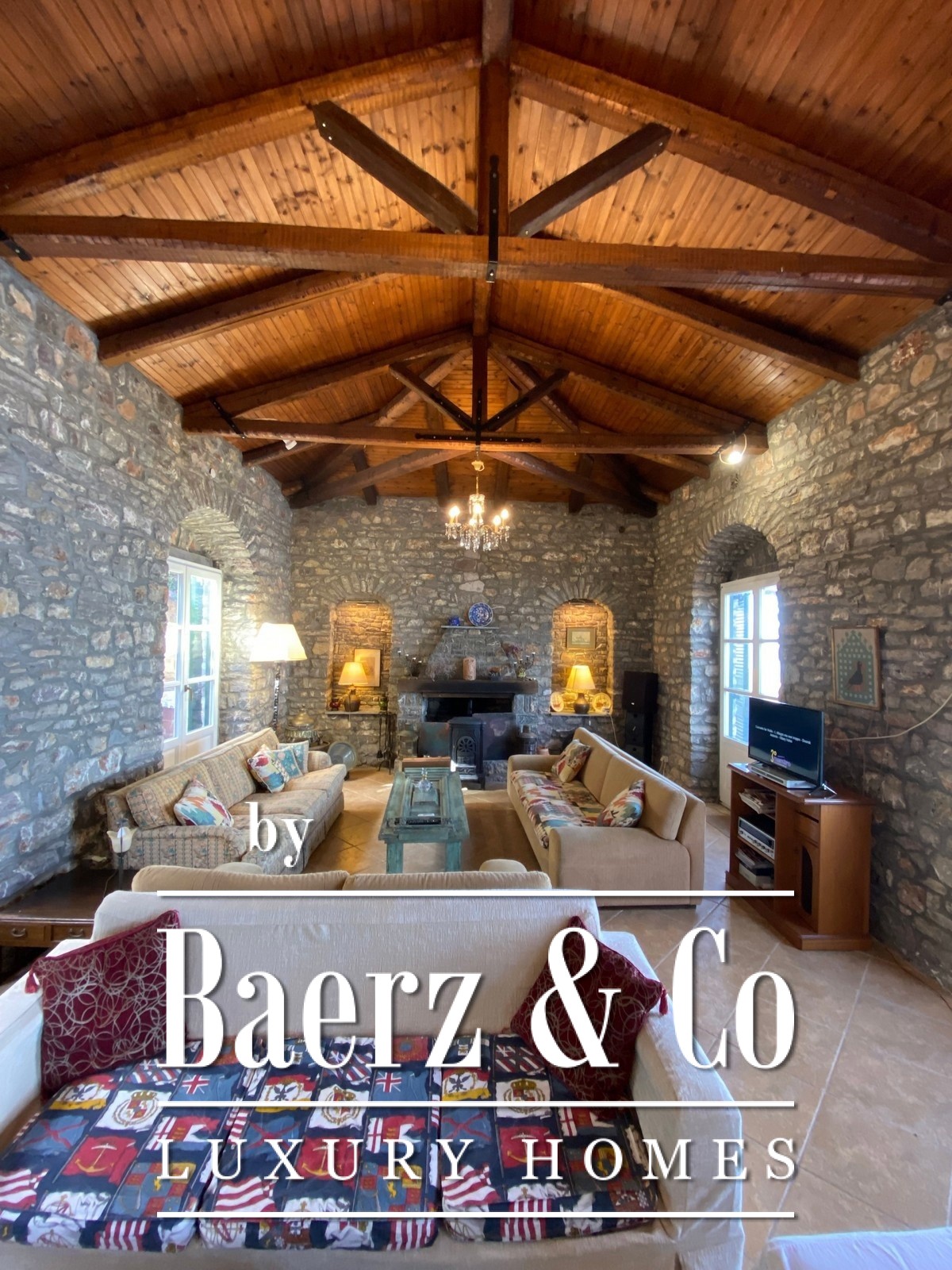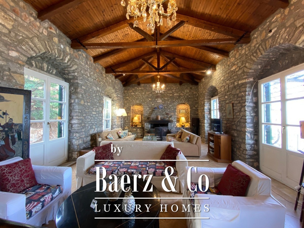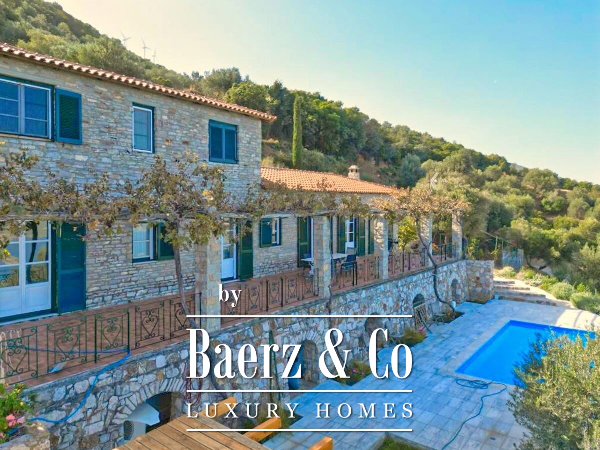 Stone villa Galatas rests on a quiet hillside, offering panoramic views over the sea and blending traditional Greek architecture with understated modern comfort. Within its 180 m² interior, spacious and inviting rooms are crafted to embrace natural light, including a central living area anchored by an impressive stone fireplace. Every room, from the separate kitchen to the three bedrooms and two bathrooms, is designed with functionality and subtle luxury in mind.