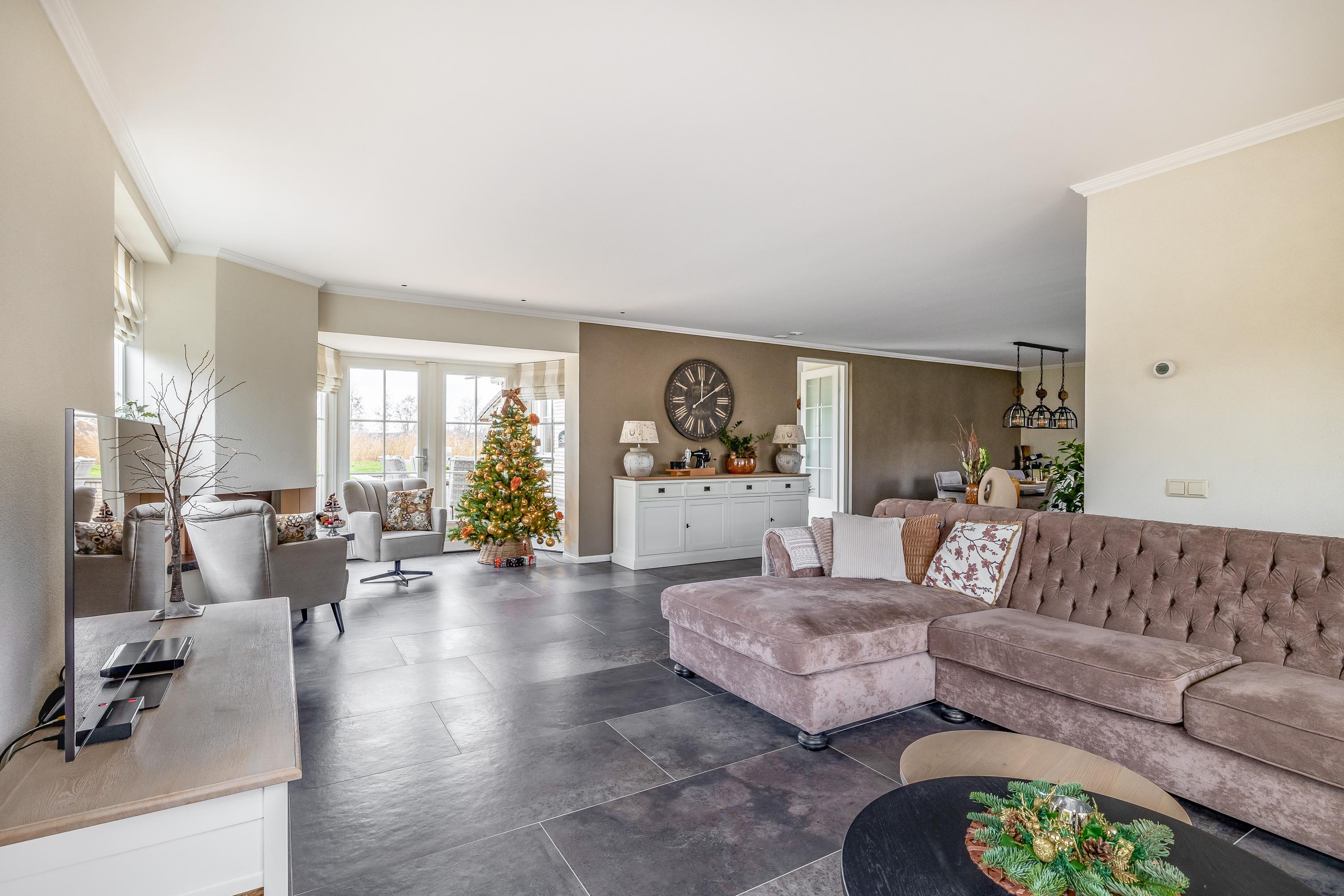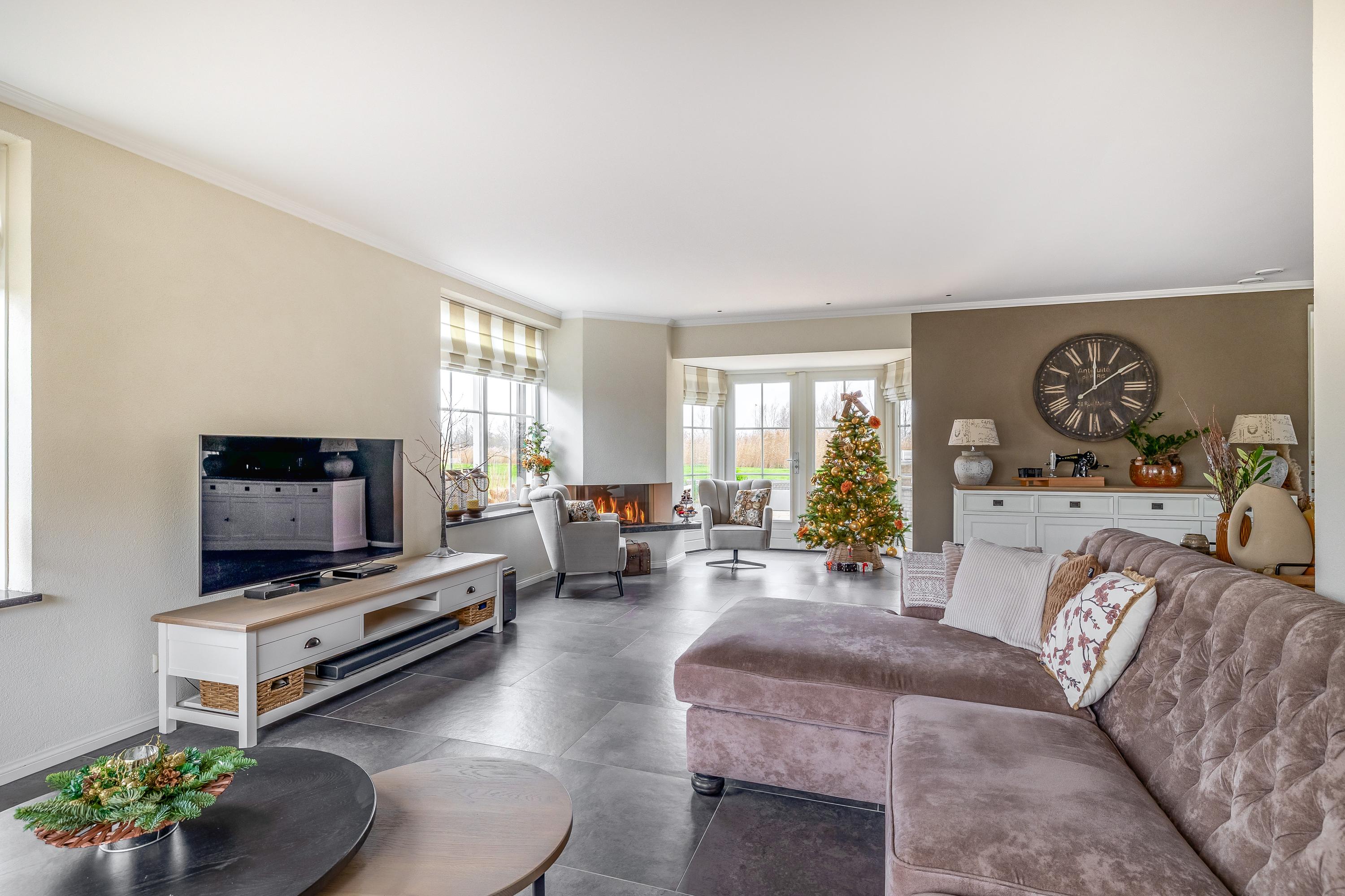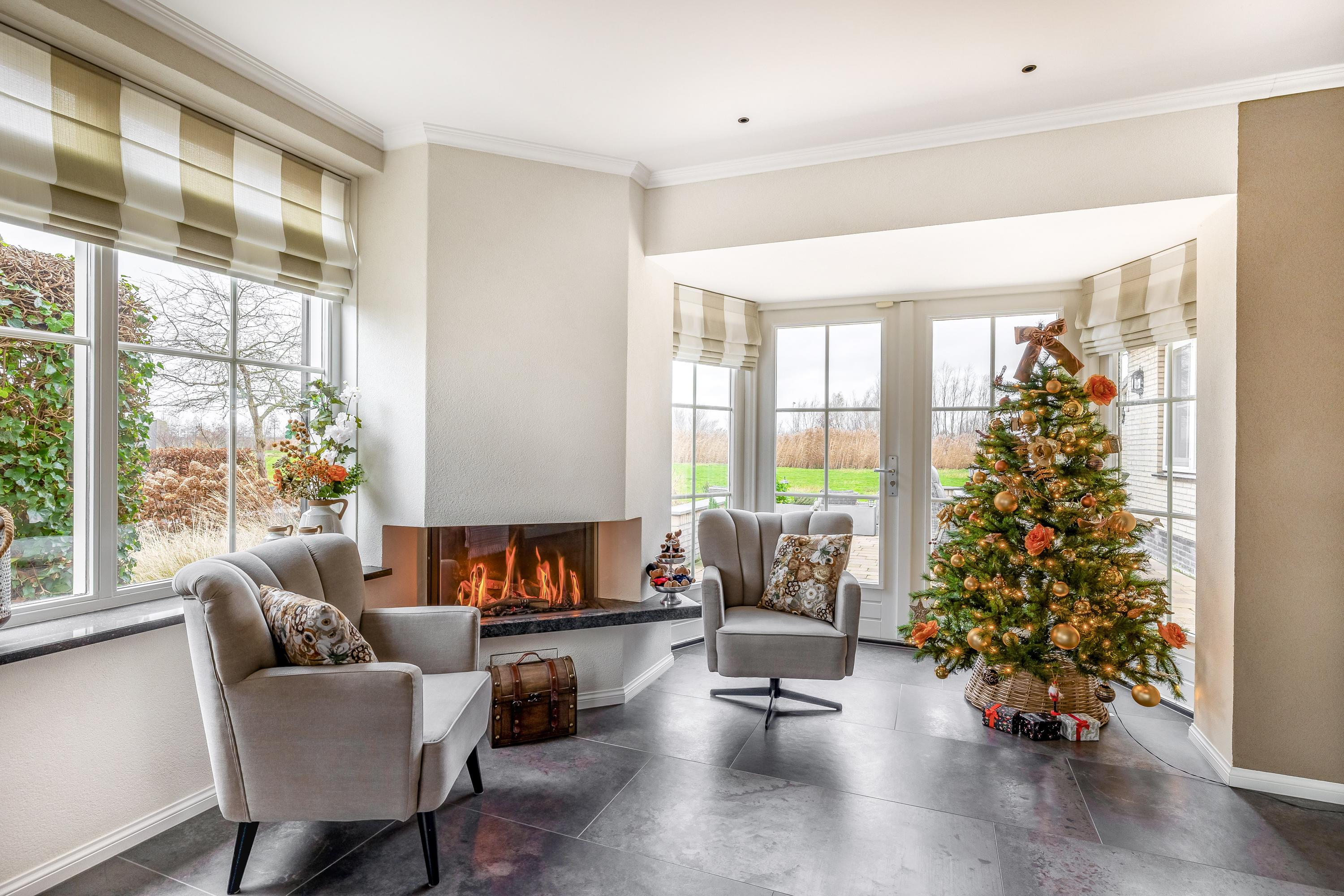 Through the stylish entrance you enter a spacious hallway with a renovated floating toilet and washbasin. Double doors lead to the very generous living area, which was completely renovated in 2022. The living space consists of a luxury open-plan kitchen, dining area and sitting area with bay window and French doors opening onto the terrace. The modern kitchen is fully equipped: an induction hob with Bora extraction, two identical combination ovens, a large refrigerator and freezer, dishwasher, Quooker and a composite worktop. In the utility room you will find connections for a washing machine and dryer, as well as a door to the outside. Thanks to the large windows and the bay window with French doors, daylight floods in abundantly. The atmospheric gas fireplace and recessed spotlights complete the picture. Also on the ground floor is a spacious bedroom with custom-made wardrobes and a luxury en-suite bathroom (2022) with walk-in shower, floating toilet, washbasin unit and designer radiator. This makes single-level living possible without sacrificing comfort.
