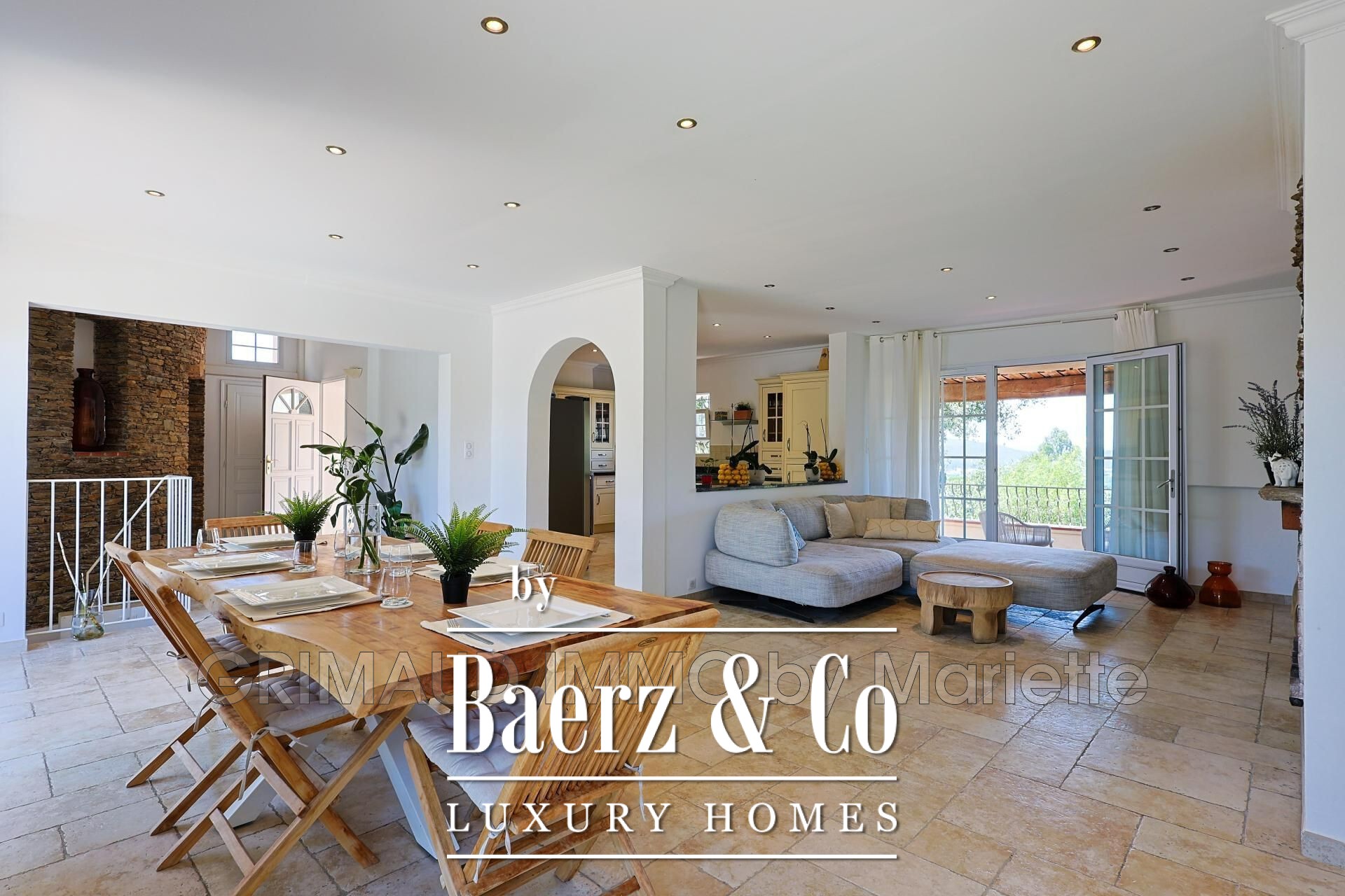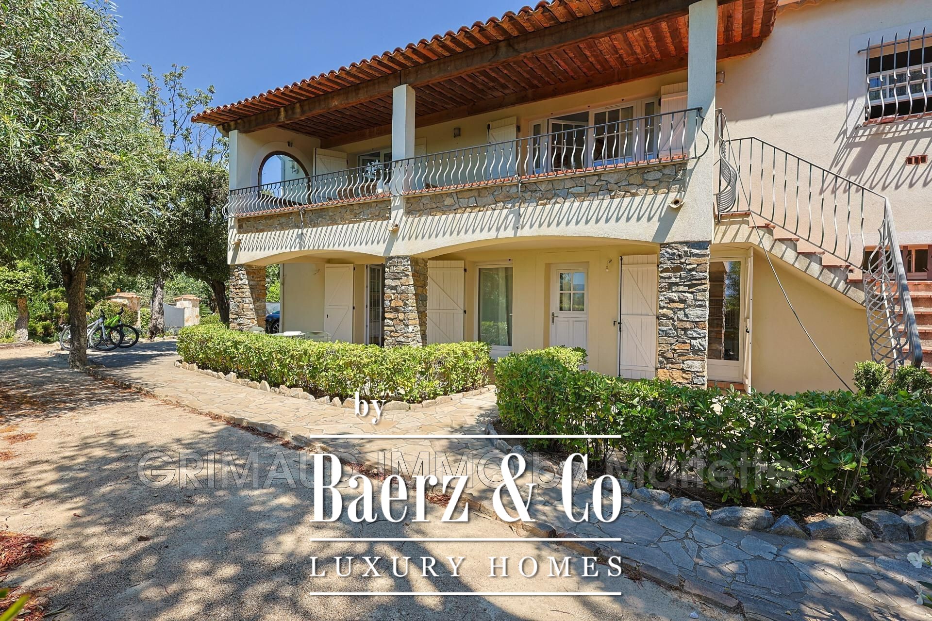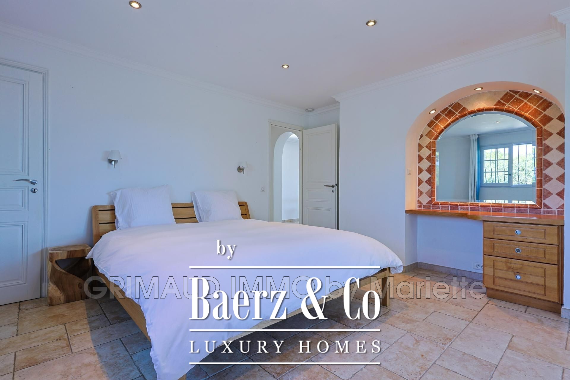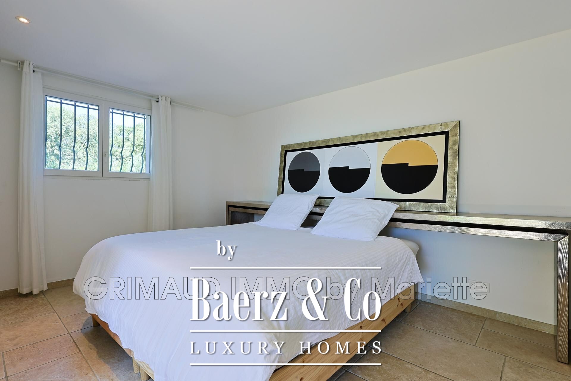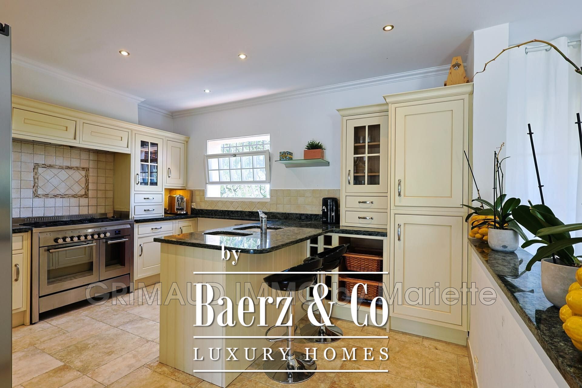 This maison Grimaud is positioned within a quiet and secured estate, offering glimpses of the sea and enveloped by 1,680m² of landscaped gardens. The property spans 190m² of interior space, thoughtfully arranged for privacy and ease of living. The spacious living room, centered around a fireplace, transitions seamlessly to a fully equipped kitchen, creating a rhythm of openness and conviviality. The master bedroom features an adjoining shower room and toilet, together with a dressing area leading out to a covered terrace that blurs the boundary between indoors and garden. In the tower, one finds a bedroom served by a bathroom with shower and toilet, providing a sense of retreat. The garden level comprises two expansive bedrooms, including one en suite, complemented by two generous shower rooms and a private garage. The swimming pool is framed by mature plantings, offering space for relaxation and quiet gathering. This maison Grimaud merges comfort, privacy, and the gentle pace of life that defines the region, with all essential amenities for refined daily living.