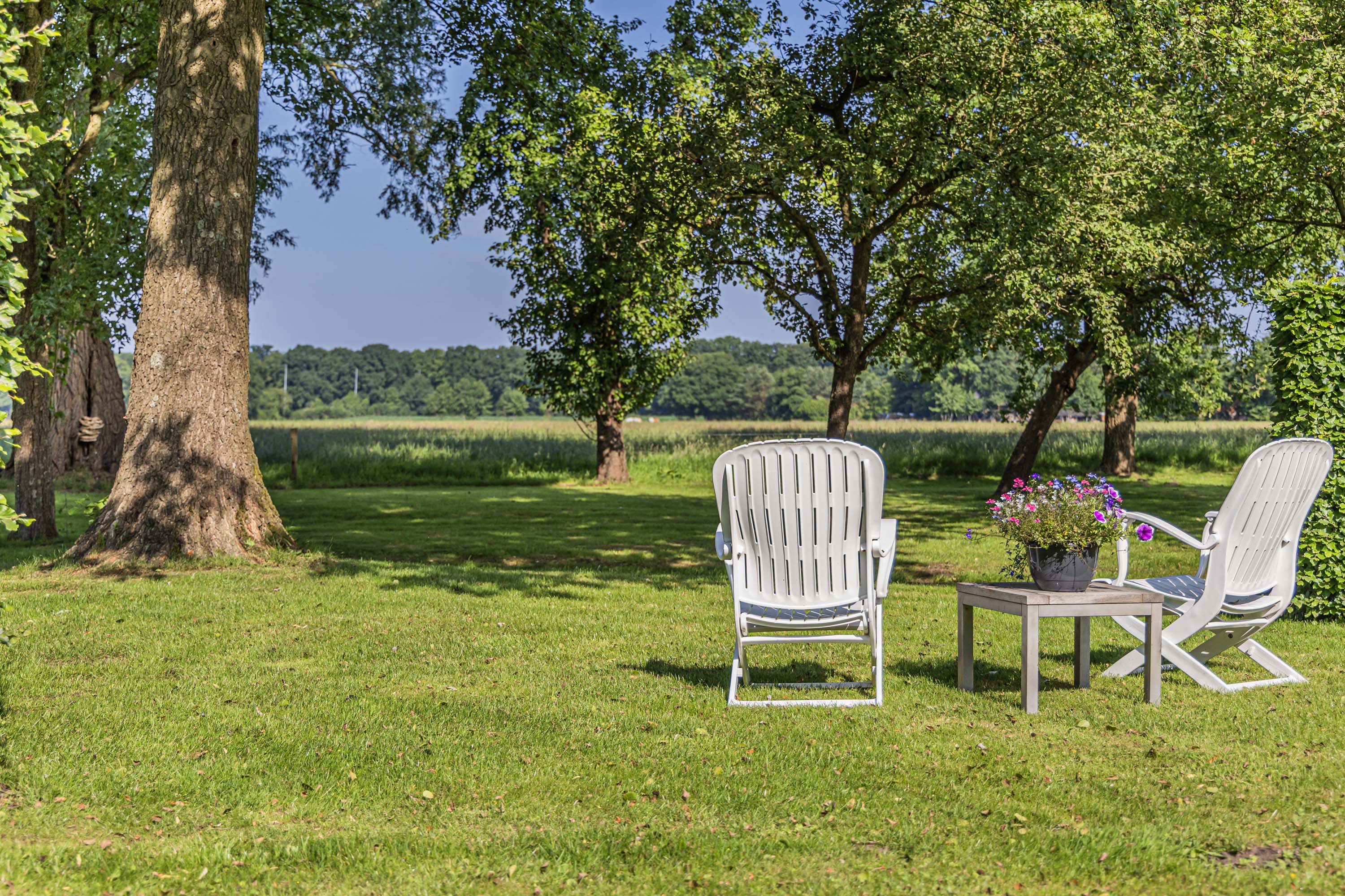 From the Hasseltweg, visitors are guided via the oak-lined driveway to this beautiful farmyard. There is ample space to park several cars. The house is surrounded by a green oasis of various hedges and partitions, all laid out based on a design by internationally renowned landscape architect Piet Oudolf. He transformed the wide, fan-shaped plot into a true paradise. There are multiple sitting areas, each separated with its own privacy and character. At any time of day, it is here for more than optimal enjoyment. The garden is intersected by a small ditch, creating a beautiful natural division: around the house is a landscaped area while the other side of the ditch is a nature meadow with various fruit trees (apple, pear, plum, and a lovely chestnut tree) and a pond where a family of deer raises their young in the tall grass every year. On a separate section of the property are 28 solar panels. The rear boundary is entirely natural with a few solitary trees or evergreen shrubs, allowing full enjoyment of the expansive views and a stunning sunset every evening.