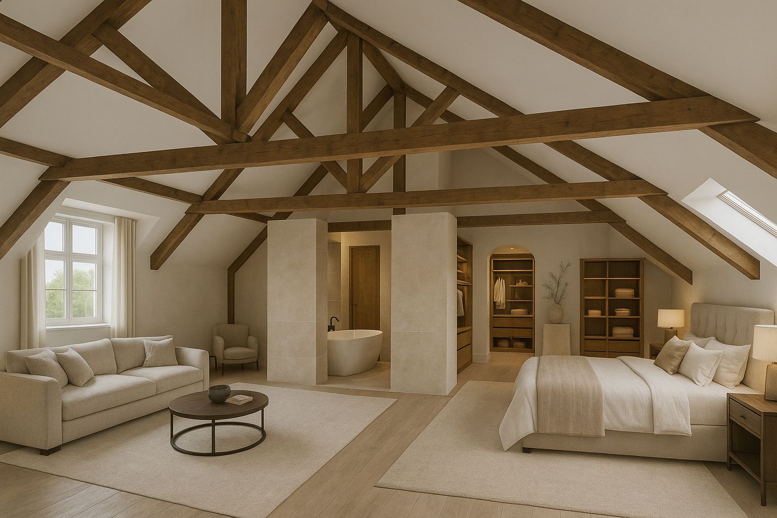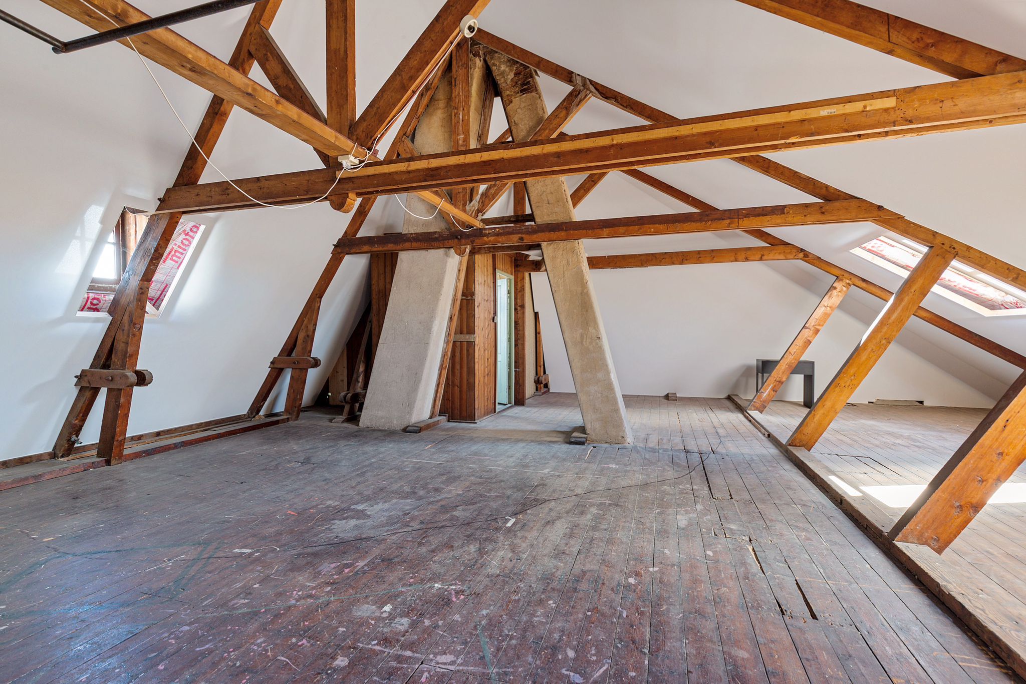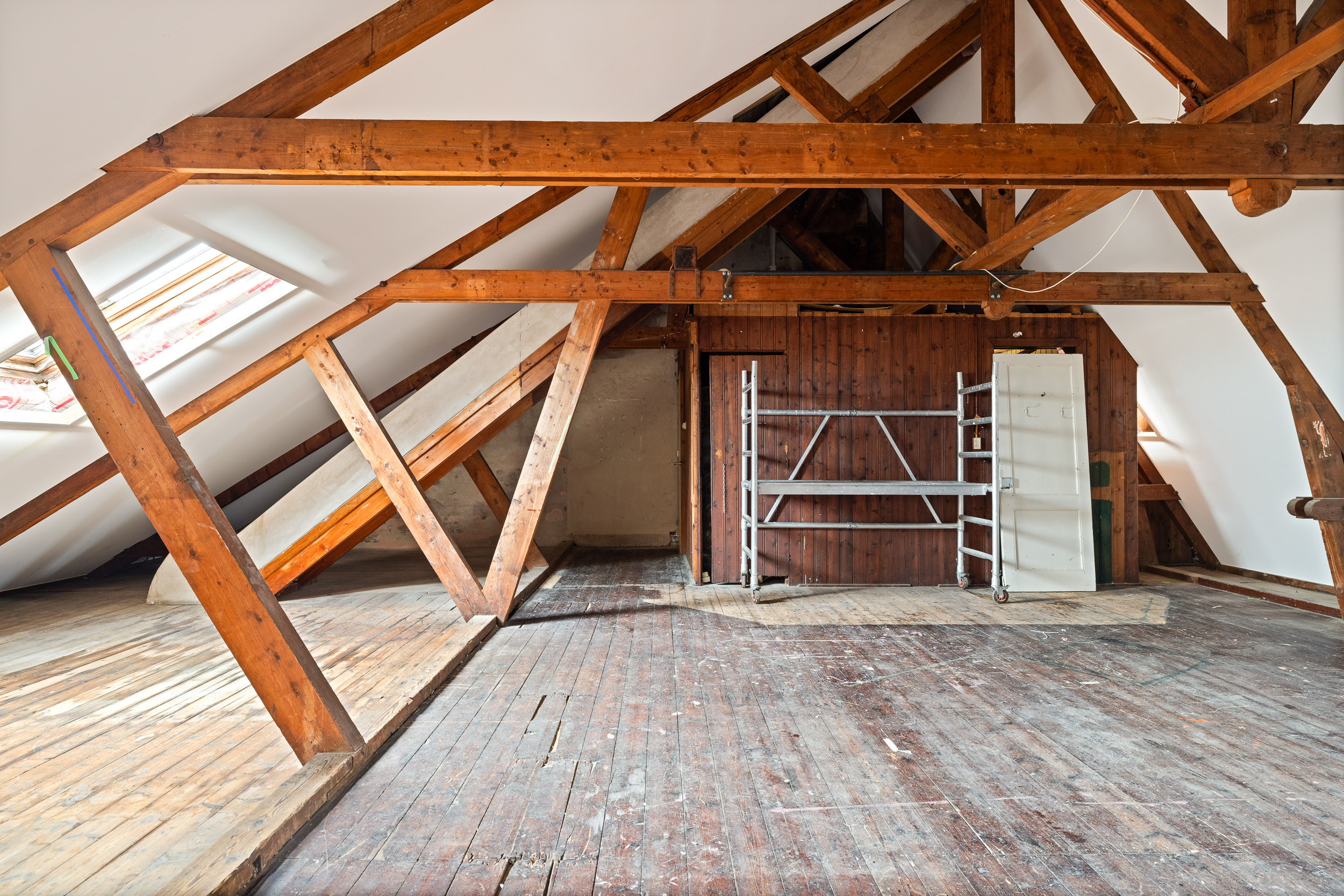 The impressive attic floor of 85 m², fully insulated and featuring striking wooden trusses, remains in its original state and offers full standing height. Accessed via a fixed staircase, this floor provides ample opportunity to create a stylish loft apartment (see artist impression).