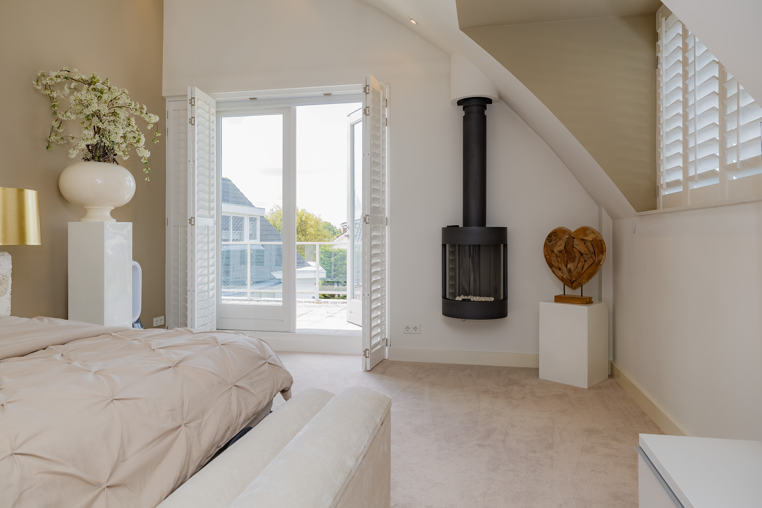 Through the bright entrance you enter a spacious, bright living room with a cozy gas fireplace. The luxurious harmonica doors not only provide a sea of light, but harmoniously connect the interior space with the spacious deck terrace on the water.