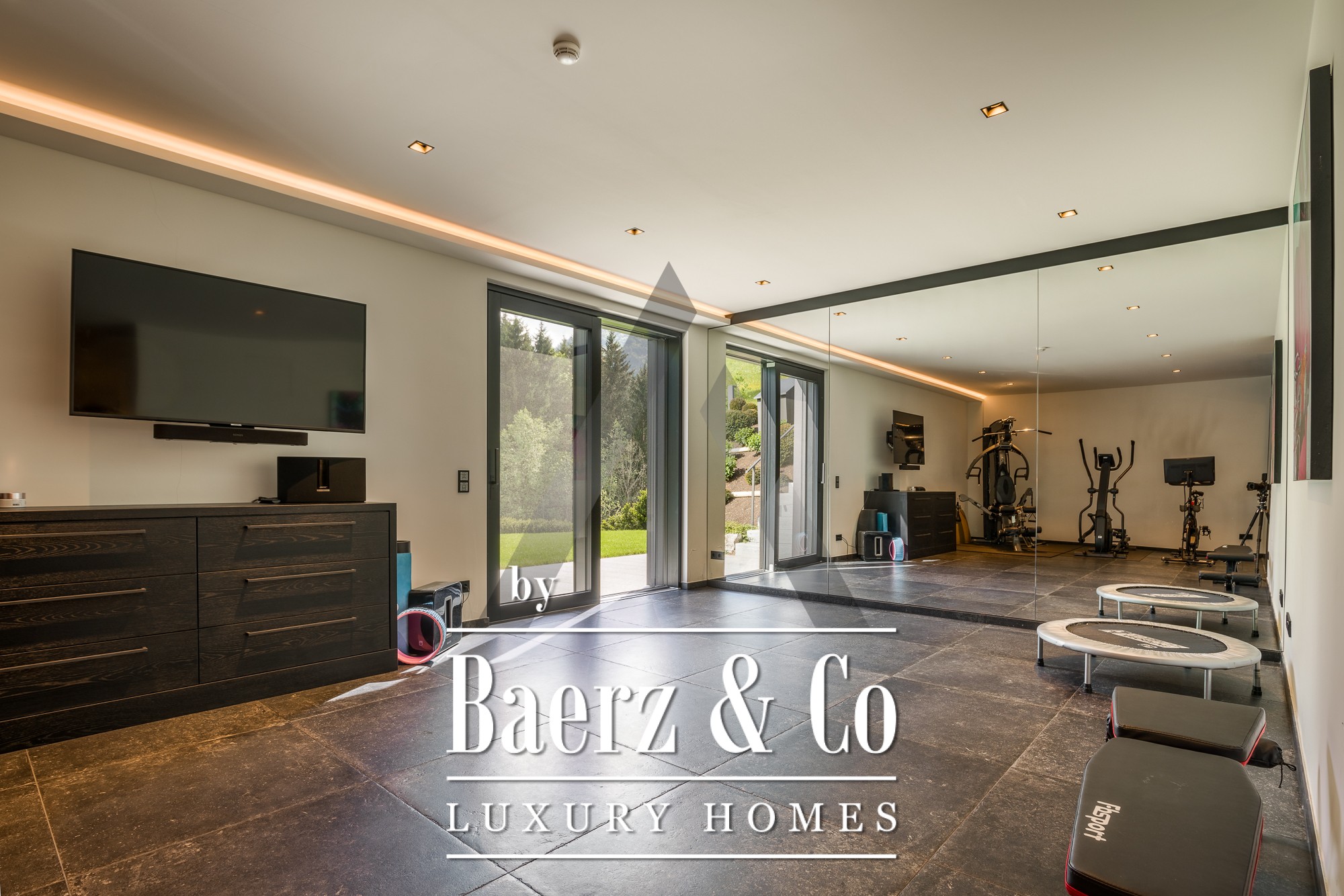 Entering on the ground floor, guests are welcomed by a generous vestibule and a refined coatroom. This level includes a separate apartment featuring a living and dining area, fully appointed kitchen, and two bedrooms, each with dressing room, en-suite bath, and direct access to the patio and garden. A secluded wellness area, with sauna and steam bath, is dedicated to relaxation and privacy.