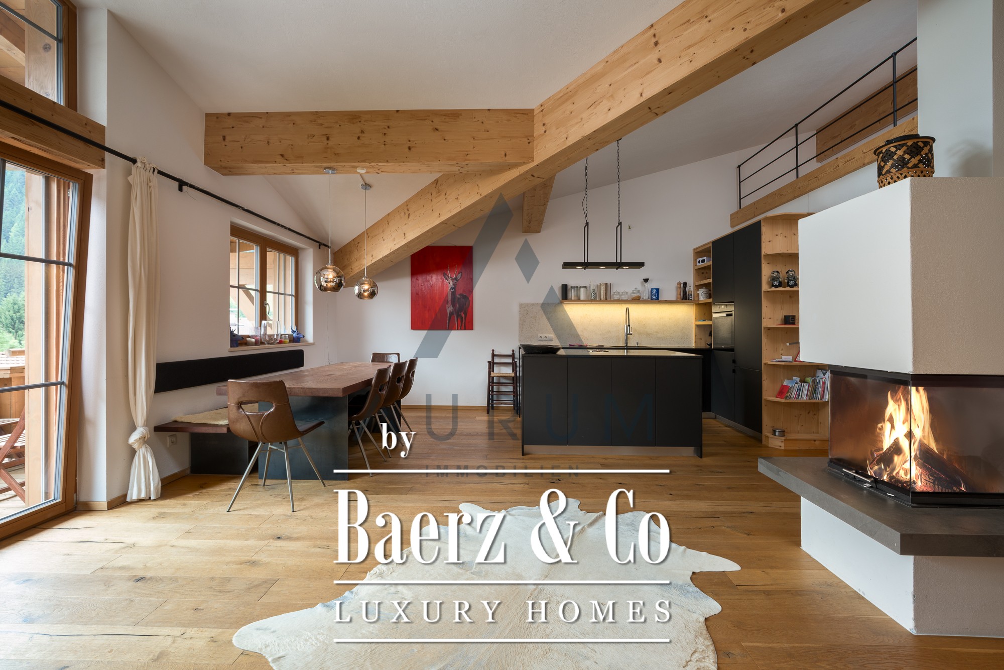 This penthouse apartment Kirchberg in Tirol is set in an exceptionally tranquil location within a contemporary building completed in 2016. The living experience begins in a spacious entrance that unfolds into a refined living and dining area, where a fireplace and exposed roof trusses set an inviting tone. Natural light moves across oak floorboards, while oversized porcelain stoneware tiles and Venetian blinds punctuate the refined space. The professional kitchen, thoughtfully separated yet sight-connected, features name-brand appliances and grants direct access to a private balcony poised above the landscape.
