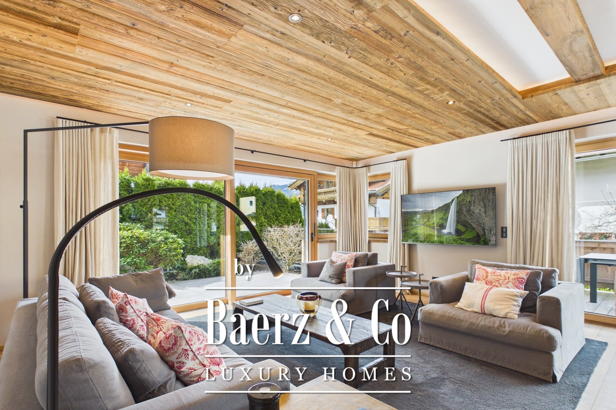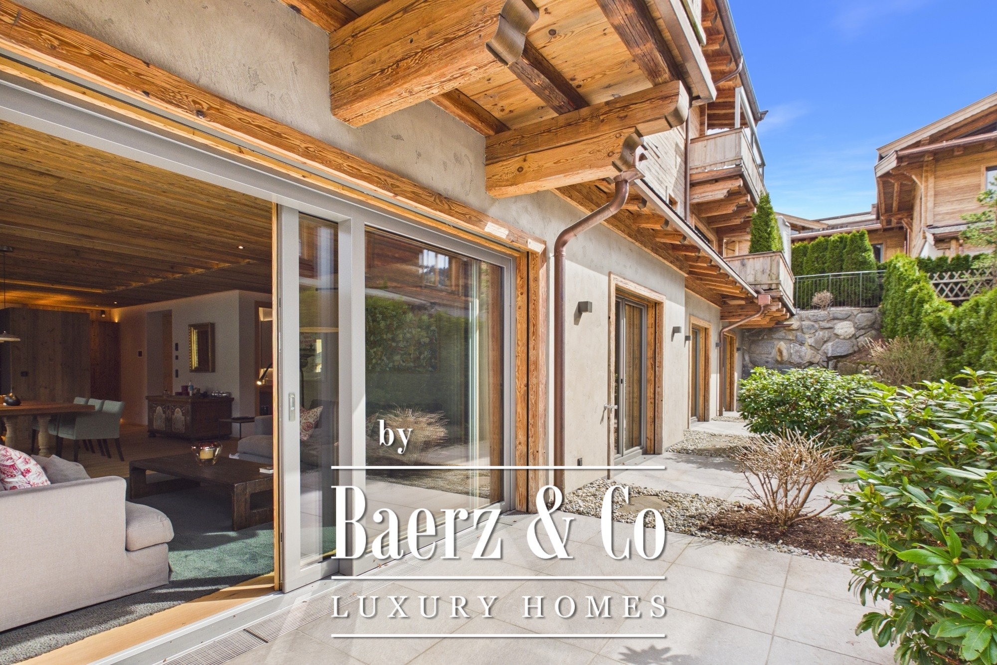 Apartment Kirchberg in Tirol offers a refined living experience at the end of a quiet cul-de-sac, set slightly elevated with close proximity to ski slopes and the town center. Encompassing a generous 135 m² of living area, this residence is distinguished by three rooms each with en-suite bathrooms, two configured as bedrooms, and a large wellness room complete with sauna. An open-plan living, dining, and kitchen area becomes the social heart of the home, featuring reclaimed wood ceilings and a custom-built kitchen fitted with Miele appliances.