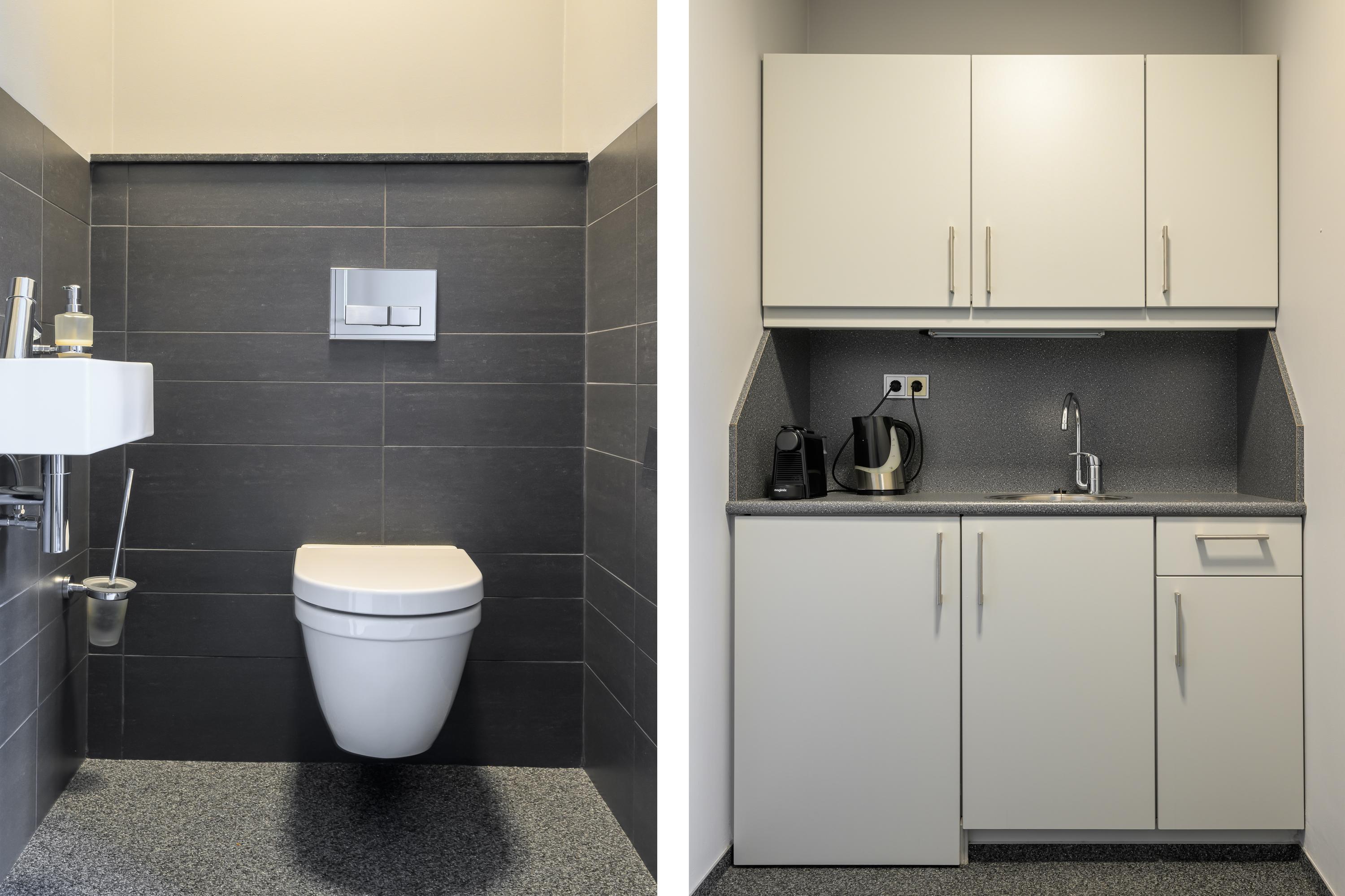 Het kantoorgedeelte bevindt zich aan de andere kant van de woning en is bereikbaar via de woonkamer of een eigen ingang. De hal leidt naar een toilet en meterkast, met drie kantoorkamers voorzien van opbergruimte, een kitchenette en een berging.