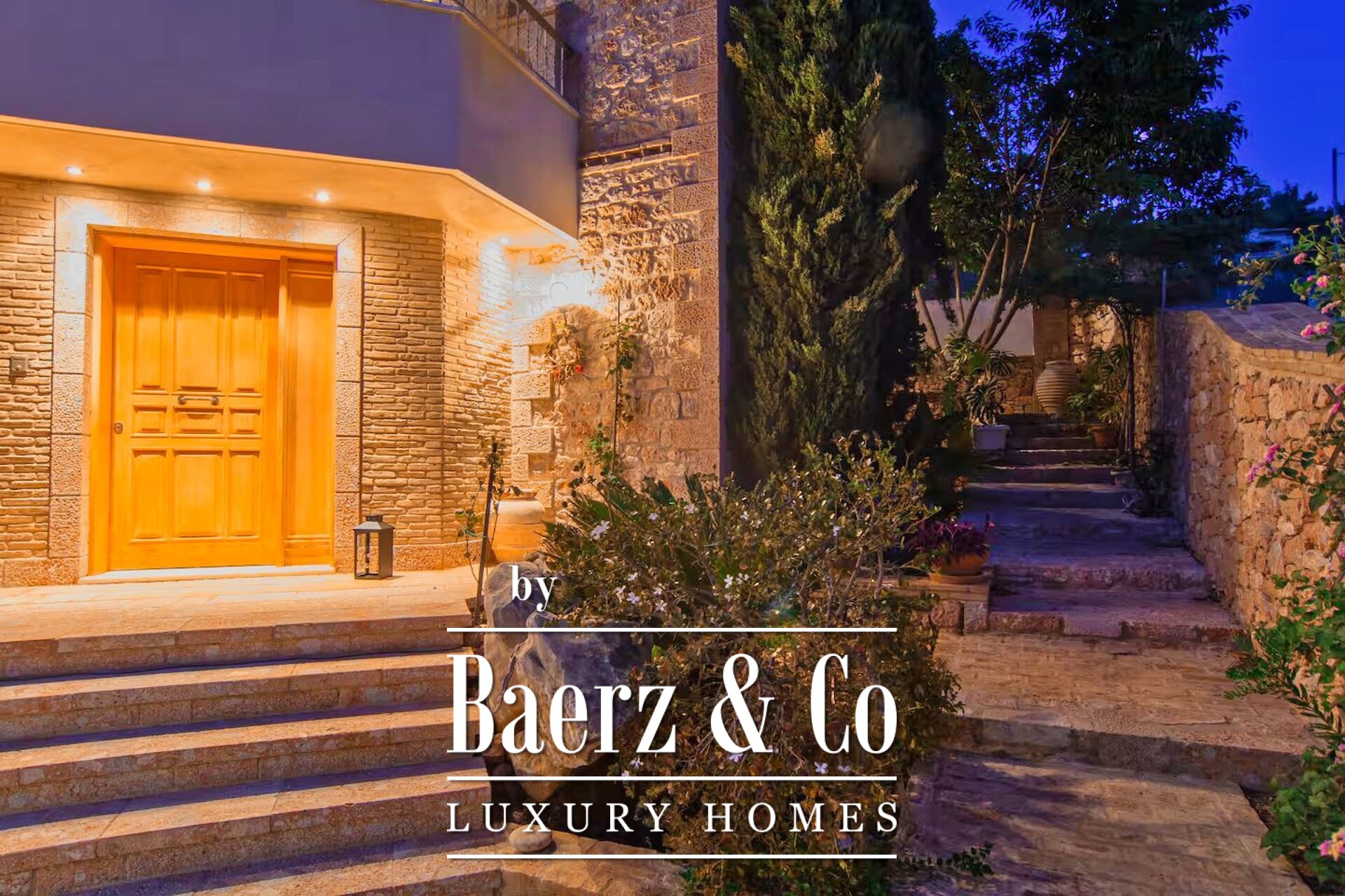 Villa Korfos anchors itself in the tranquil rhythms of the Saronic coastline, just 250 meters from the sea. This villa Korfos property extends across 335 m² over three considered levels, designed for those who value light, privacy, and enduring quality. Panoramic 180-degree sea views define the atmosphere, visible from generous verandas and the serene interiors.
