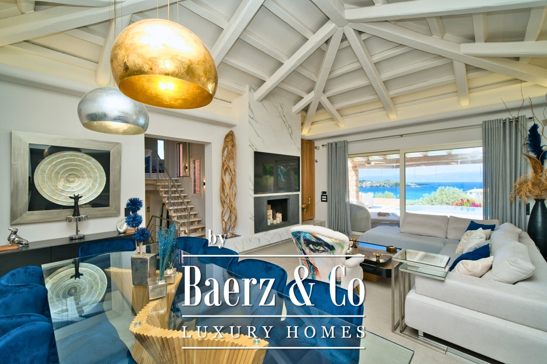 bedroom with a luxurious ensuite bathroom and panoramic sea views, providing a private retreat. The basement adds convenience with an additional living room, kitchenette, two bedrooms, two stylish bathrooms, storage, laundry facilities, and direct garage access. Outside, a sprawling oasis includes a large swimming pool, sitting/dining areas, BBQ space, outdoor storage, and WC. The meticulously landscaped garden enhances the enchanting atmosphere. With parking for up to four cars, this villa offers ample space for guests. It's a harmonious blend of modern luxury, Mediterranean charm, and breathtaking vistas, offering more than just a residence— a lifestyle. Contact us to experience the magic of Ververoda, Porto Heli, for yourself.