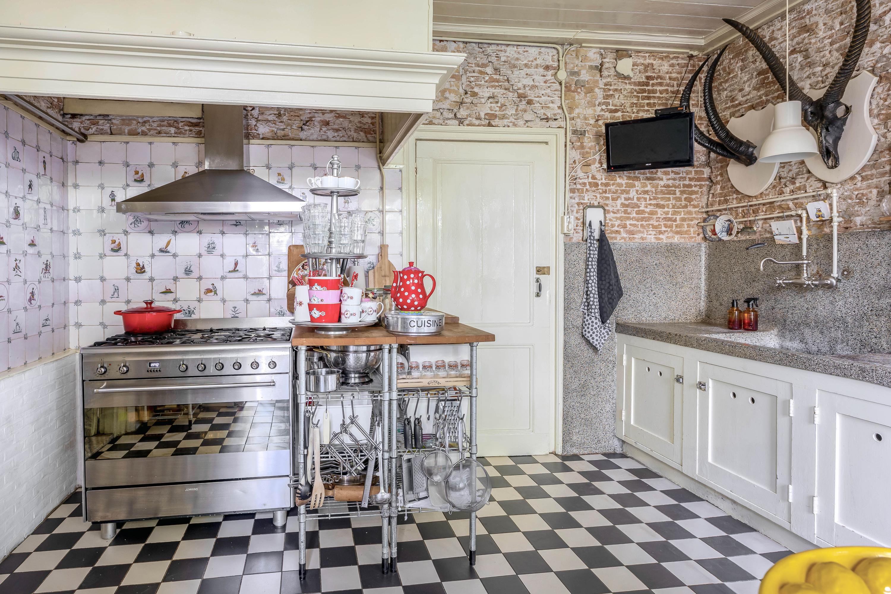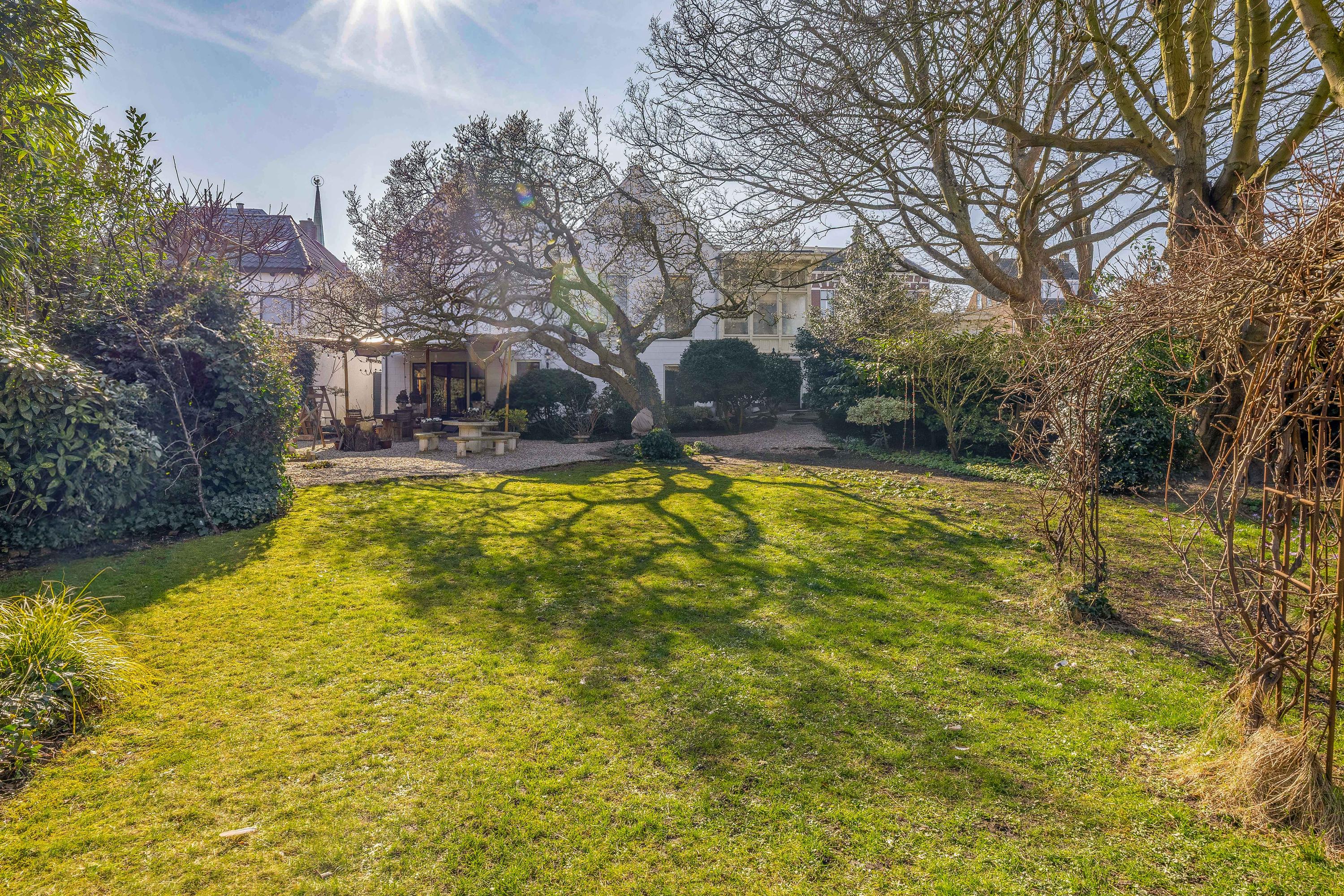 In the basement, there’s a country-style kitchen, a cozy garden room with French doors to the garden, several cellar rooms, and a wine cellar.