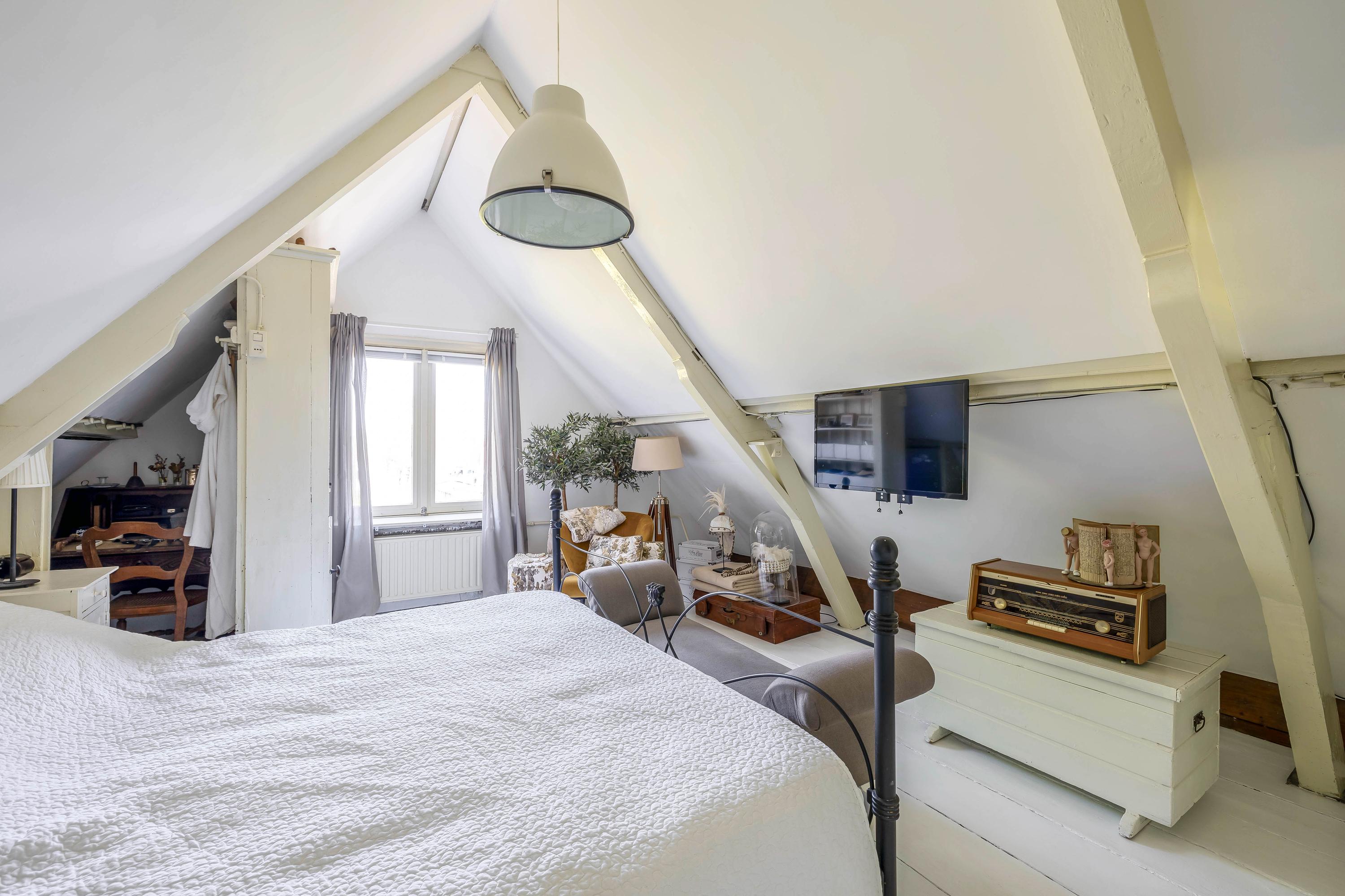 At dike level, you’ll find the charming living room with fireplace and ceiling mural, a dining room connected to the stunning conservatory via sliding doors, a bedroom, and a bathroom with an antique bathtub.