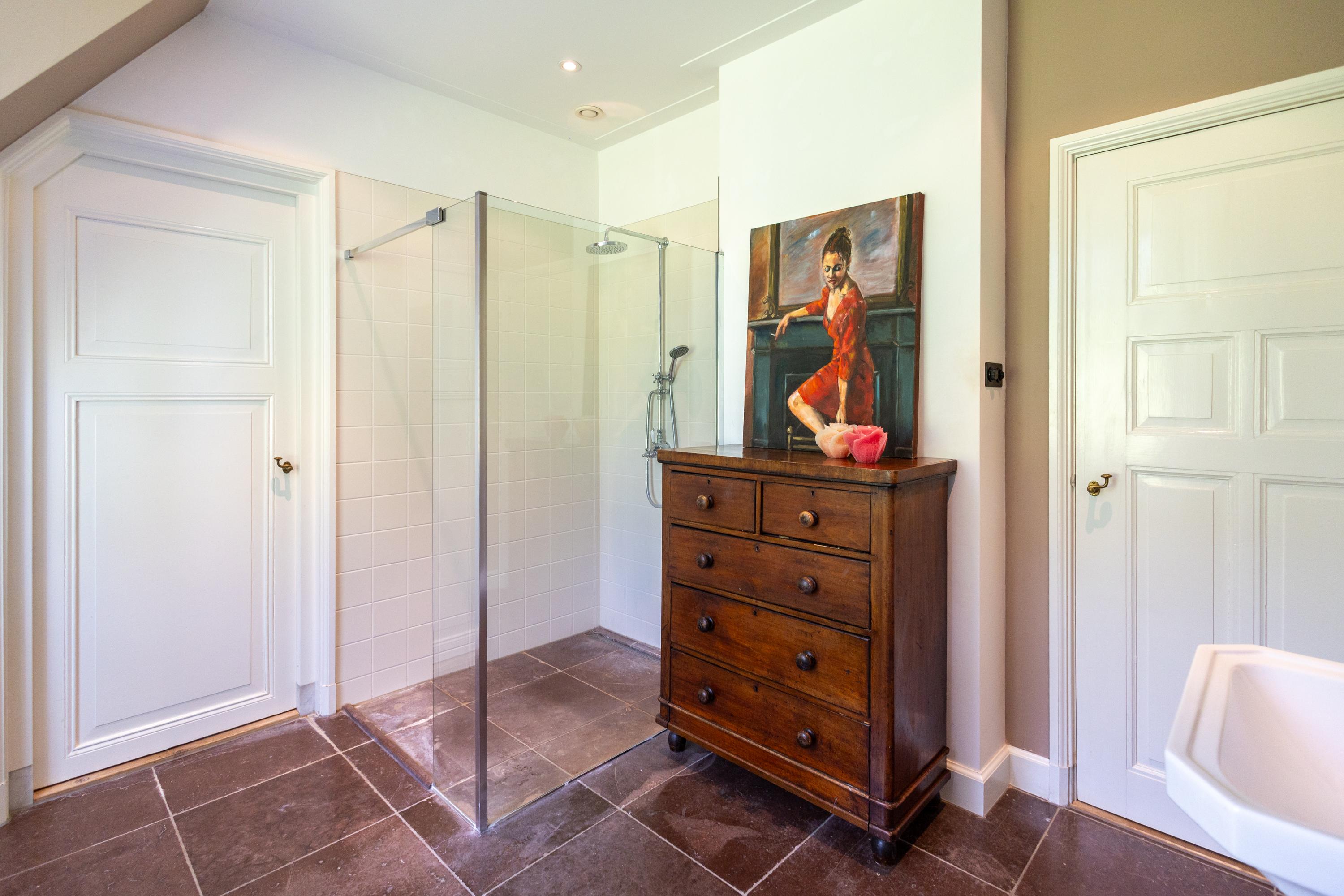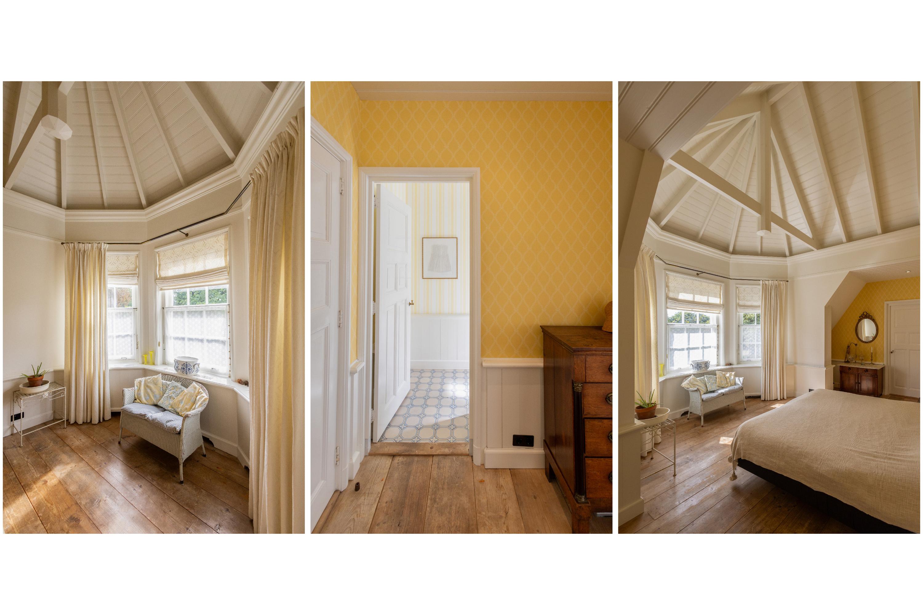 Continuing up the staircase, the second floor reveals a charming attic room, also with a private bathroom.