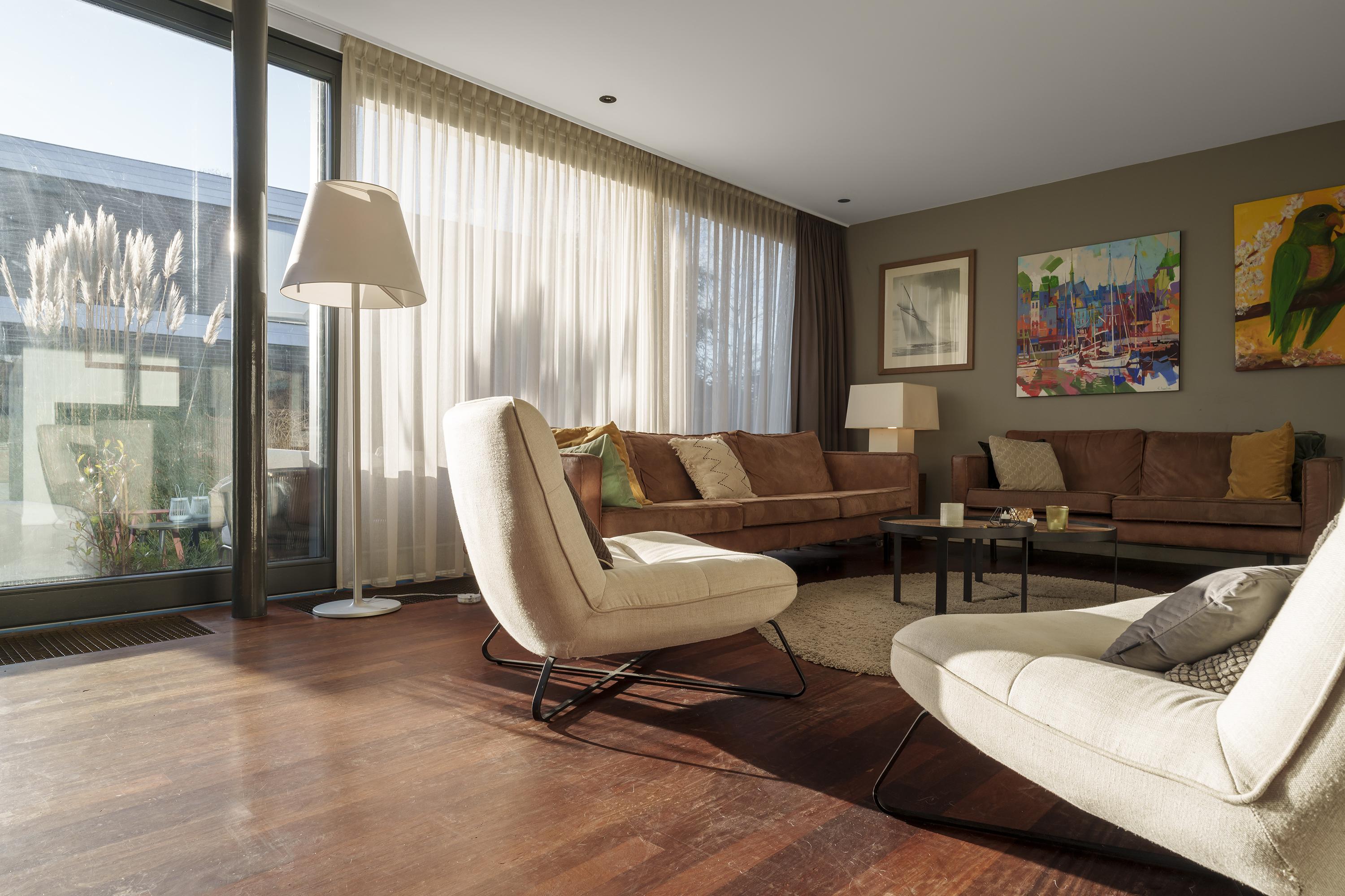 In the beautiful and spacious garden of the cubist-built house are several nice sitting areas, including a large lounge/bbq terrace at the back of the garden and an outdoor sauna for six for total relaxation after a day's work....!