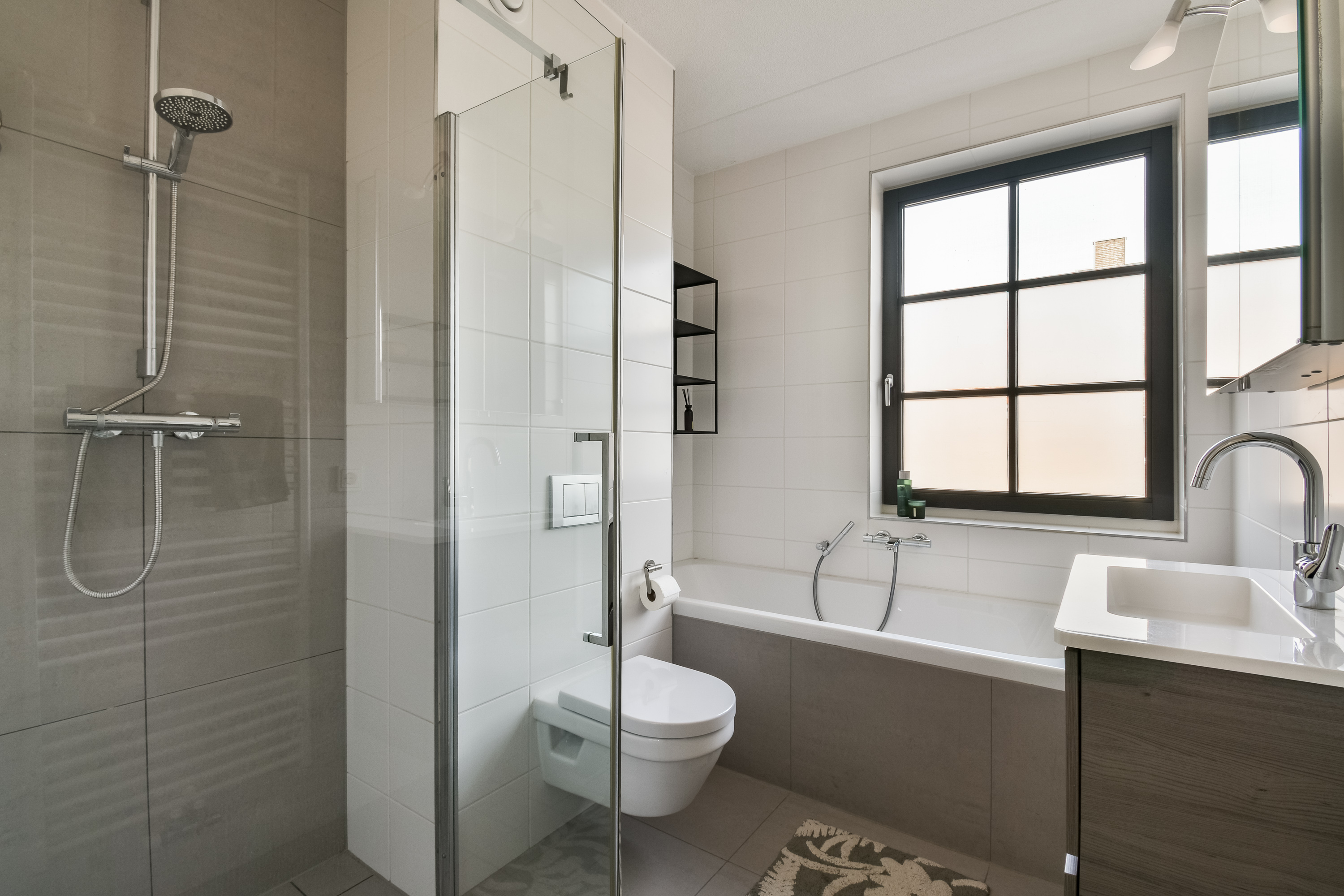 Through the entrance you enter the hallway with meter cupboard and a modern wall-mounted toilet with washbasin. At the front of the house is the open kitchen, equipped with various built-in appliances and a spacious countertop. The living room is located at the rear, with French doors providing access to the beautifully landscaped backyard. The ground floor also features a practical storage cupboard under the stairs.