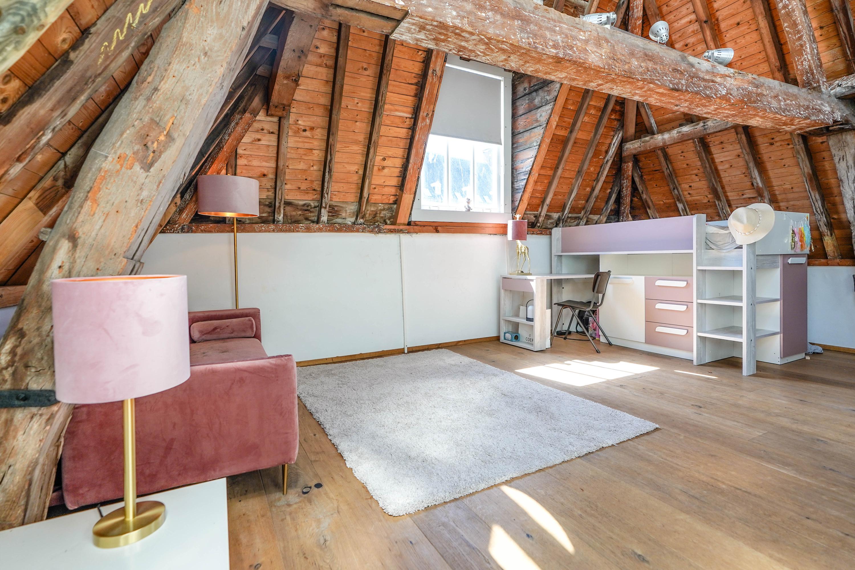This example of 17th-century wealth is located along the water of the Rhine at the foot of the castle hill. As usual at that time, the face of the facade was modest, almost even subdued. However, this was more than compensated for inside. The prosperity was exuberantly displayed: richly decorated natural stone fireplaces and opulent stuccowork adorn the ground floor. After all, this is where guests were received and people had to impress. Although the centuries have passed, much of the original wealth of this building has been retained and the current owner has completely modernized it. In addition, both floors and the rear house are characterized by large and high rooms, where heavy oak beams and impressive roof structures with large and high windows provide light and views.