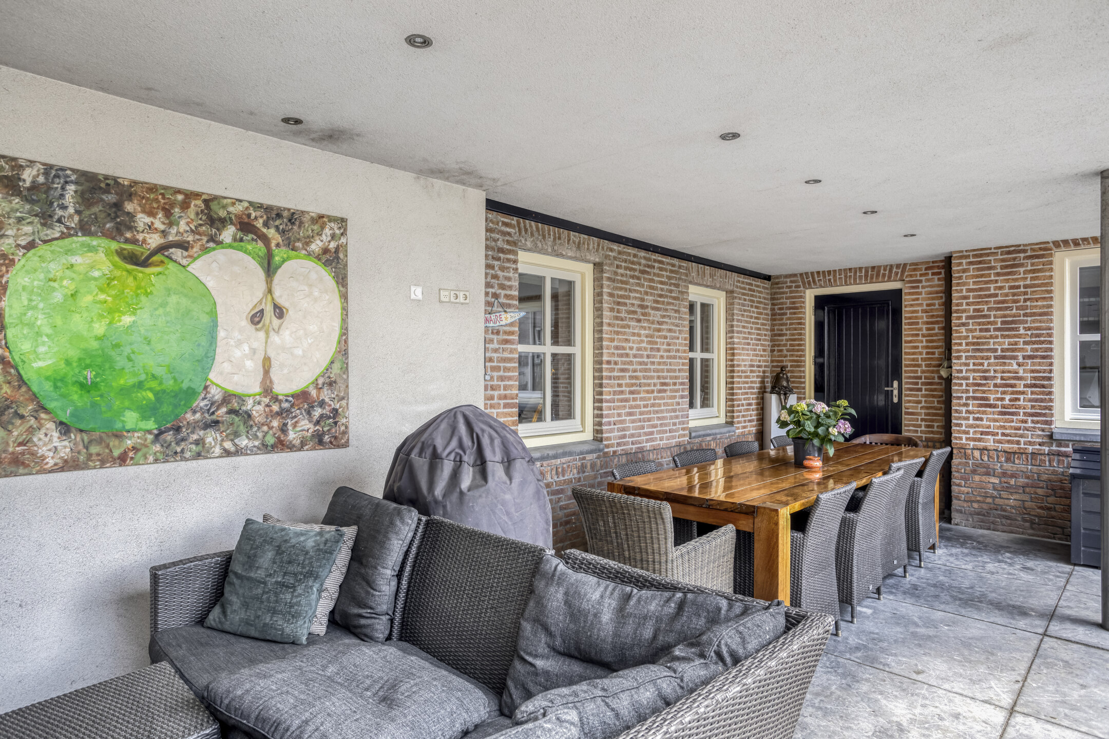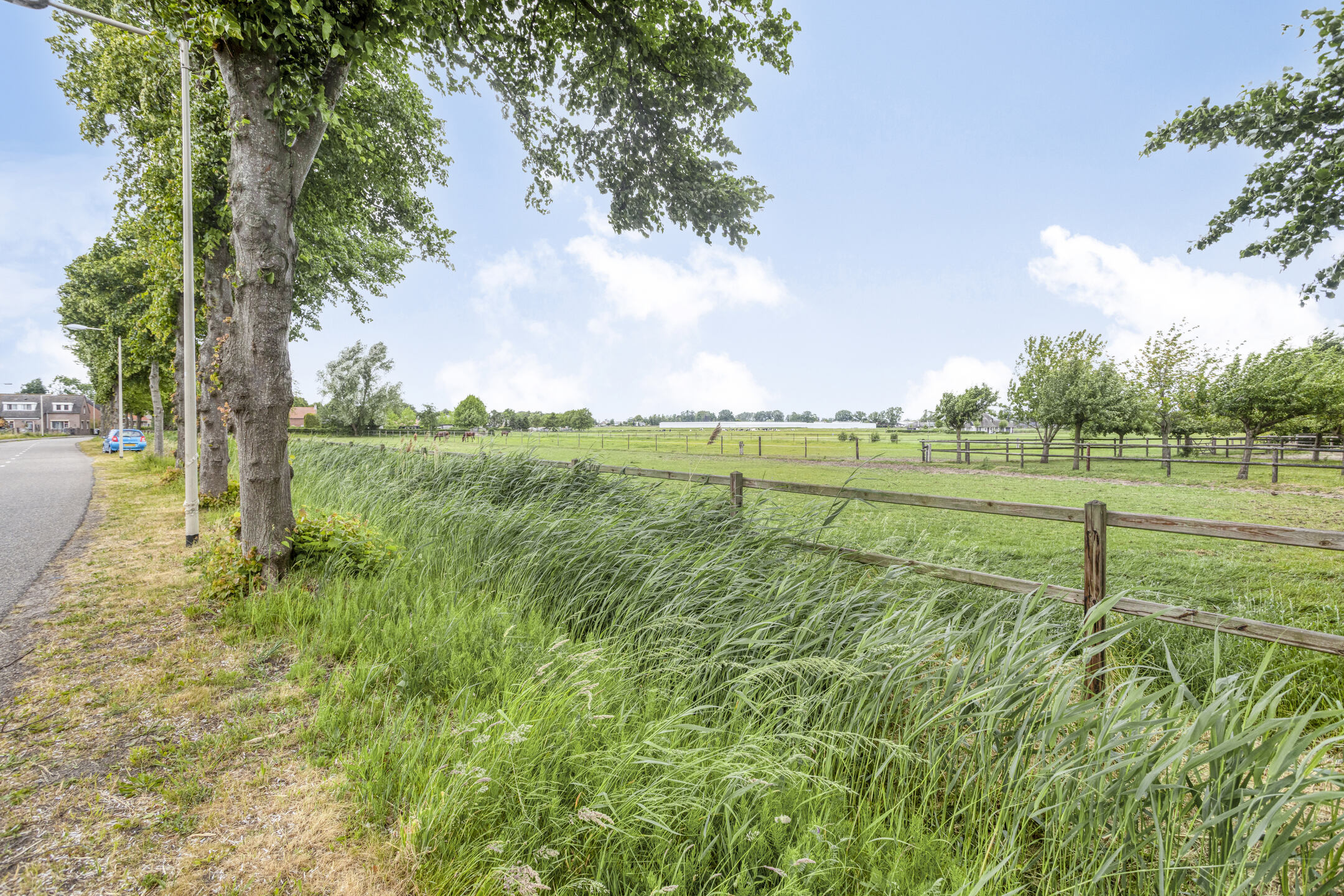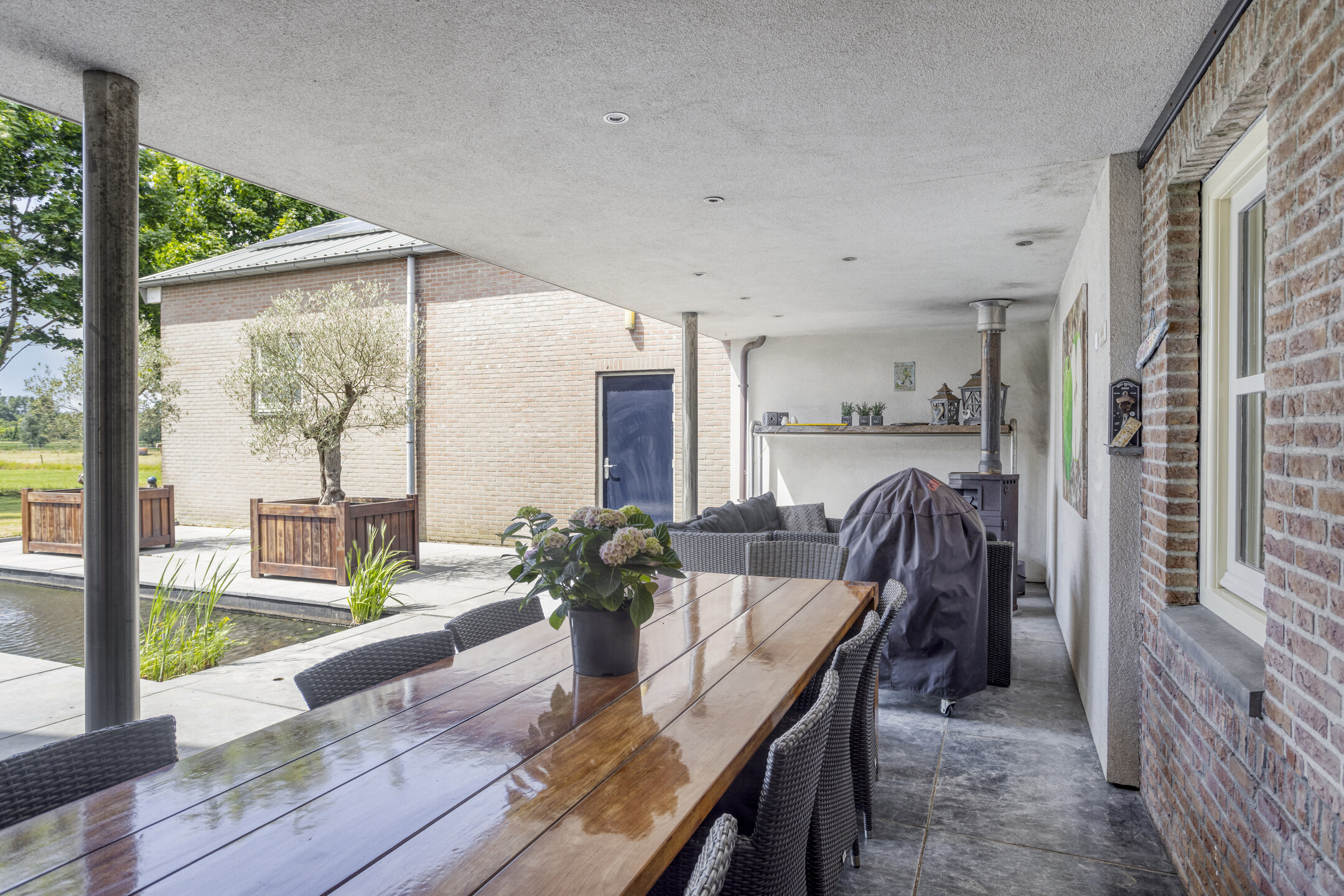 Aangelegde tuin rondom, terras bestraat met natuursteen, voorzien van een veranda tussen woning en loods, borders, gazon, vijverpartij, vrij uitzicht over de landerijen, vrij pad langs de woning t.b.v. achterom, lange oprijlaan overlopend in voorterrein als aangelegd met gebakken klinkers vv. straatkolken, deels betonklinkers en een groen plein, grotendeels omheind vv. elektrische poort met beeldcamera.