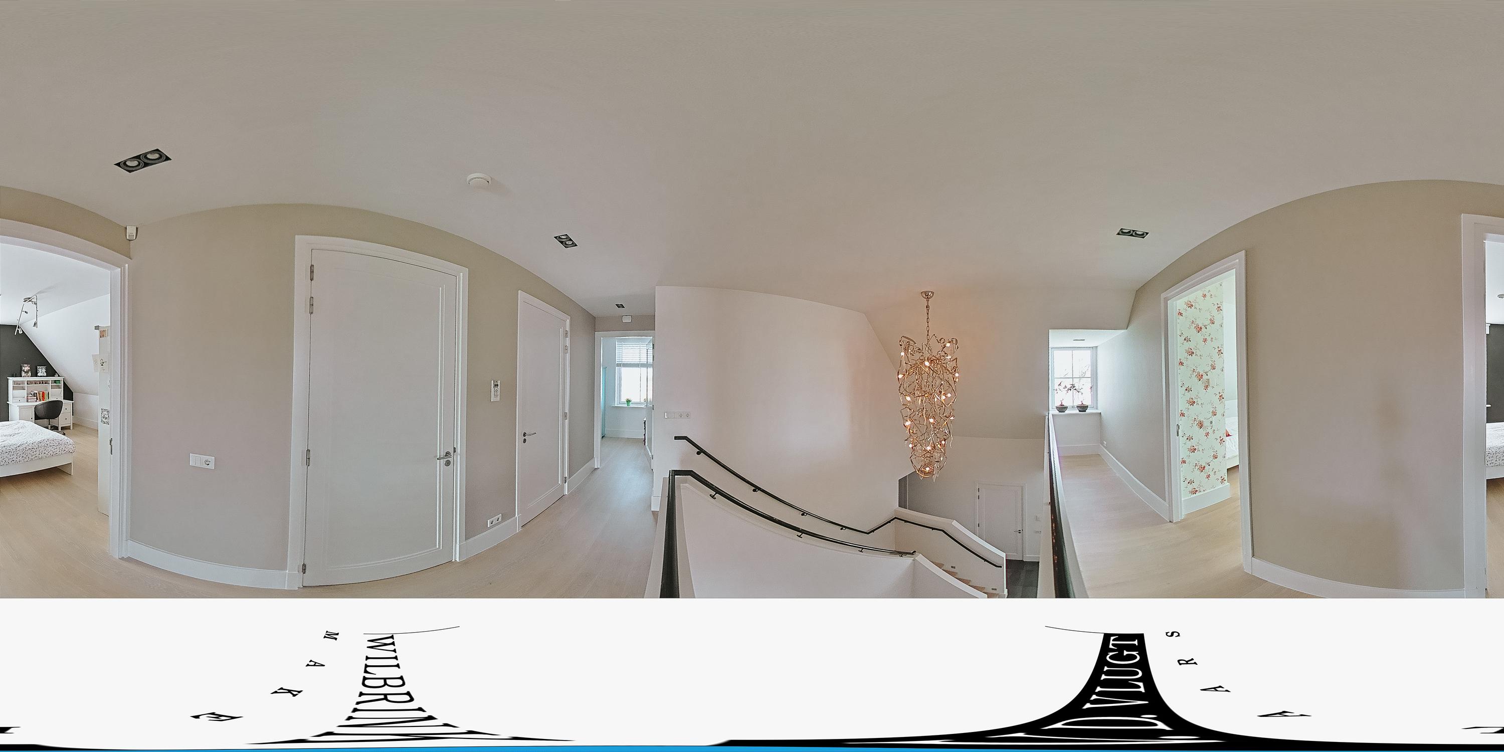 The illuminated, centrally located staircase leads us to the sleeping area, where there are four spacious bedrooms with beautiful views, a second luxurious bathroom, and a separate toilet. The staircase at the rear of the house leads to a very large room with built-in cupboards and six dormer windows, which is currently used as a study. Here, too, we can enjoy beautiful views.