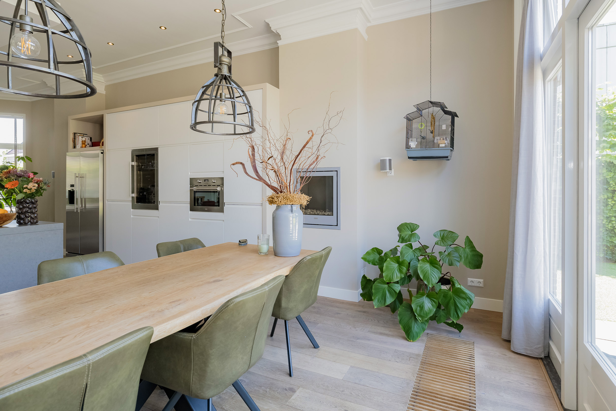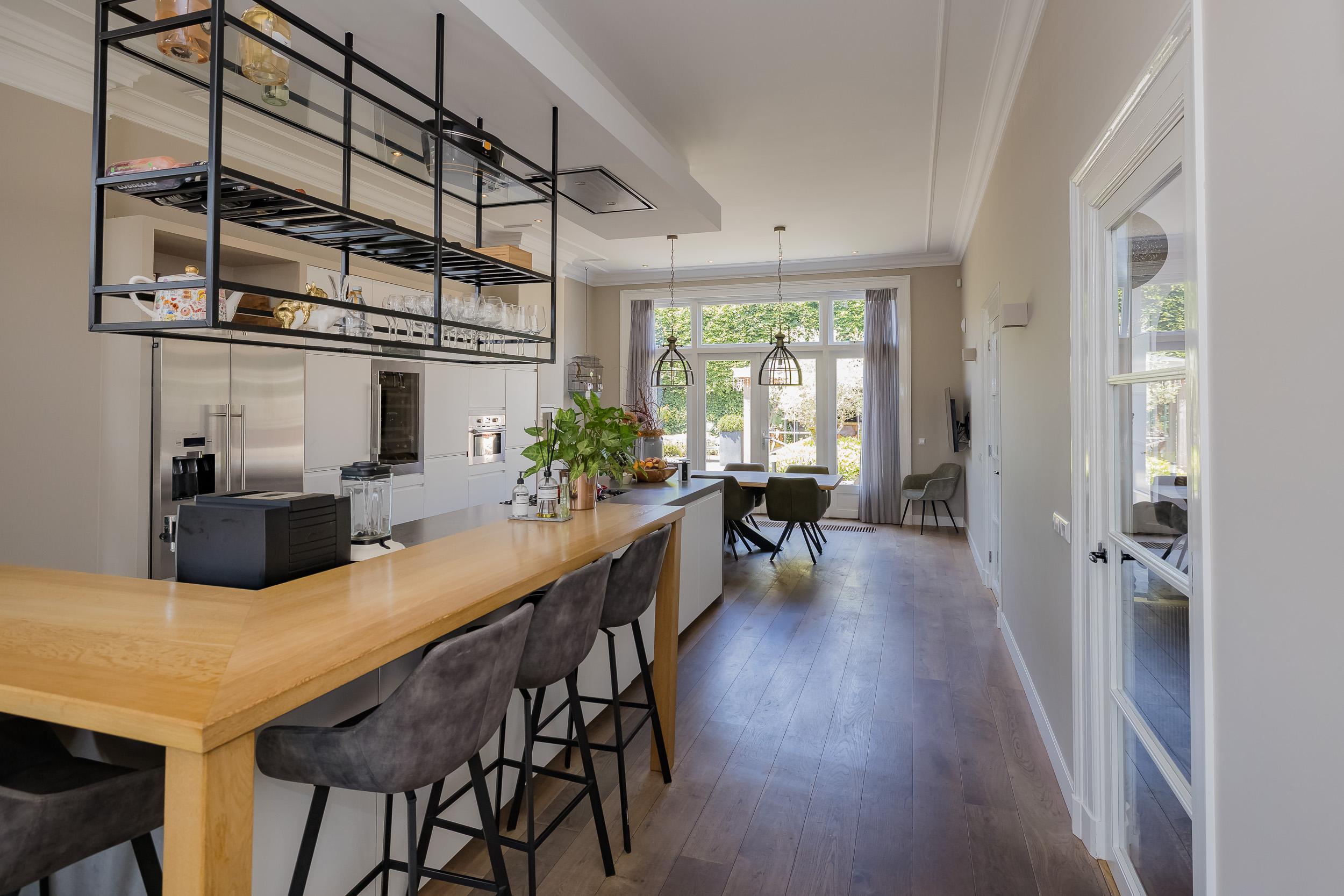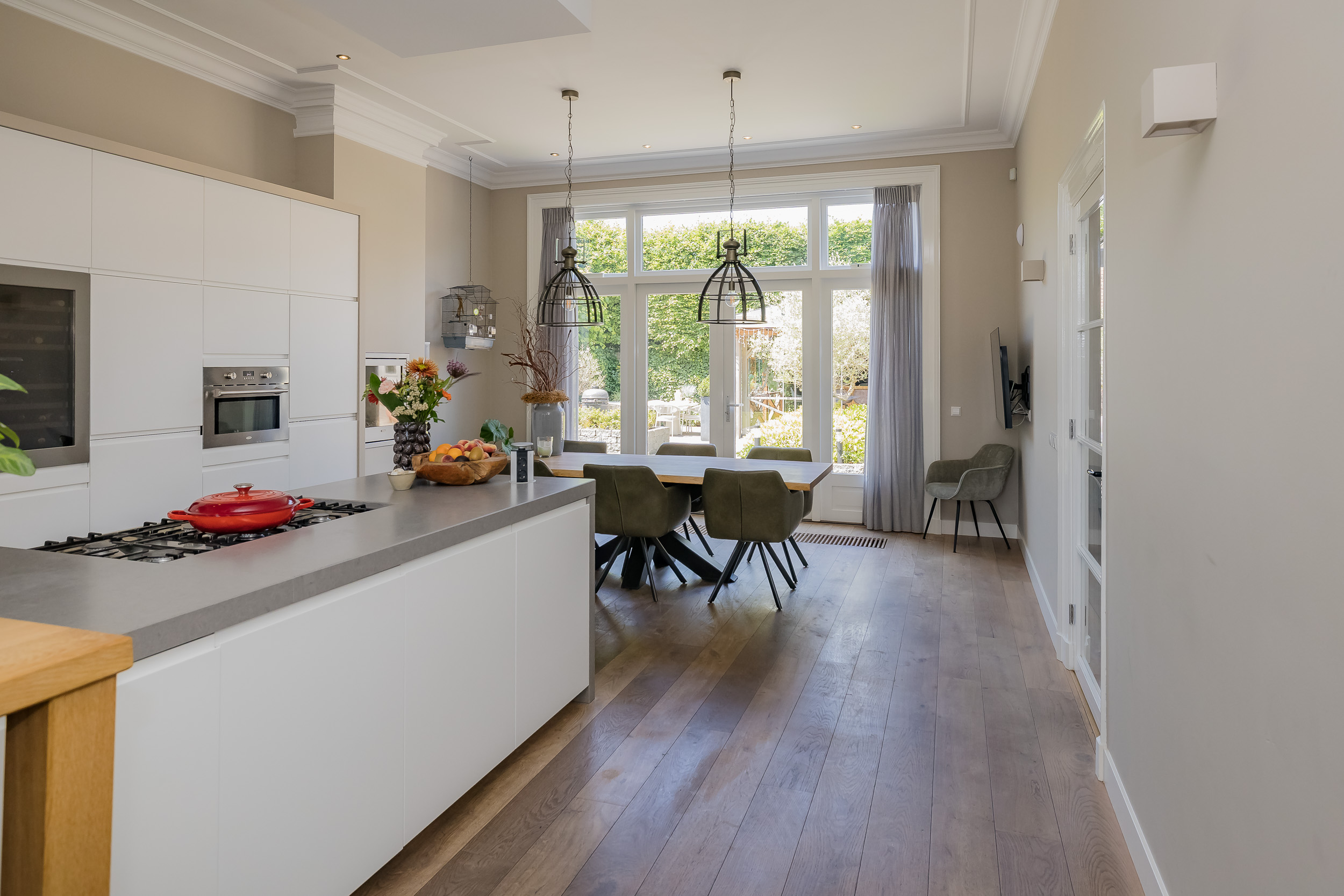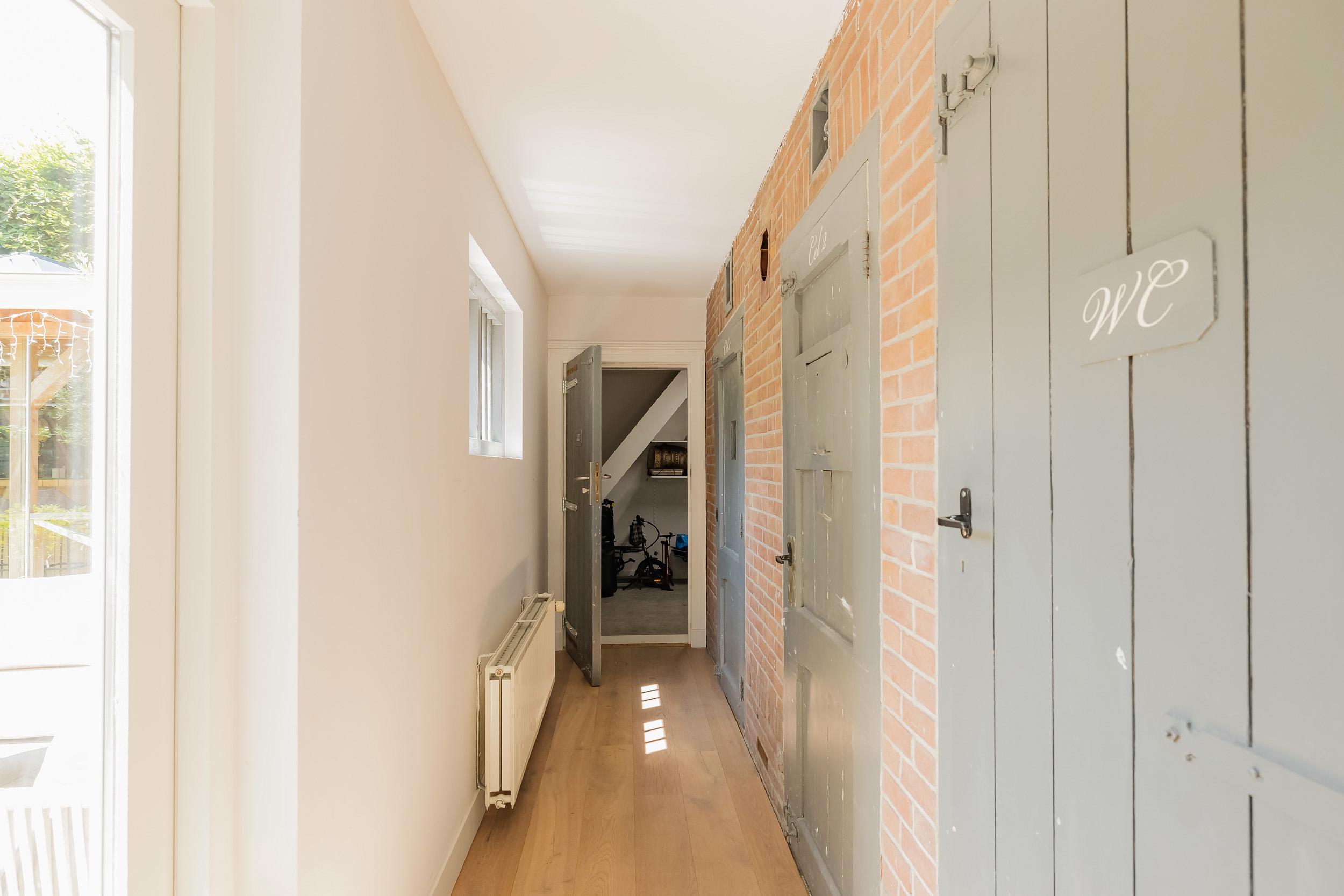 Beautiful porch in which the striking high front door, imposing long hall with the restored authentic granito floor, checkroom and toilet room and a door to the garden. To the left of the hall a very spacious living/living kitchen with luxury kitchen design in matte white, beautiful cooking and sink island with wooden breakfast bar and all appliances including a beautiful wine refrigerator. Also a cozy gas fireplace and the large rear facade with lots of glass and French doors to the garden are not lacking. To the right of the hall there is a TV/sitting room with a gas fireplace and double doors give access to the upstairs room. This upstairs room with a large custom-made closet wall is very suitable as a play/or work room and has a staircase to the large dry cellar with standing height. In the former cell complex is a beautiful study created, a storage room, a technical room and there is one cell preserved in its original state. The indoor garage is large and includes an electric segment door with wicket door and a fixed staircase to spacious storage attic.