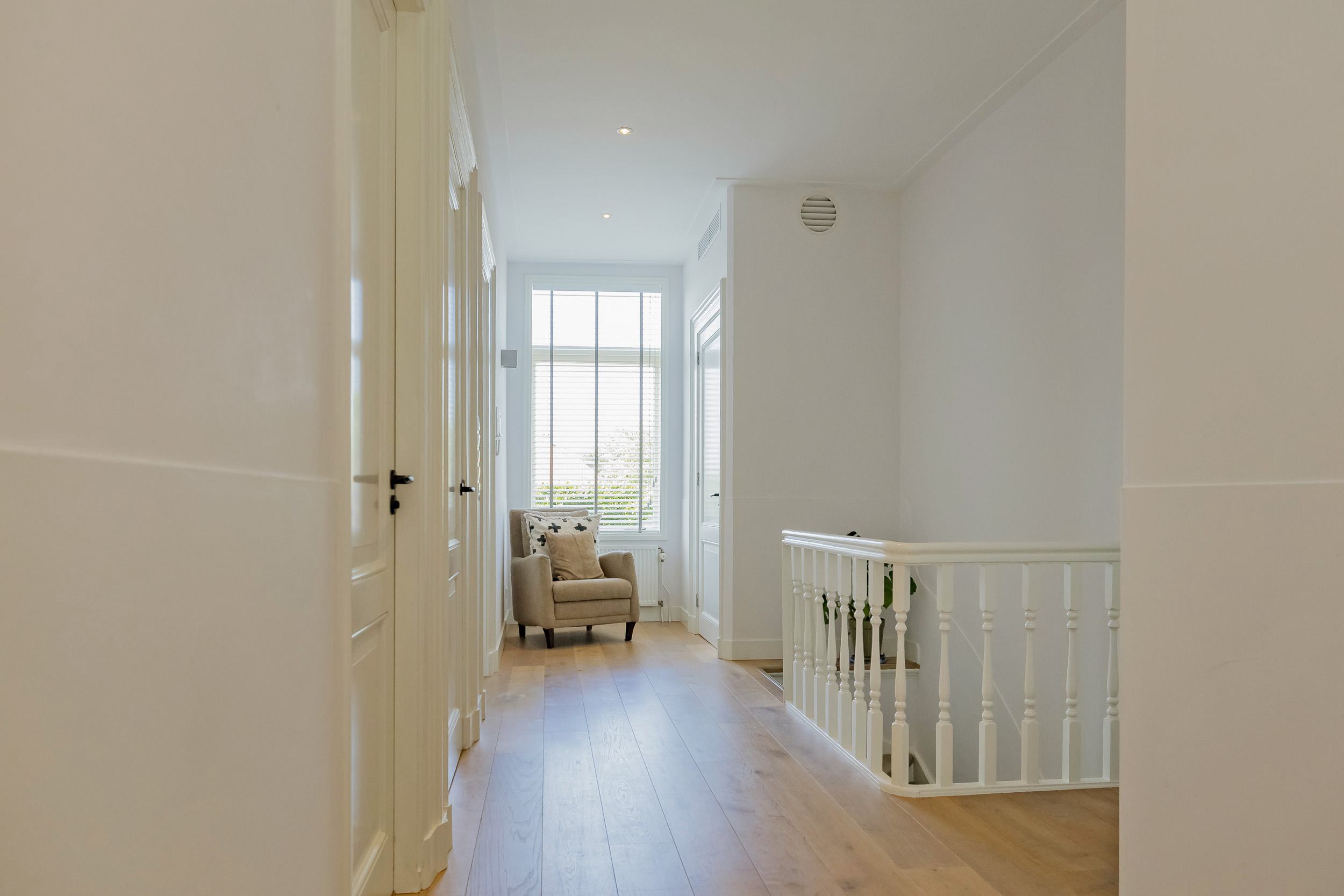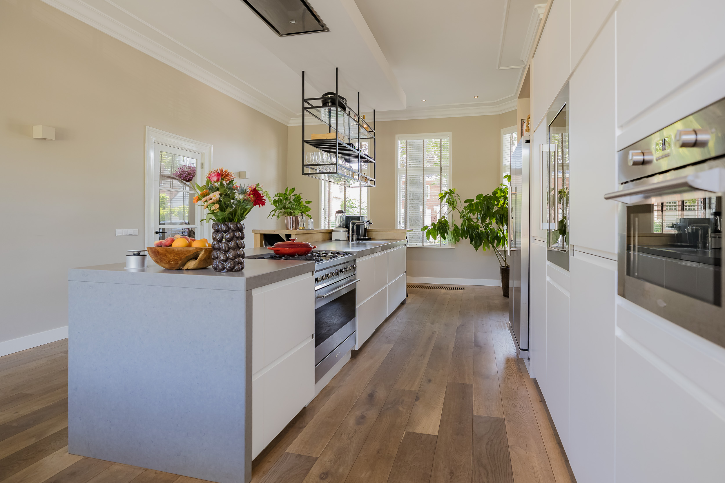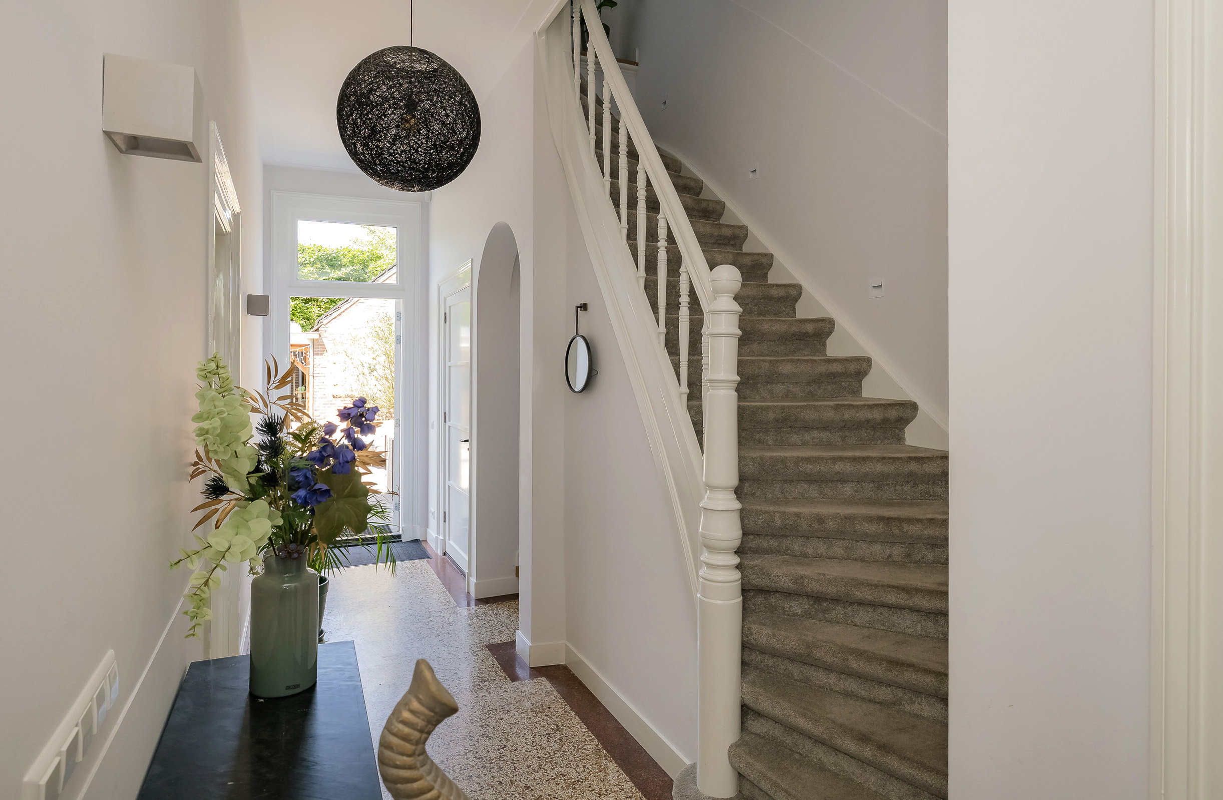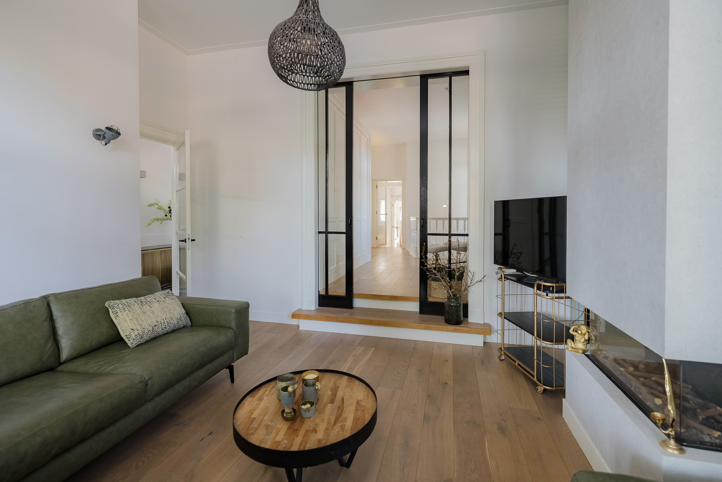 Beautiful porch in which the striking high front door, imposing long hall with the restored authentic granito floor, checkroom and toilet room and a door to the garden. To the left of the hall a very spacious living/living kitchen with luxury kitchen design in matte white, beautiful cooking and sink island with wooden breakfast bar and all appliances including a beautiful wine refrigerator. Also a cozy gas fireplace and the large rear facade with lots of glass and French doors to the garden are not lacking. To the right of the hall there is a TV/sitting room with a gas fireplace and double doors give access to the upstairs room. This upstairs room with a large custom-made closet wall is very suitable as a play/or work room and has a staircase to the large dry cellar with standing height. In the former cell complex is a beautiful study created, a storage room, a technical room and there is one cell preserved in its original state. The indoor garage is large and includes an electric segment door with wicket door and a fixed staircase to spacious storage attic.