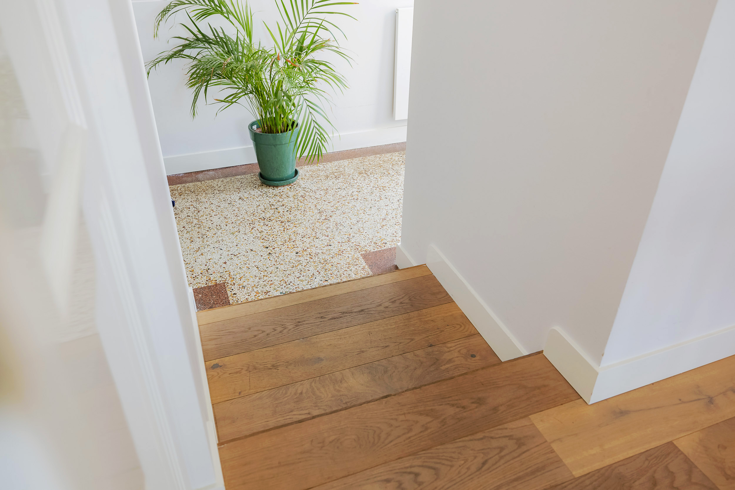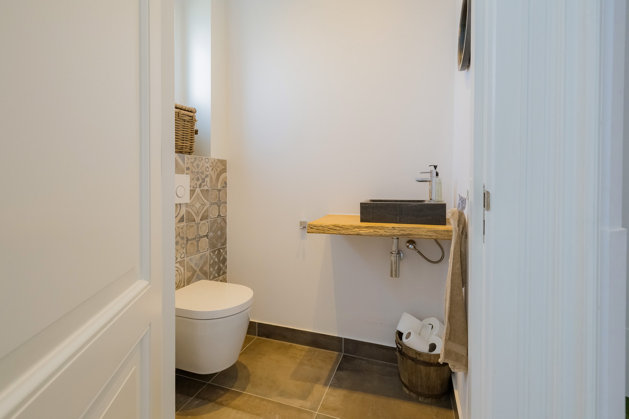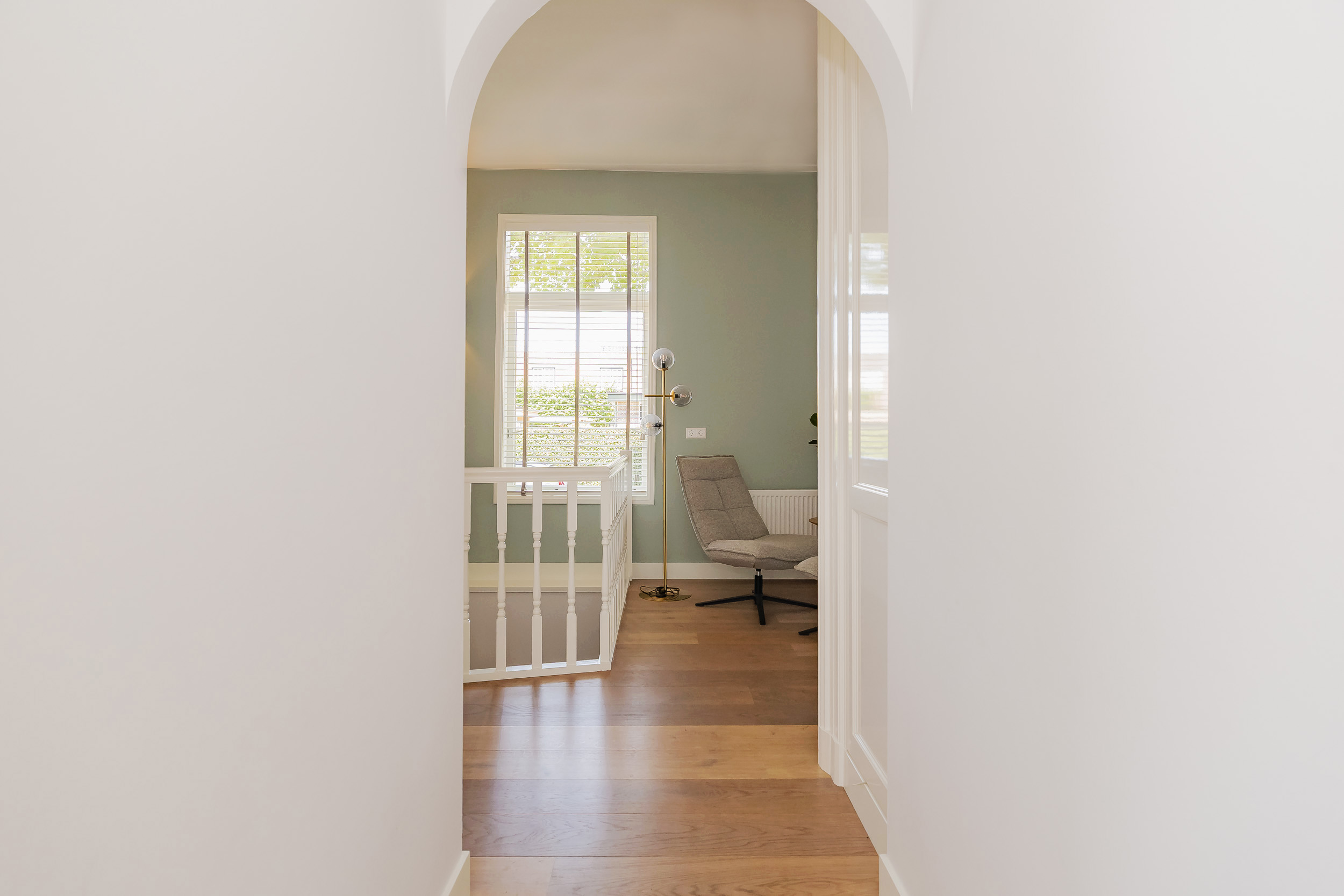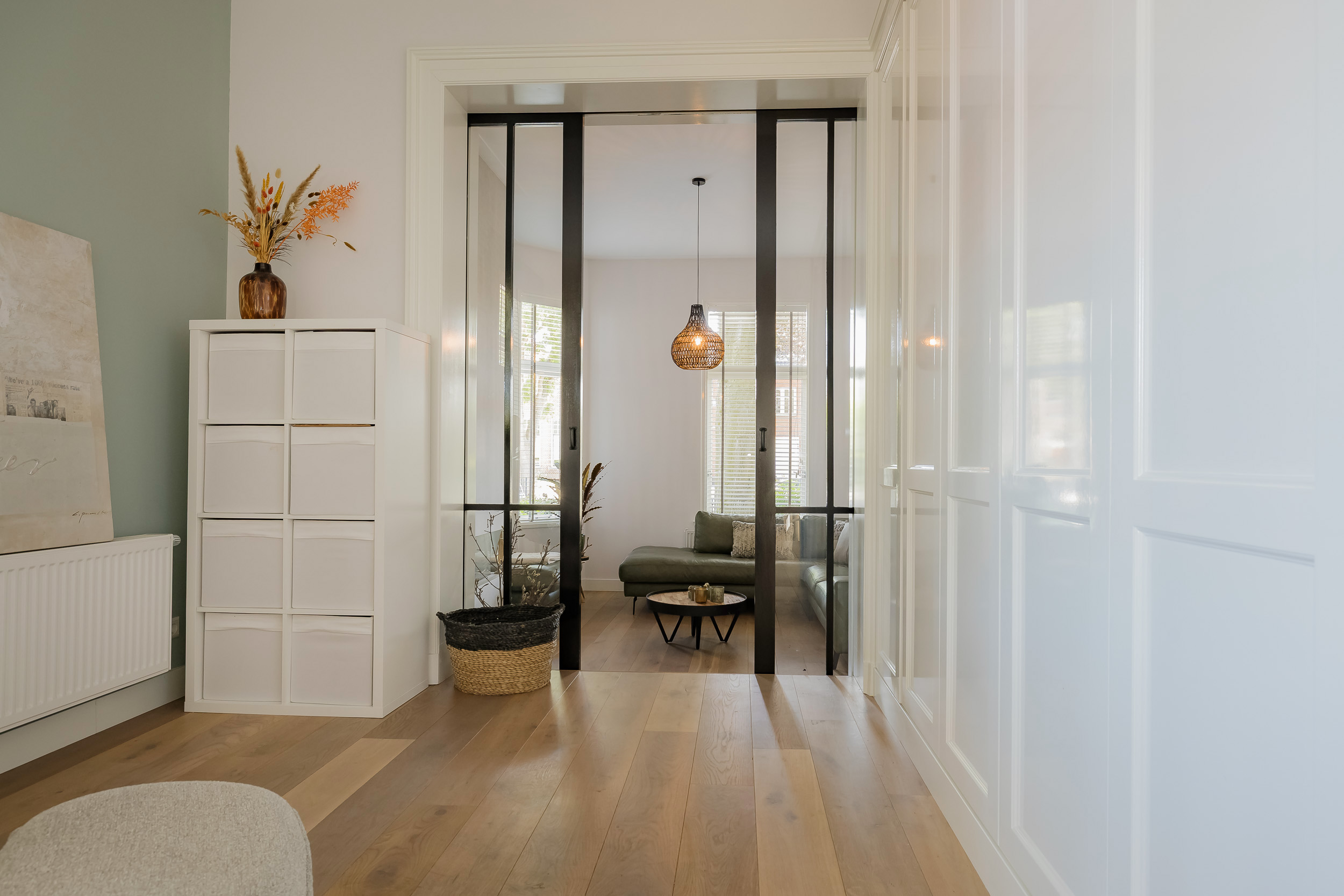 Beautiful porch in which the striking high front door, imposing long hall with the restored authentic granito floor, checkroom and toilet room and a door to the garden. To the left of the hall a very spacious living/living kitchen with luxury kitchen design in matte white, beautiful cooking and sink island with wooden breakfast bar and all appliances including a beautiful wine refrigerator. Also a cozy gas fireplace and the large rear facade with lots of glass and French doors to the garden are not lacking. To the right of the hall there is a TV/sitting room with a gas fireplace and double doors give access to the upstairs room. This upstairs room with a large custom-made closet wall is very suitable as a play/or work room and has a staircase to the large dry cellar with standing height. In the former cell complex is a beautiful study created, a storage room, a technical room and there is one cell preserved in its original state. The indoor garage is large and includes an electric segment door with wicket door and a fixed staircase to spacious storage attic.
