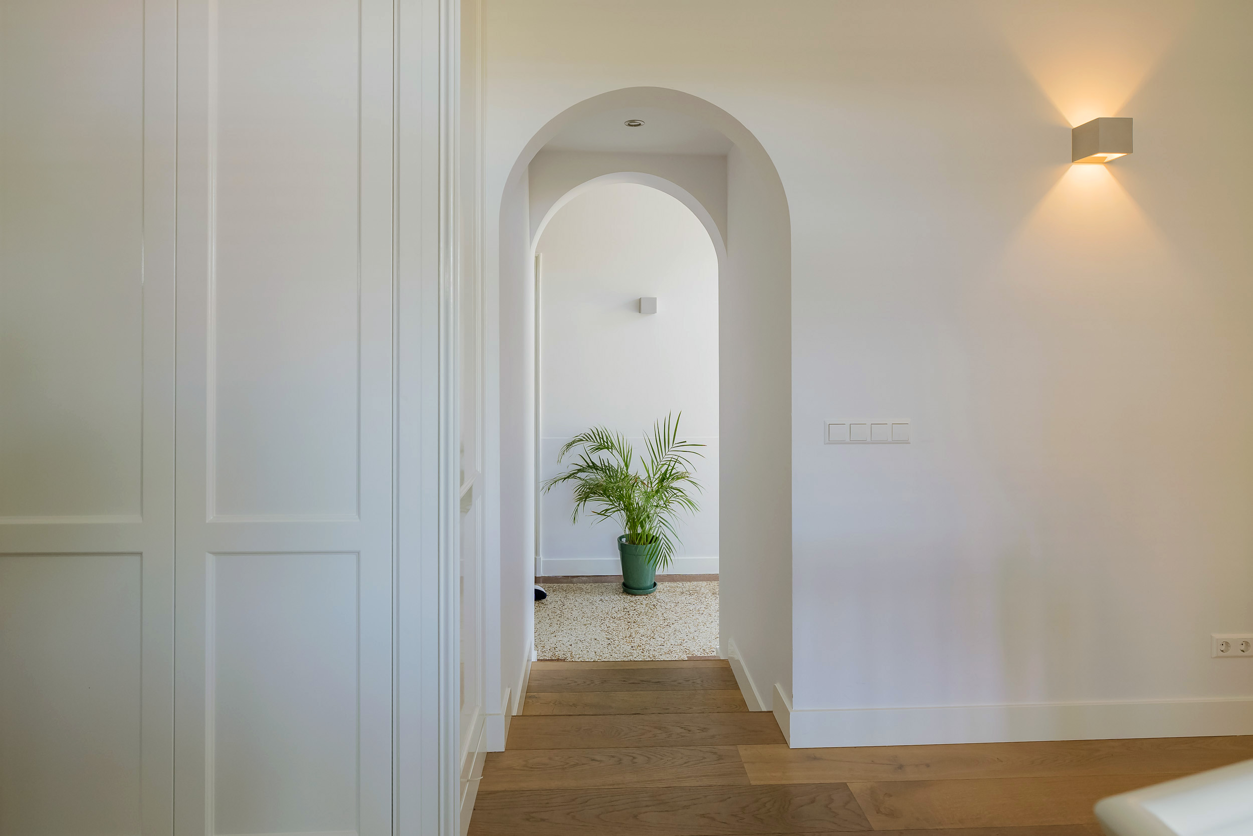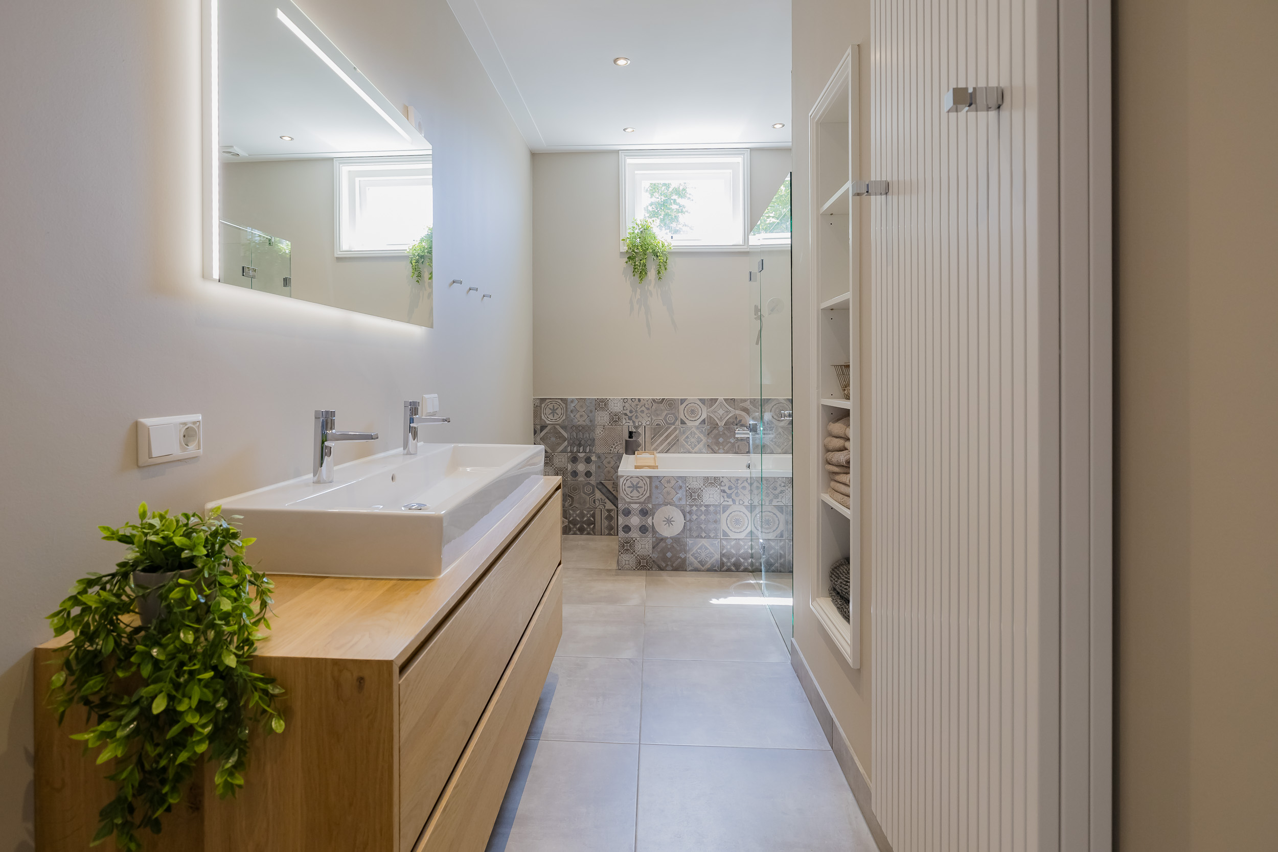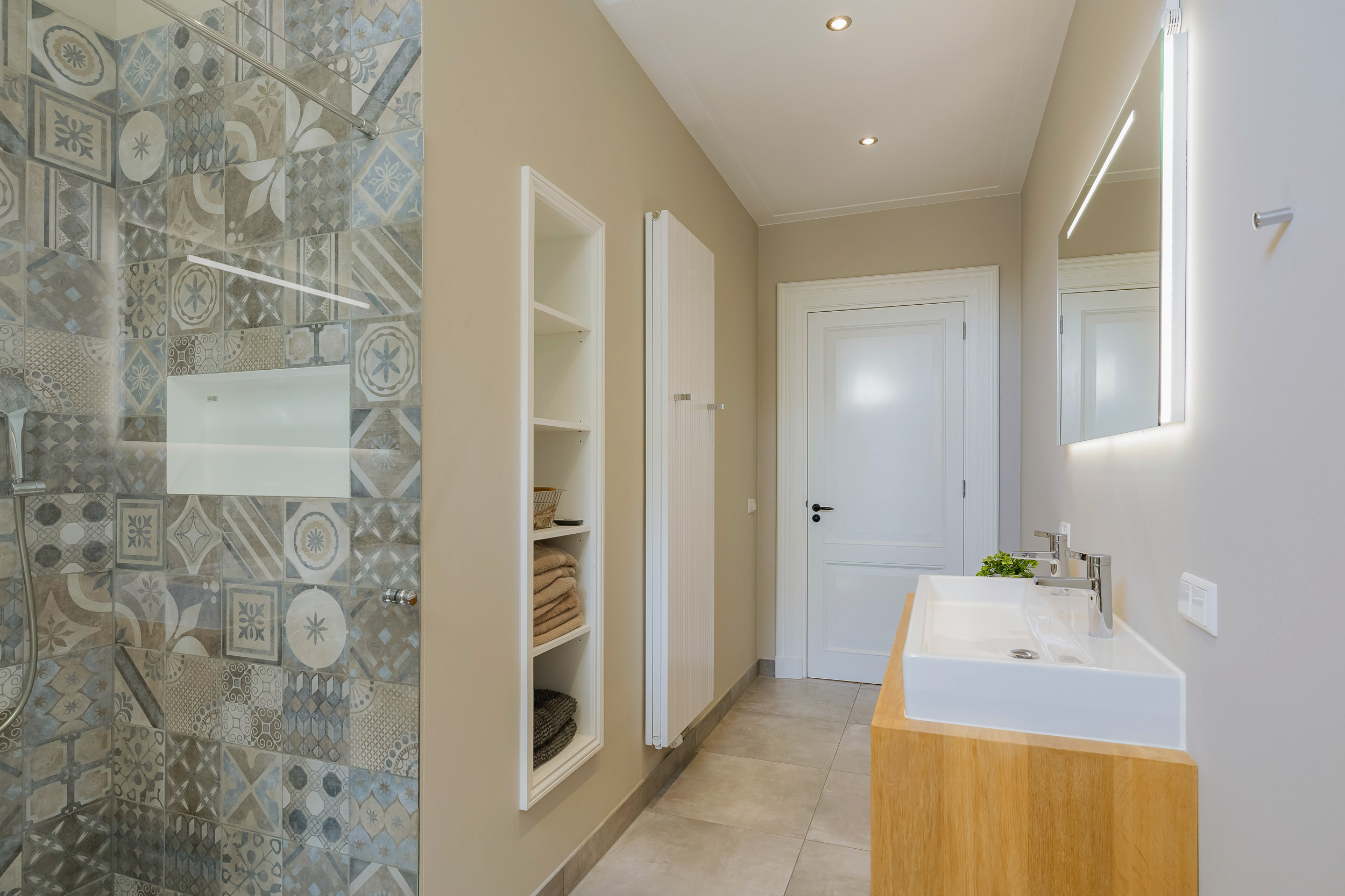 Again an imposing long hall with door to balcony, 3 fantastically large bedrooms with beautiful windows, luxury bathroom with walk-in shower, bathtub and wide sink with 2 taps on wooden furniture, separate 2nd luxury toilet room and 4th very generous laundry/work room.