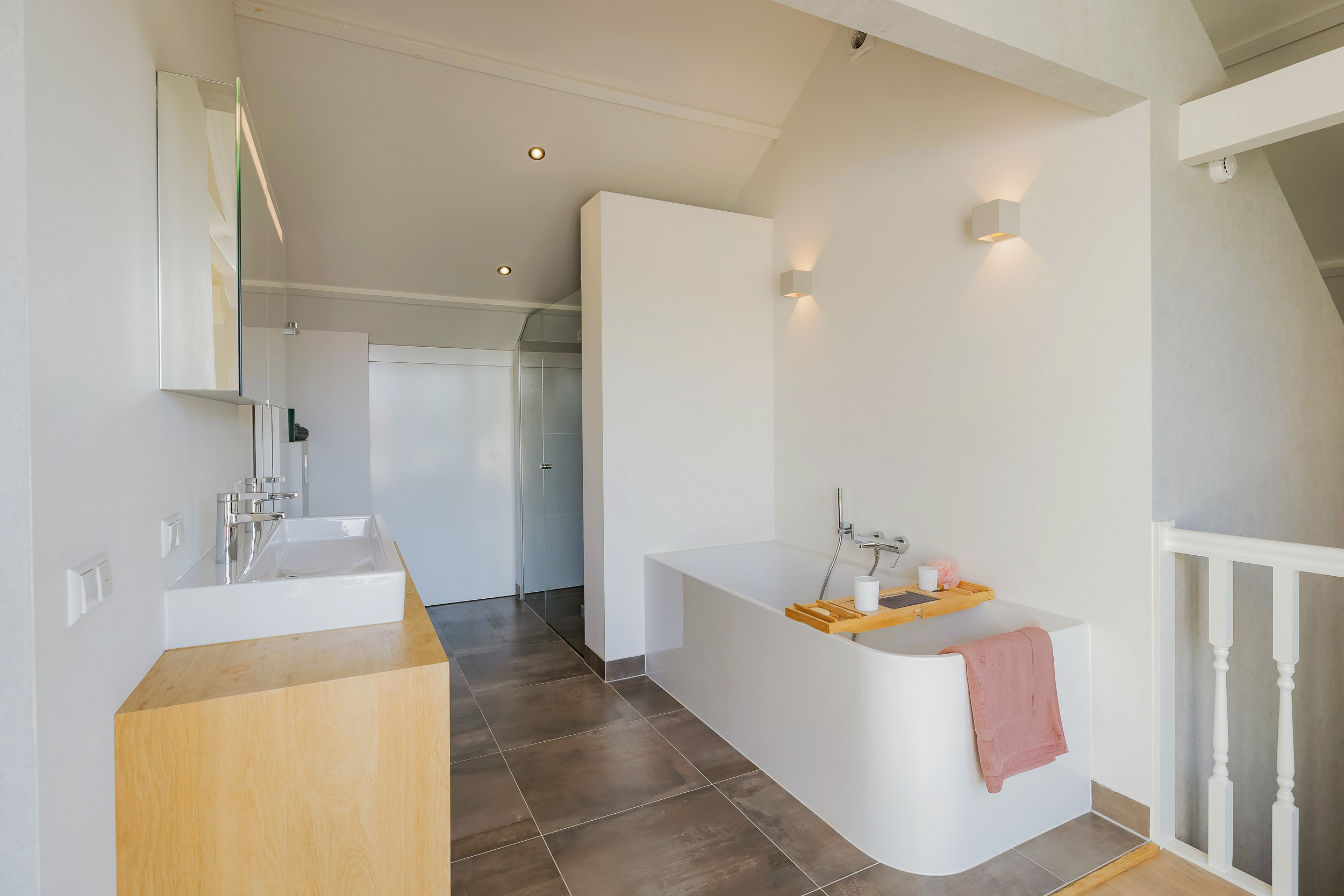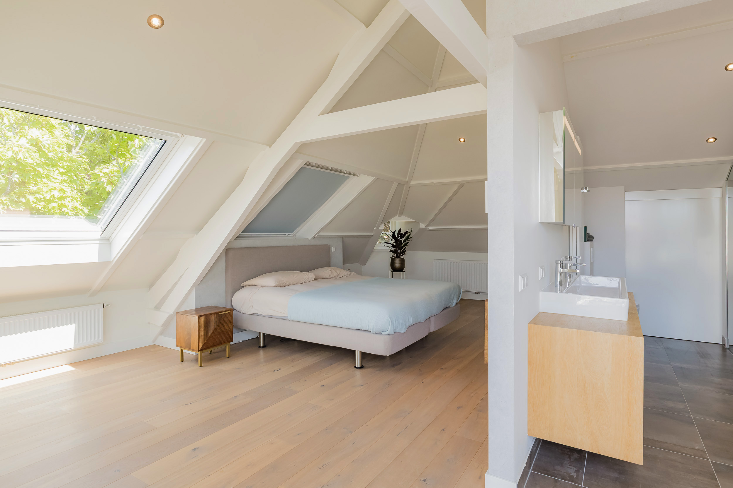 The master bedroom covers the entire floor and features a walled balcony/loggia facing west, walk-in wardrobe and a luxury bathroom with bathtub, walk-in shower, 3rd toilet and wide sink with two taps on wooden furniture.