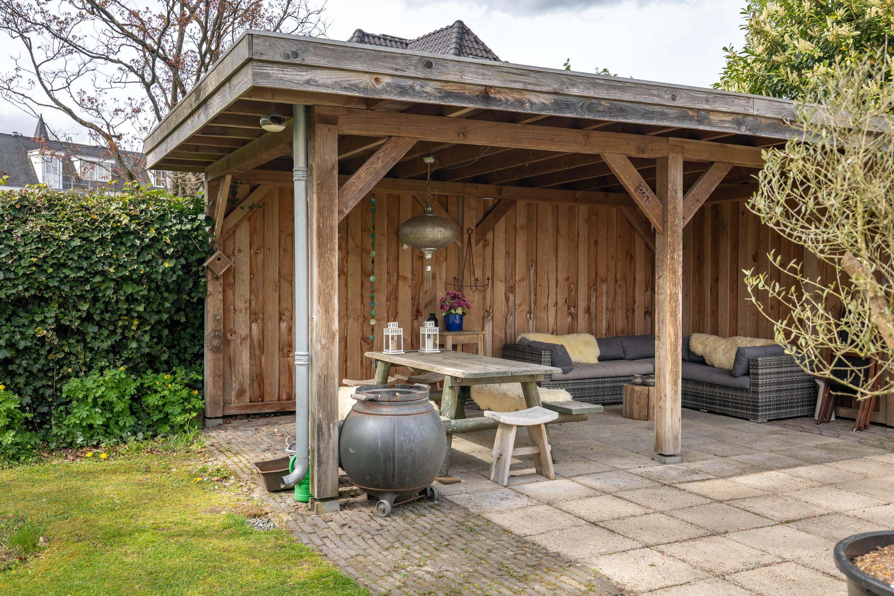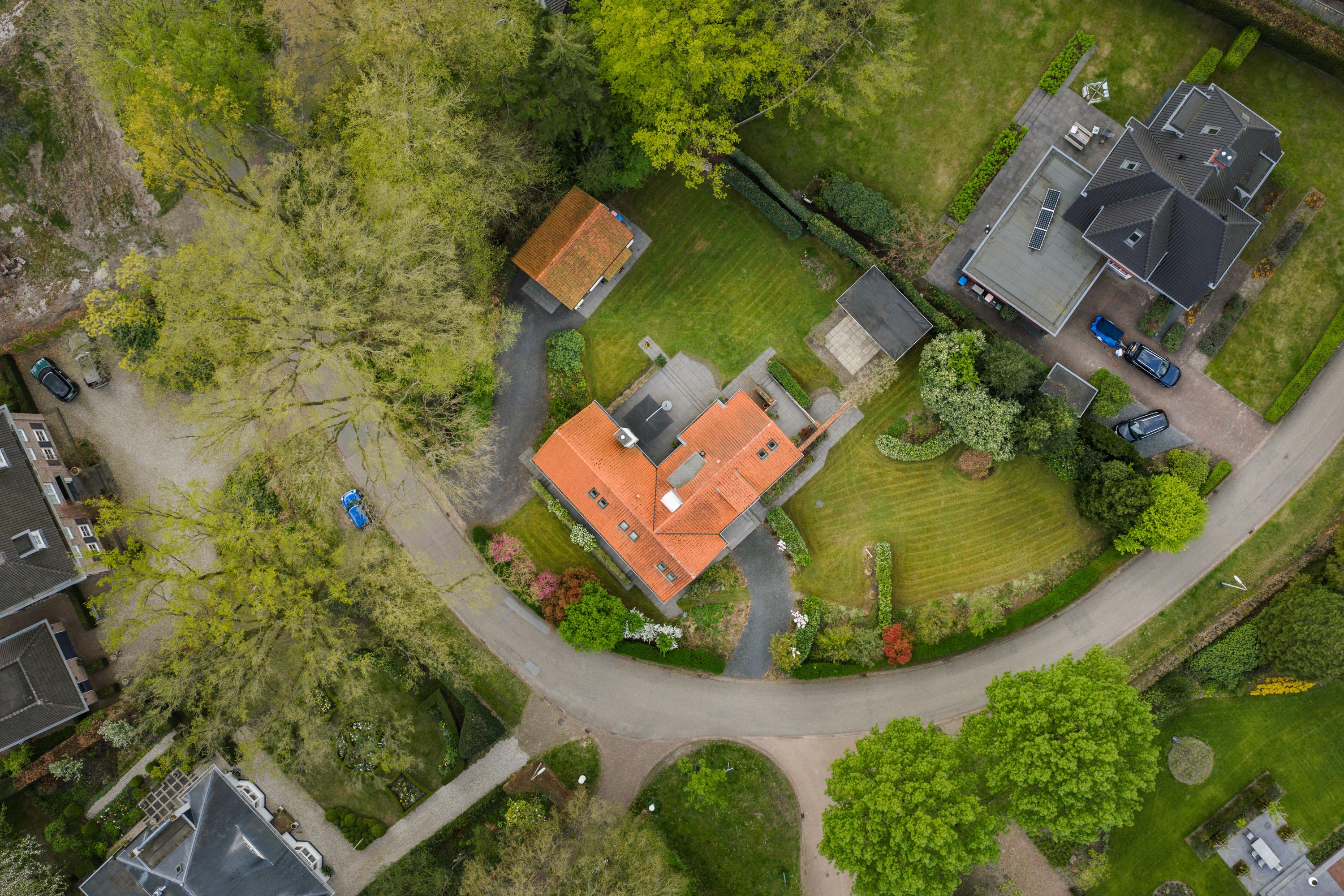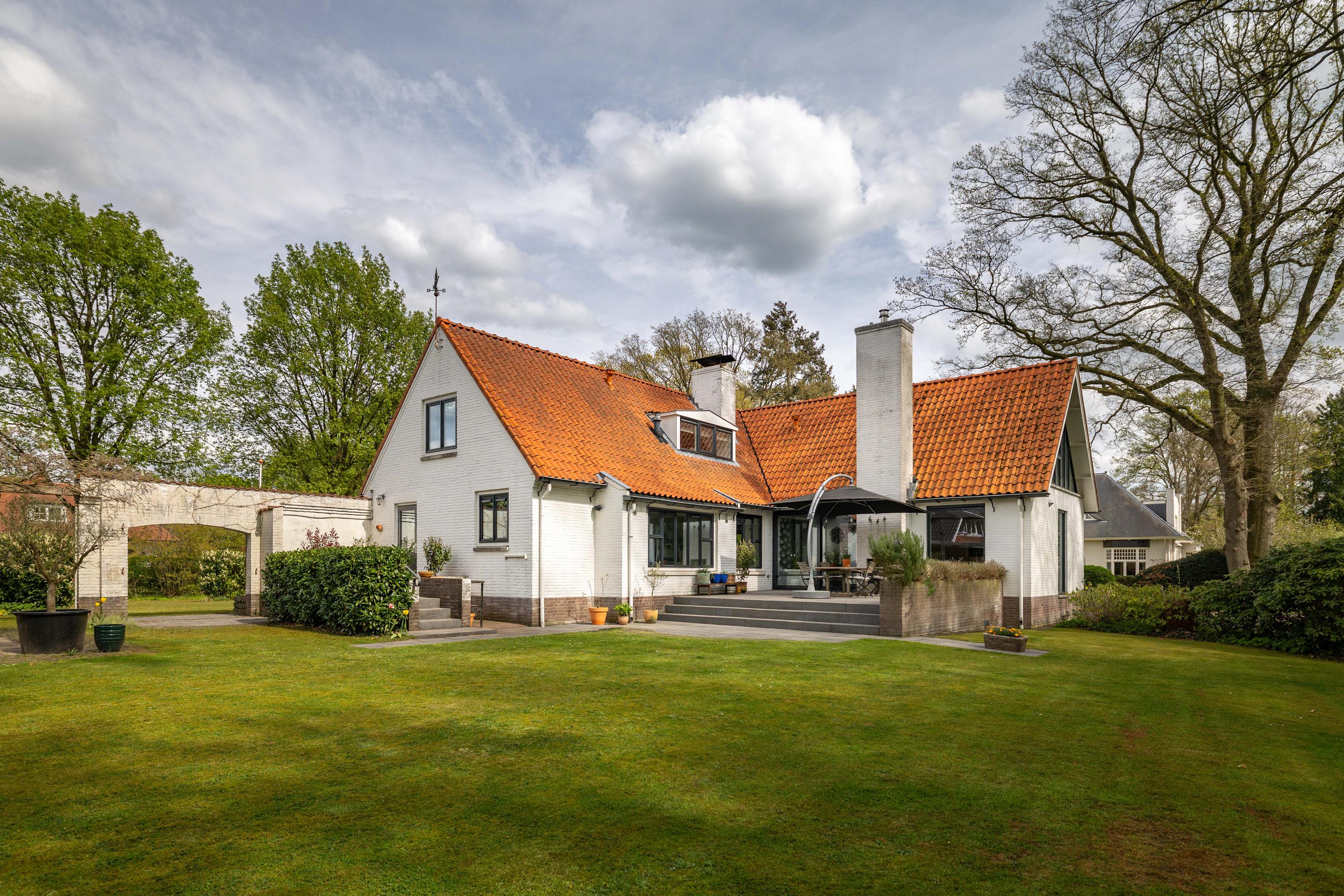 At the rear of the house lies a wonderful garden with expansive lawns, large laurel hedges, beautifully landscaped borders and attractive terraces. One terrace behind the kitchen features a charming outdoor fireplace, providing a delightful setting for long summer evenings with family and friends. There is also a cosy veranda with a large terrace and ample space for a lounge set.