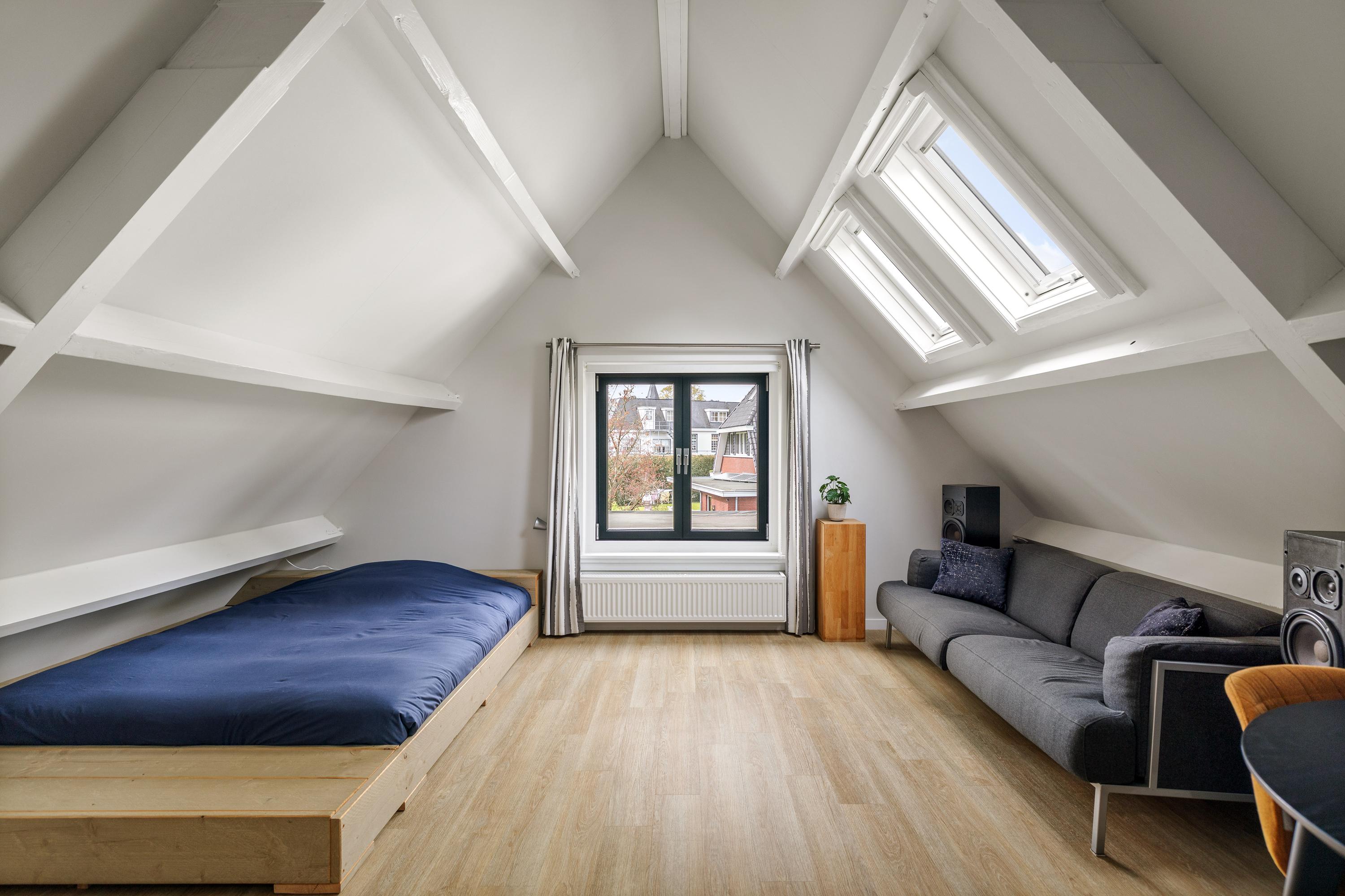 Space is in abundance, as the property sits on a generous plot of approximately 1,755 m². At the front is a charming garden with a characteristic semi-circular driveway. Beside the house stands a spacious, detached brick garage with cavity walls and an upper floor—ideal for parking a classic car, storing bicycles and accommodating a workbench. The upper level offers excellent potential for creating an artist’s studio or hobby space.