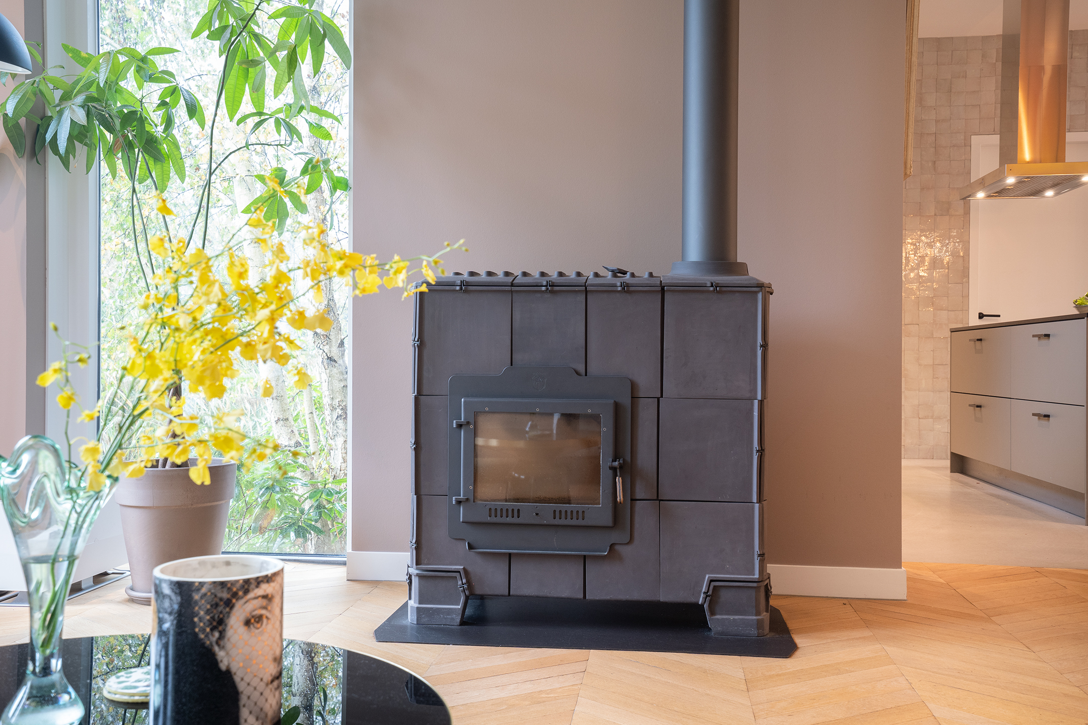 - Designer concrete floor and herringbone flooring on the ground floor