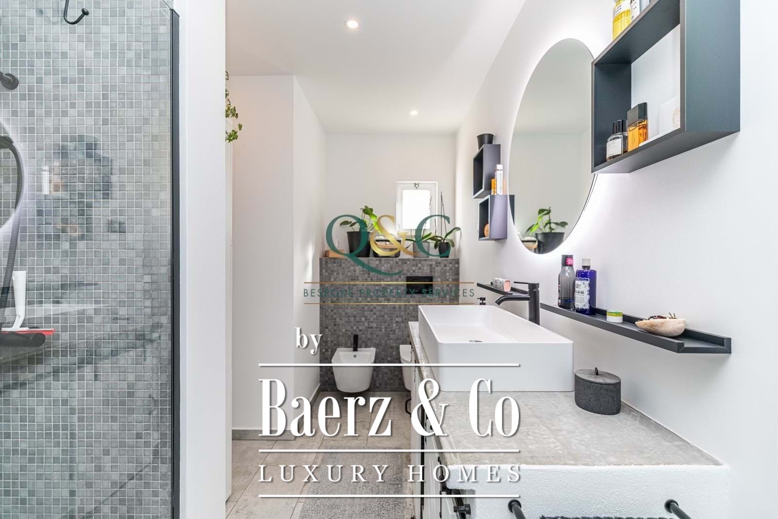 Built in 2009 to Swiss SIA technical standards and recently enhanced, the villa provides 414 m² of immaculate living space across two levels. Arriving through a gated entrance, guests are met with a sense of discretion and secure privacy. The main floor features an entrance hall, two generous en-suite bedrooms, a contemporary open-plan living and dining area with pellet stove, and a modern kitchen opening directly onto a southwest-facing terrace with pergola. New floor-to-ceiling glazing in the conservatory frames panoramic coastline views, while the swimming pool and terrace below offer seamless outdoor living.
