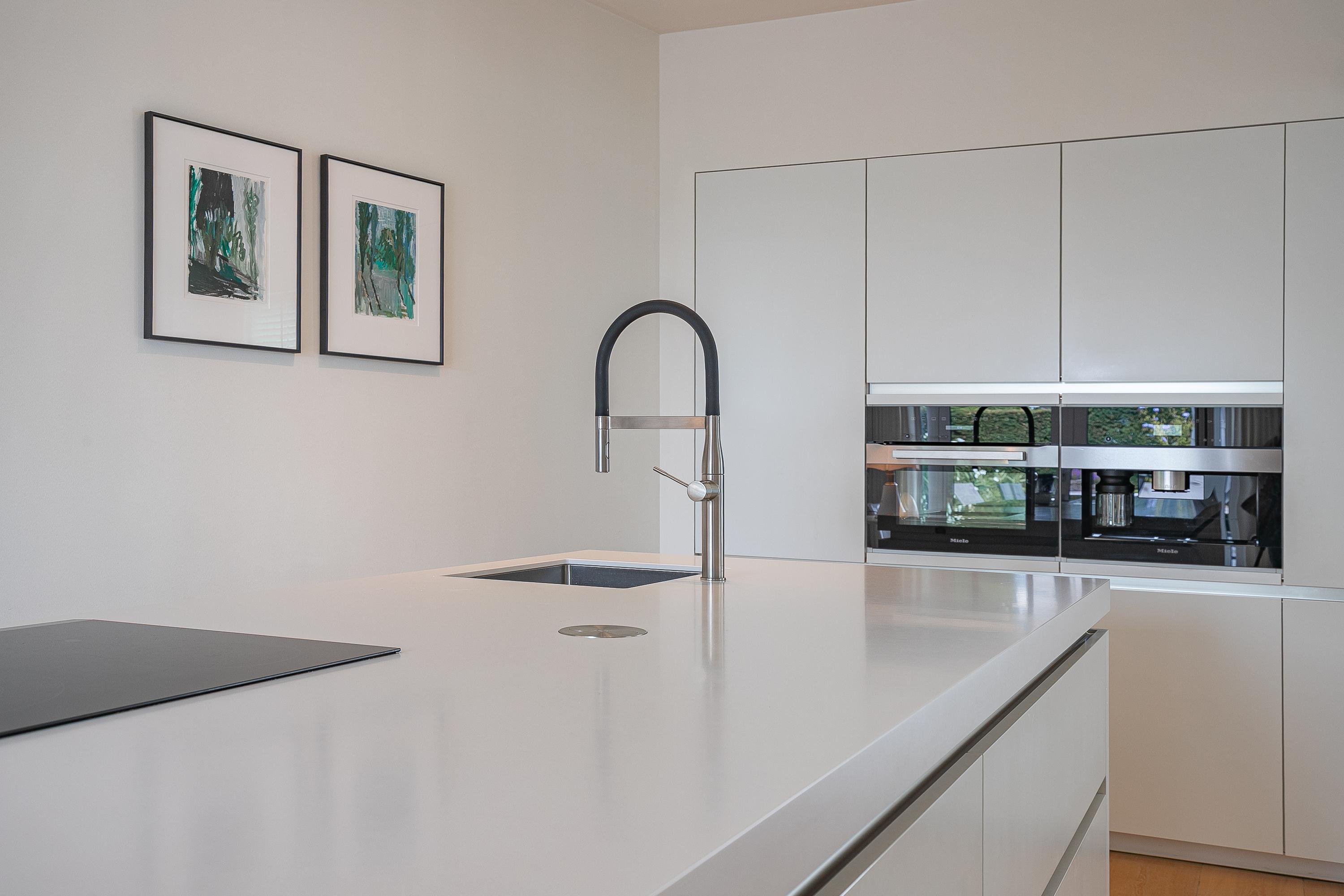 The open kitchen with large cooking island has a luxurious, handle-free design and is equipped with high-quality built-in appliances: a 5-zone induction hob, ceiling extractor, dishwasher, fully automatic coffee machine, convection oven, refrigerator and sink.