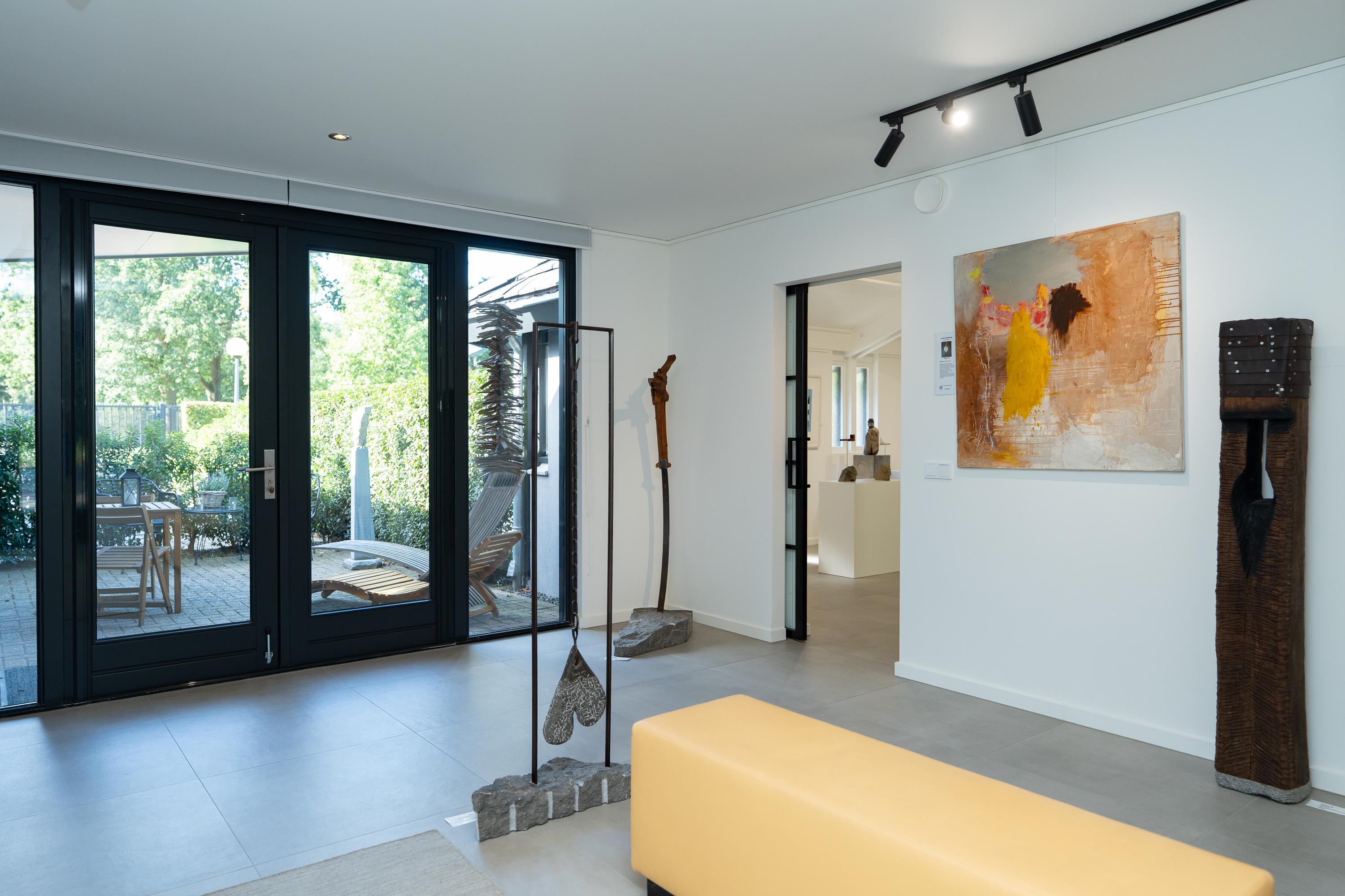 Within 381 m² of living area, the home unfolds over a single level, inviting a tranquil pace of life amidst a landscaped plot of 1,500 m². Broad glass expanses bring natural light into the living room with its high ceiling, and sliding doors connect seamlessly to terraced gardens. Three bedrooms, including a master suite with walk-in closet and spa bathroom—comprising a freestanding bathtub, combination sauna, and garden outlook—offer discretion and comfort. An additional studio, with separate entrance, kitchen, and bathroom, and a versatile office or hobby space amplify the sense of independence and flexibility.