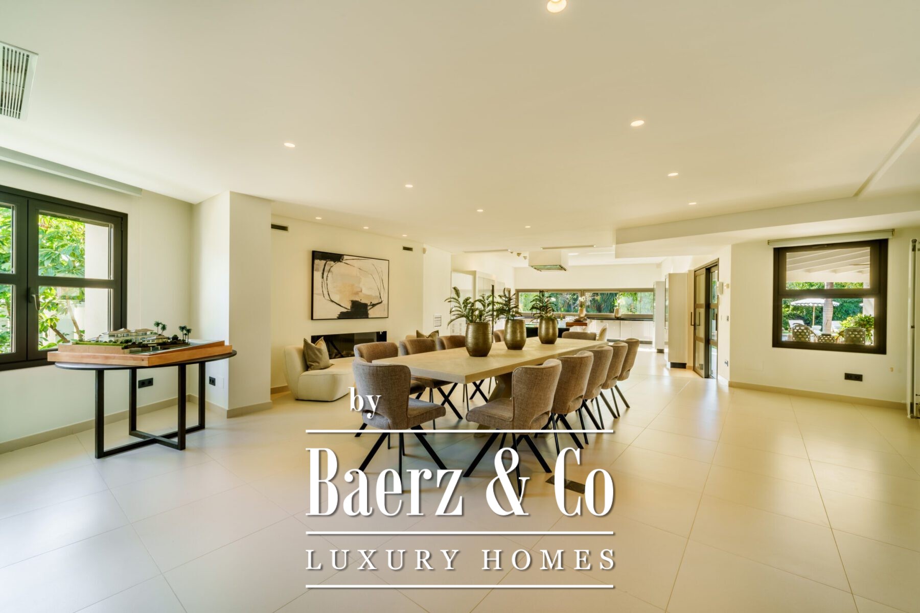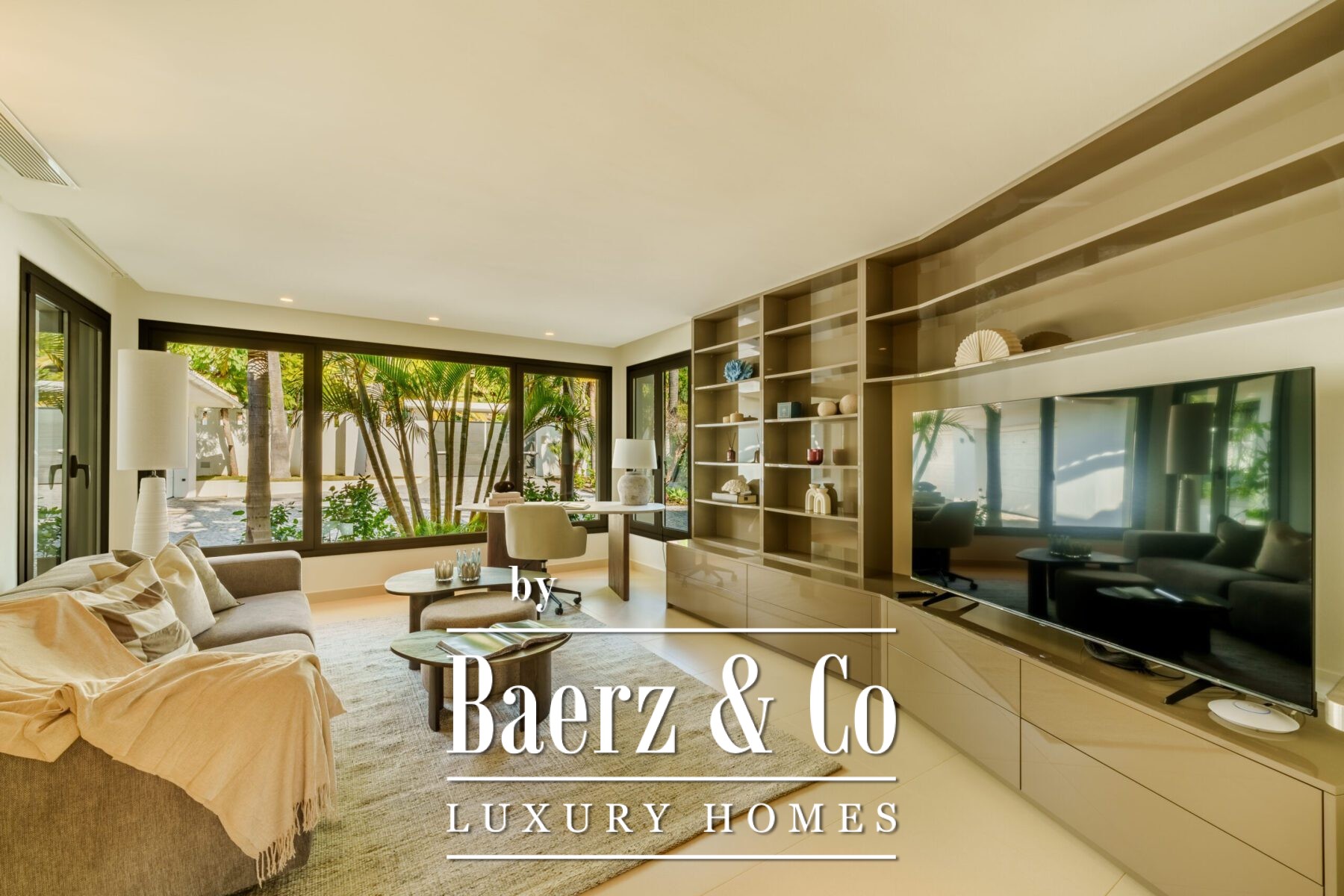 Lush landscaping by a renowned firm creates a sense of privacy and place, with century-old ficus trees, Washingtonia robusta palms, jacarandas in bloom, agave, hibiscus, and other sculptural plantings creating a private sanctuary. Discreet security and comfort details include Technal windows, Lutron lighting, air conditioning, alarm, water tank, and a four-car garage. Proximity to championship golf courses, the Mediterranean coastline, and Marbella’s upscale amenities combine to situate this luxury villa for sale in Marbella as a quiet axis of natural beauty and refined living.