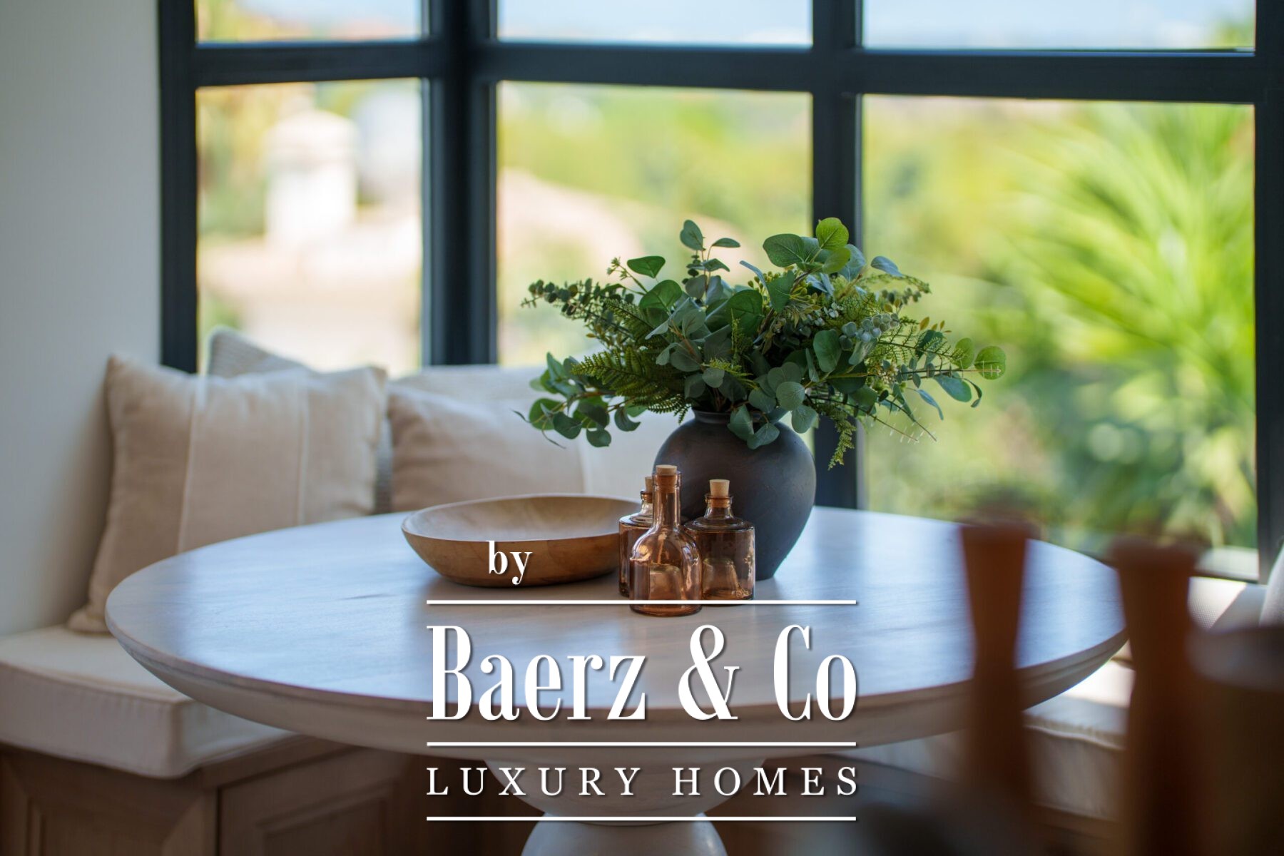 The interior design is a harmonious fusion of sophistication and warmth, combining neutral tones, natural textures, and bespoke furnishings to create a serene yet luxurious atmosphere. Handpicked décor pieces, artisanal lighting, and thoughtfully integrated shelving add character and charm, while large windows frame the captivating views and invite abundant daylight into every space. The result is a home that feels both contemporary and timeless, with a refined aesthetic that enhances its architectural beauty.