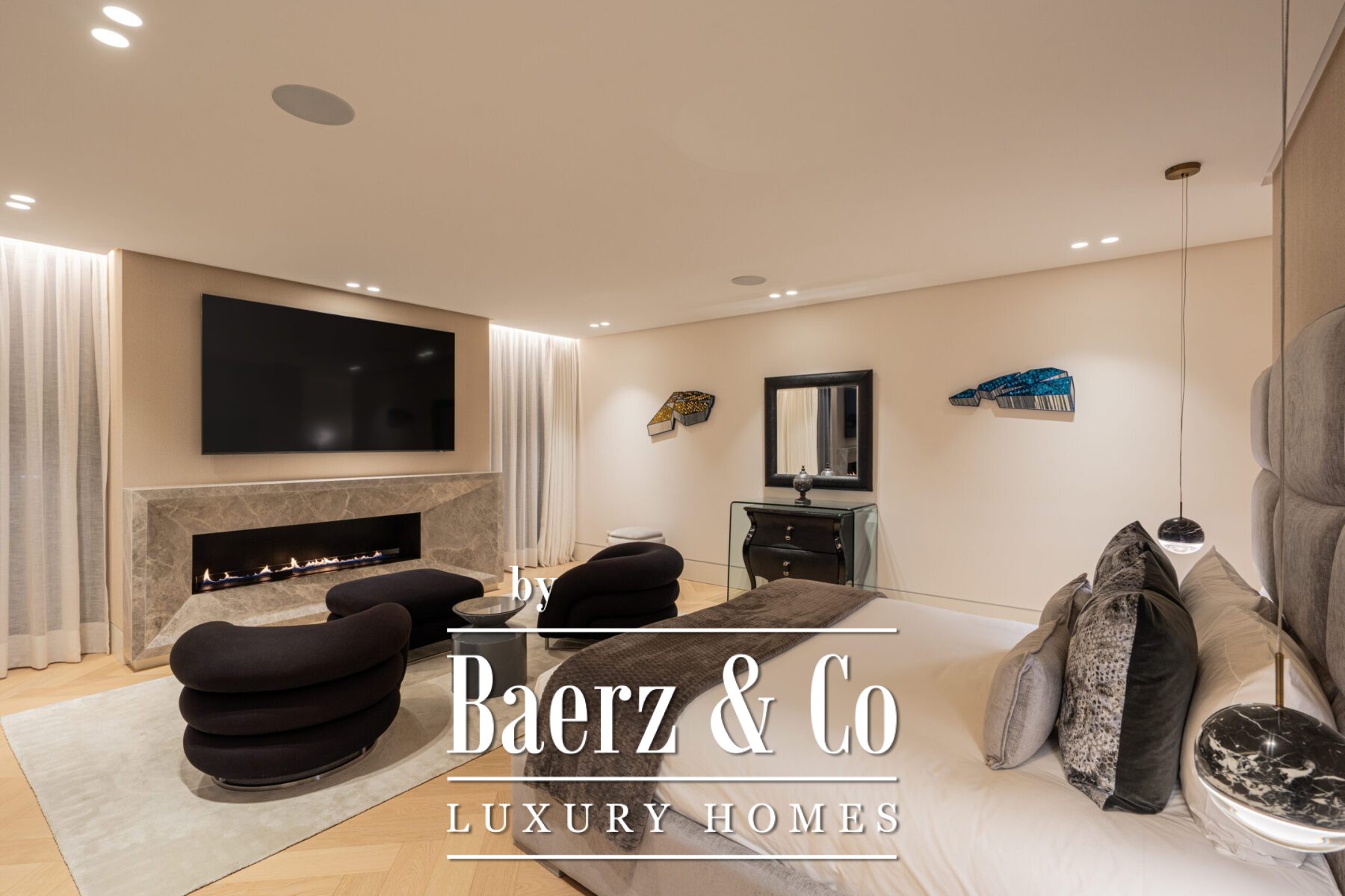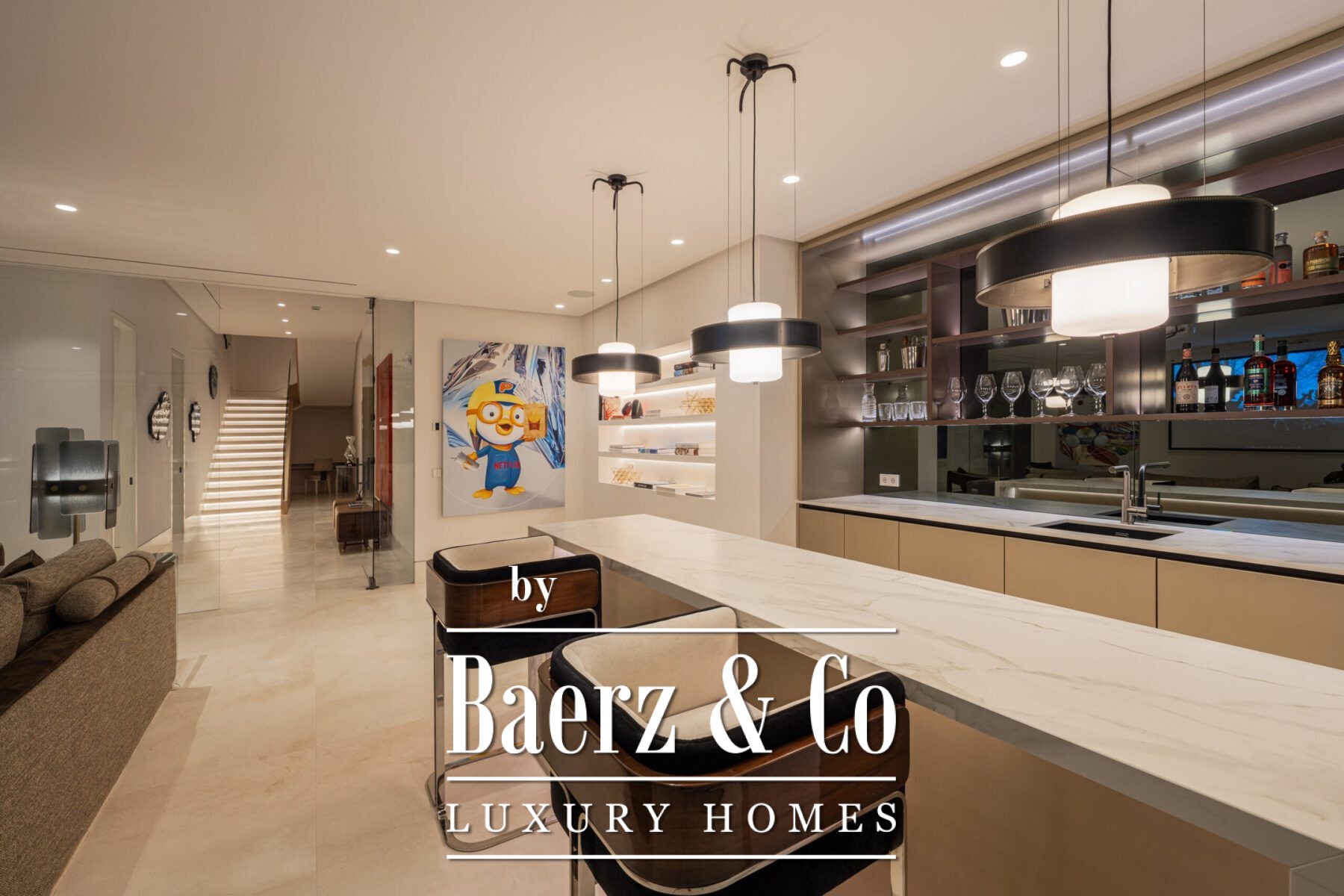 The open plan living area maintains cohesion and spatial clarity, letting natural light move unobstructed. Finer details and considered artwork provide every corner with a sense of distinction, while the kitchen, fitted with state-of-the-art appliances and a wine cooler, serves both daily ritual and social gathering. Five bedrooms and six bathrooms unfold with subtle grandeur, featuring double vanities, custom showers, and stand-alone bathtubs.