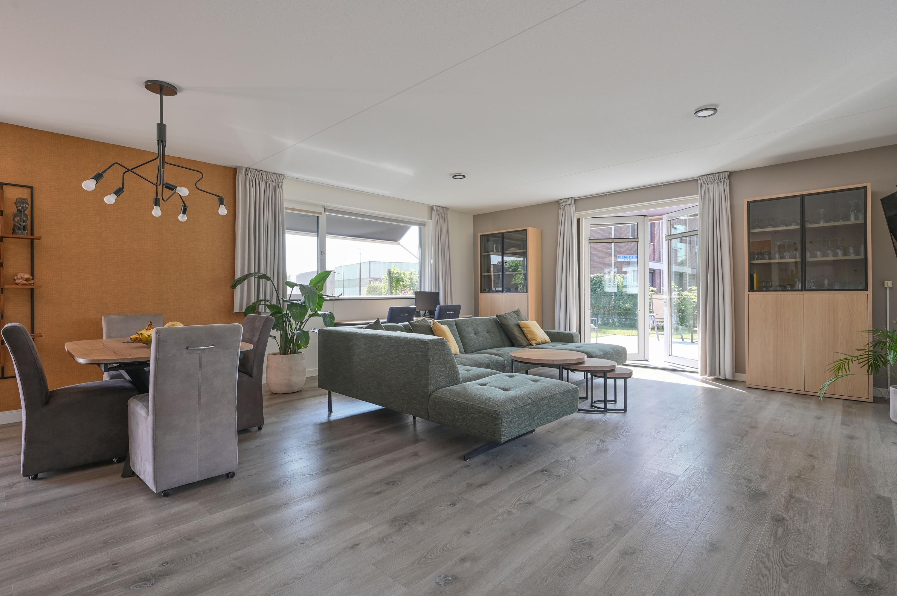 The spacious anthracite gravel driveway offers parking for two cars and includes a private charging station. From here you reach the stylish entrance of the villa. Inside, the generous hall with a large corner window immediately catches the eye, flooding the space with natural light. From the hall, you have access to various rooms and the staircase to the first floor.