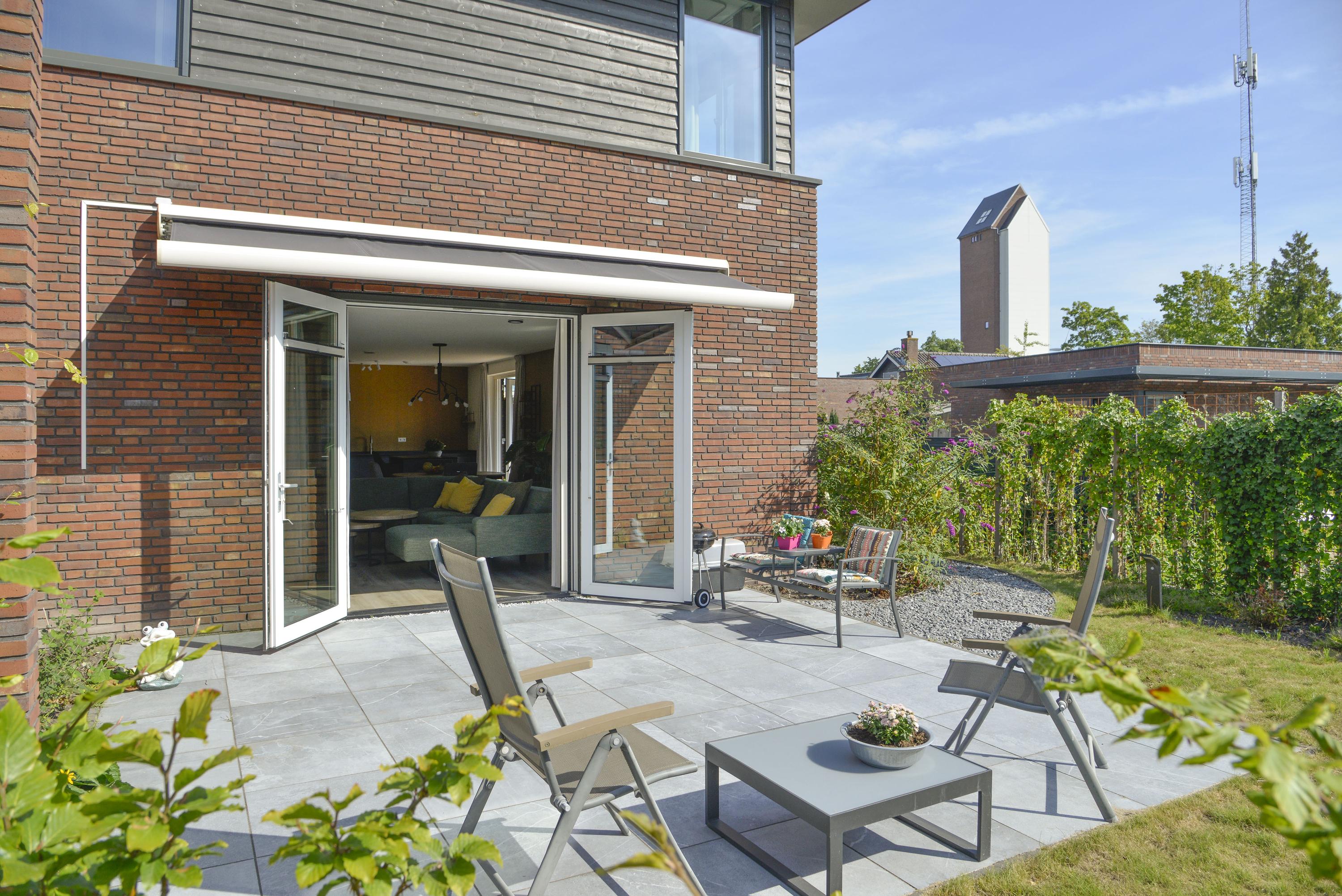 The path continues along the water, surrounded by greenery, to the sunny south-facing heart of the garden. Here you’ll find a spacious terrace by the living room, currently shaded by a retractable awning, with potential for a stylish veranda. Beyond stretches a well-kept lawn, framed by planting and a sleek beech hedge. Whether you want to relax, garden, or entertain guests, this garden has it all – with the added bonus of beautiful water views.