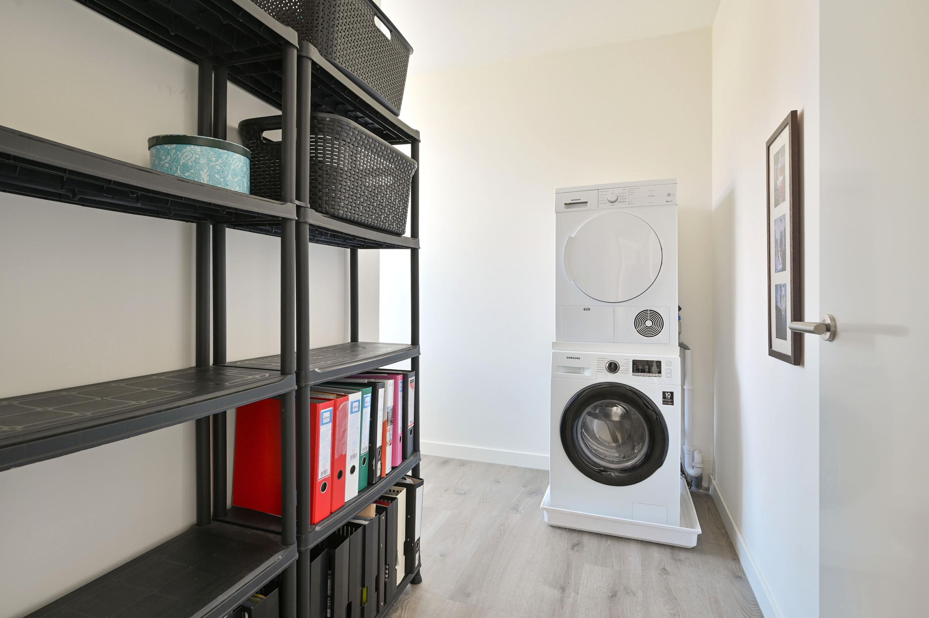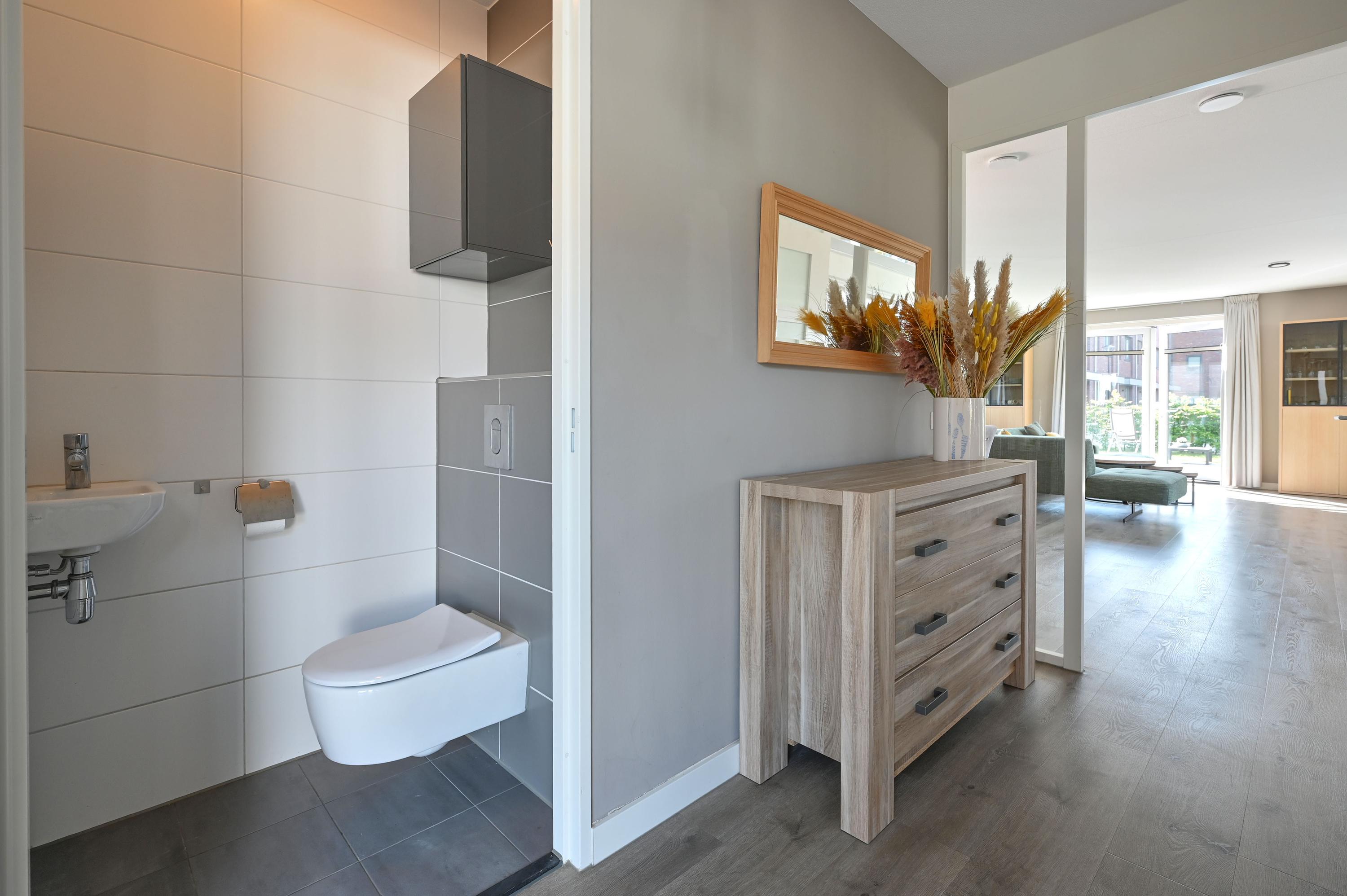 To the left of the entrance is a versatile room currently used as an office, also ideal as a hobby room or indoor storage. This room even has its own entrance from the front. Adjacent is the meter cupboard with fiber-optic connection, followed by a modern guest toilet in grey-white tones with wash basin. A practical storage closet sits under the stairs, with plenty of space for coats and shoes.