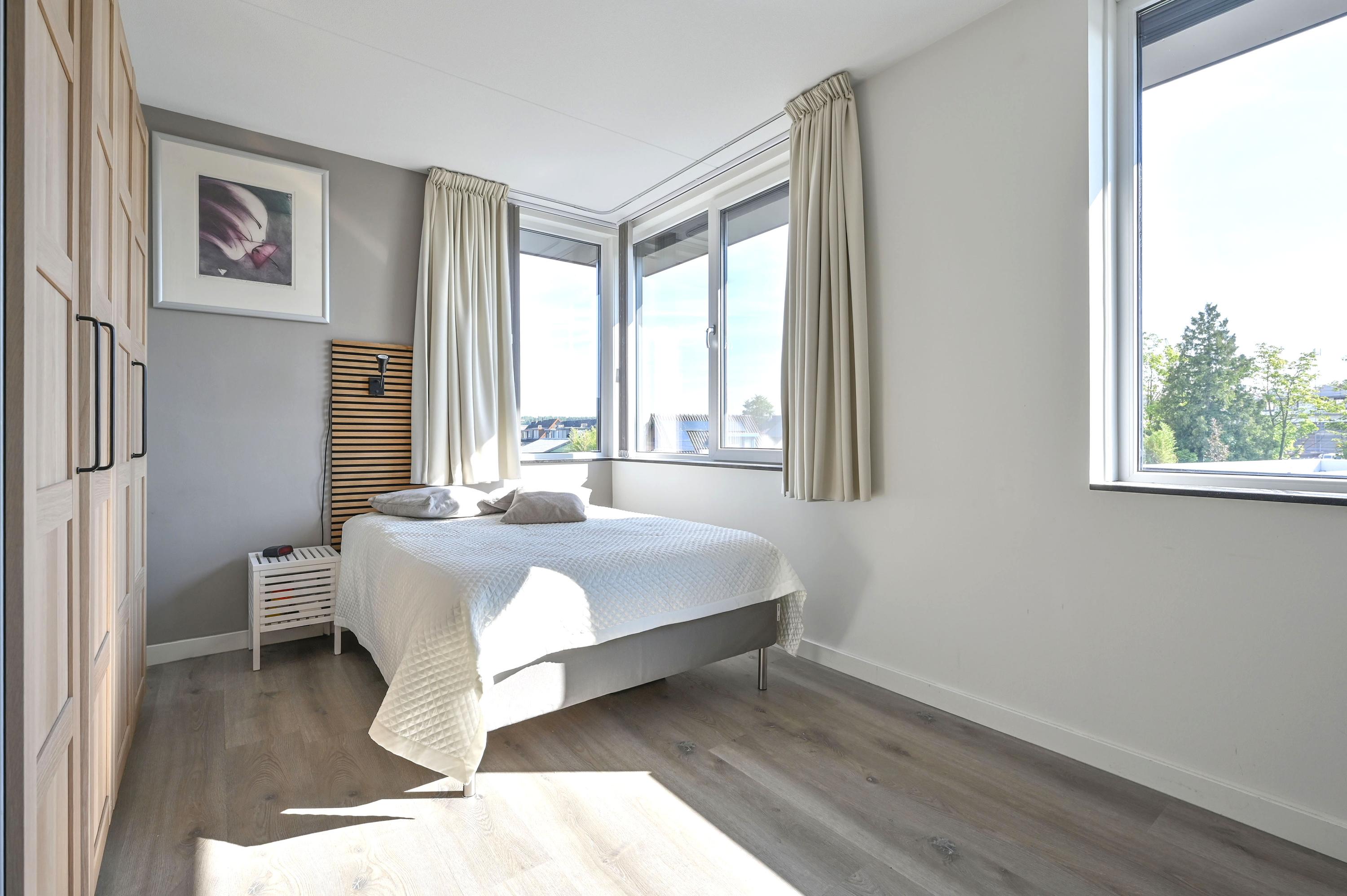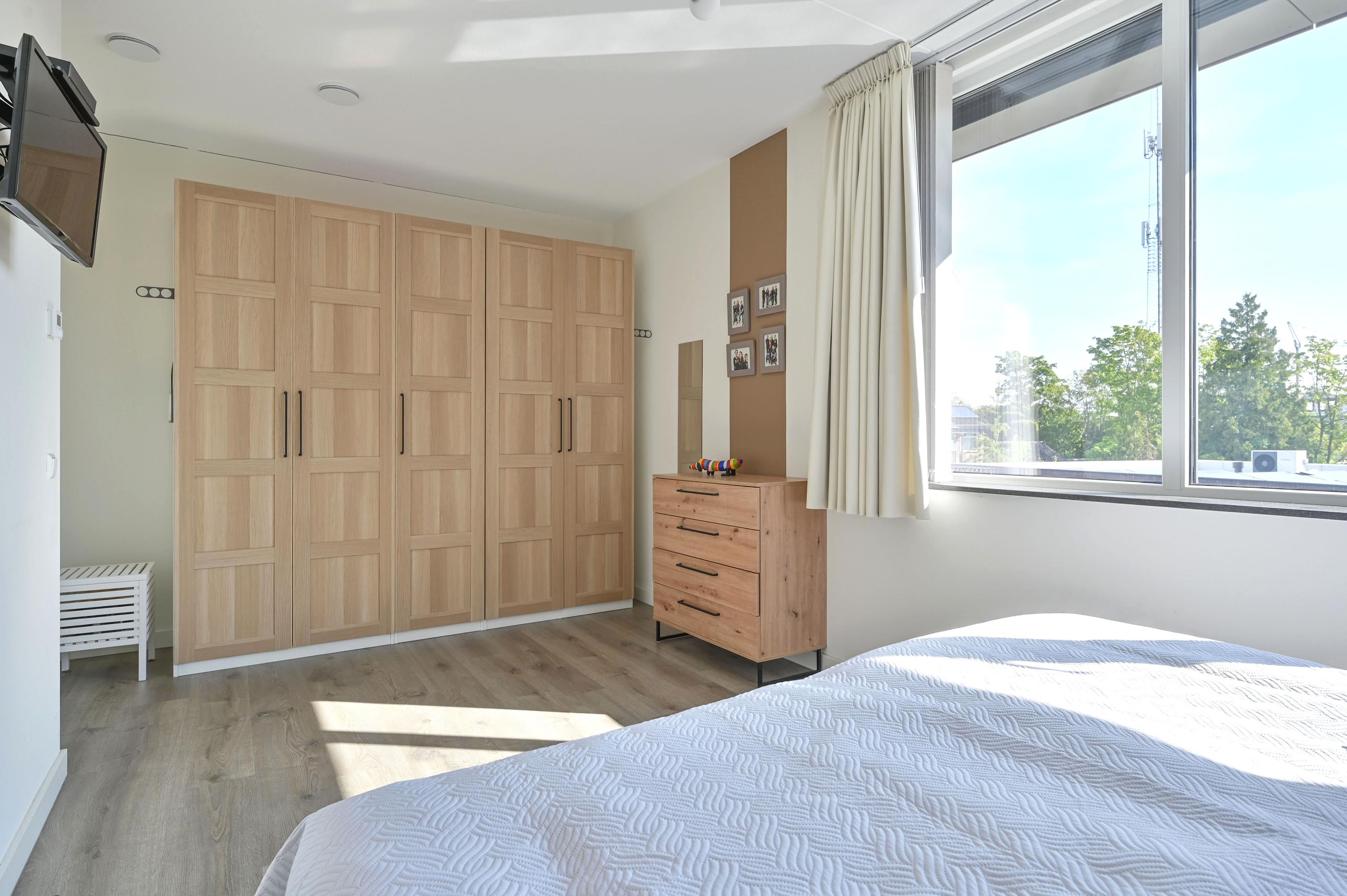 This floor also houses a technical room with heat pump, boiler, mechanical ventilation unit, and inverter for the 14 solar panels – along with additional storage space. At the end of the hallway are two more spacious bedrooms: the primary bedroom with a large corner window, and another generous room, currently used as an office.